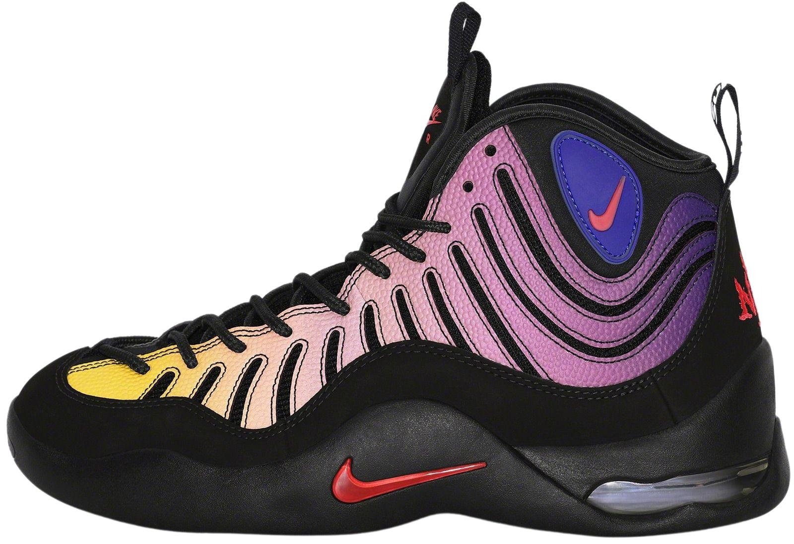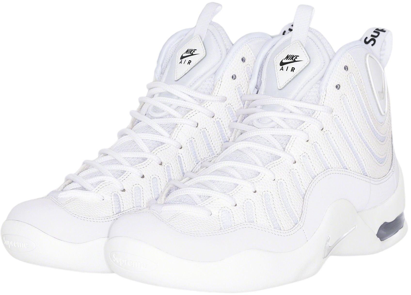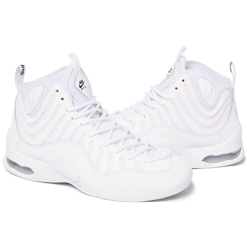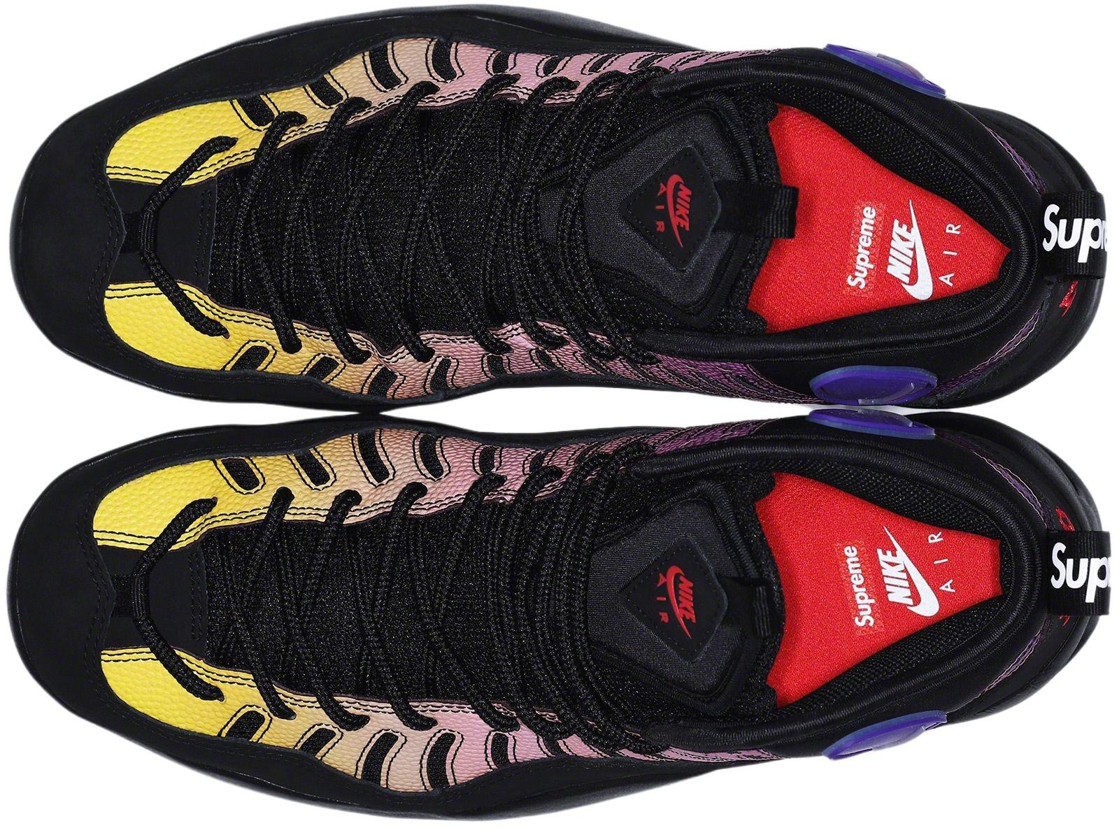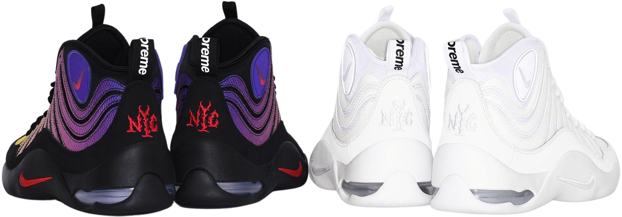 Synthetic pebbled leather upper with nubuck side panel and mesh underlay quarter panel. Rubber outsole with molded logo toe panel, visible heel airbag and inset swoosh on sidewall. Mesh tongue with molded logo panel. Co-branded footbed with mesh collar and tongue lining. Webbing loop at heel with high density printed logo. Rubber logo panel on collar and embroidered graphic at heel. Made exclusively for Supreme.