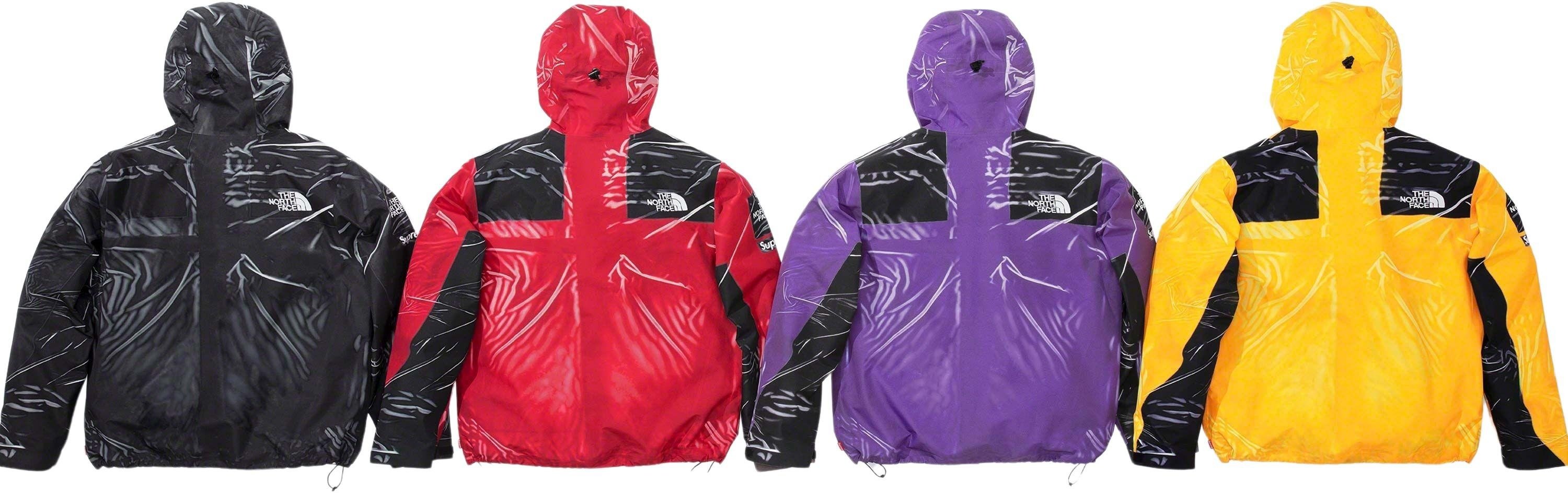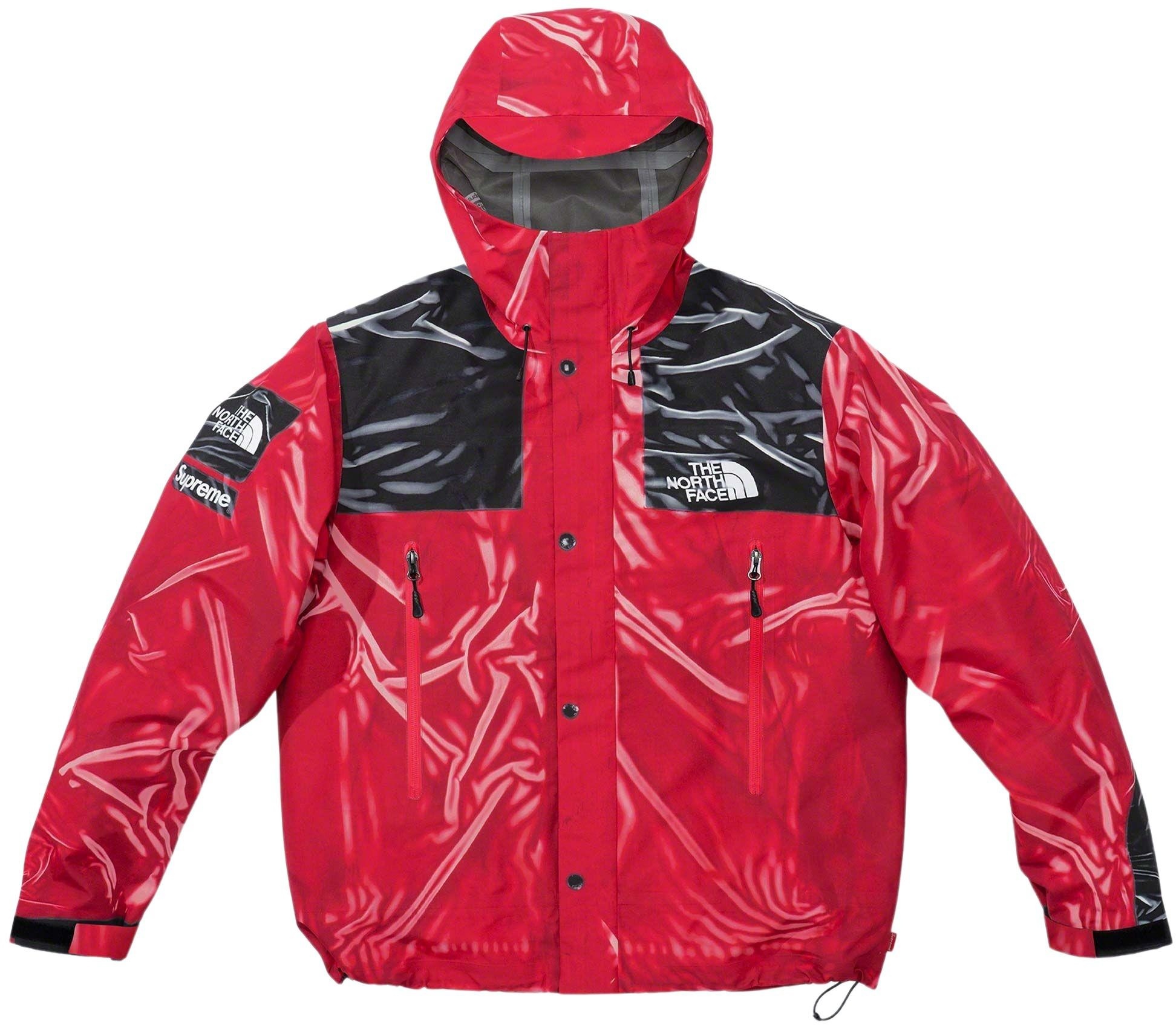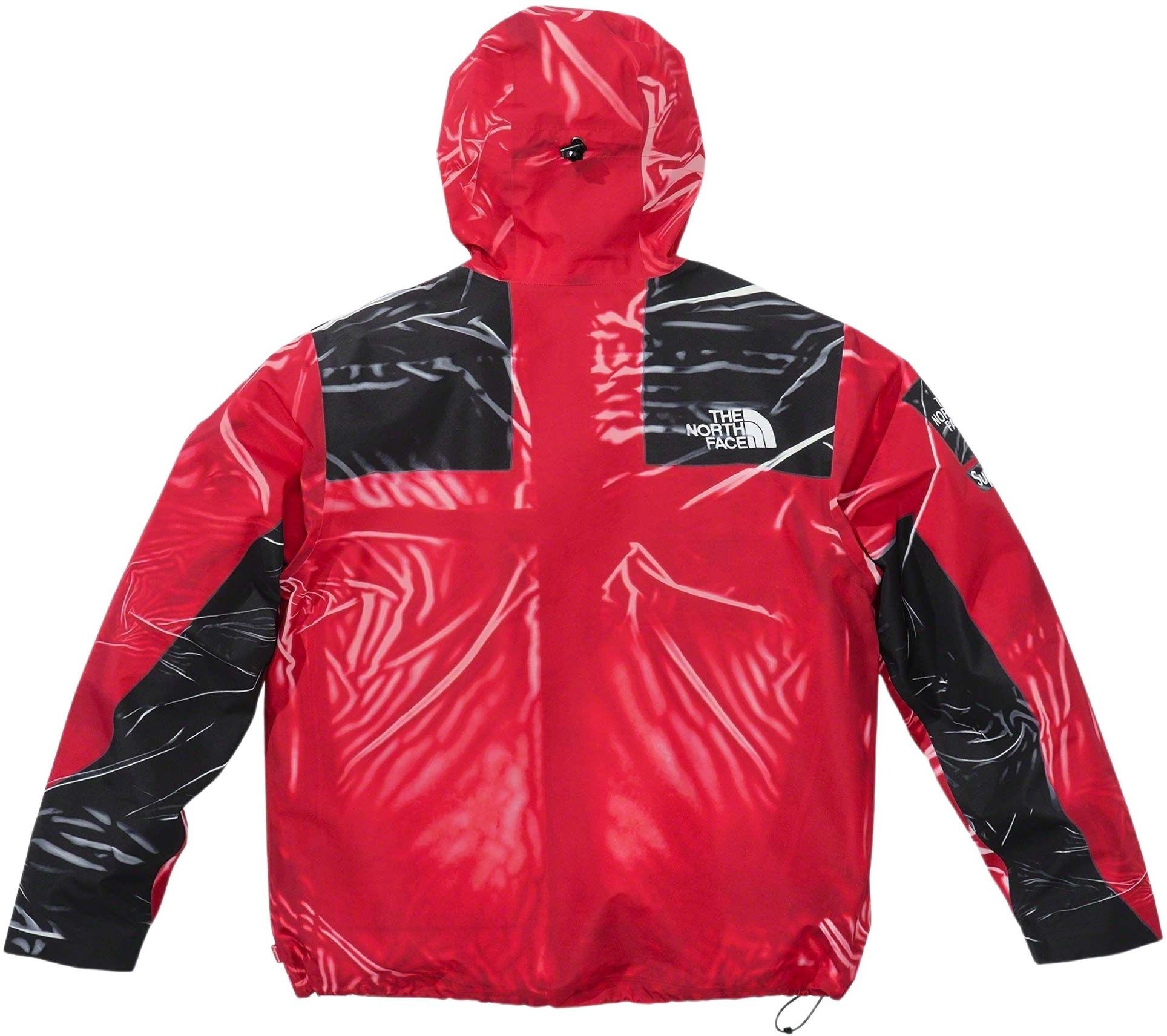 Water resistant recycled poly shell with trompe l’oeil printed graphic, taped seams and printed logo tricot backing. Full zip closure with velcro placket and Aquaguard zip Alpine pockets. Interior elastic shockcords at fixed hood and hem with velcro closures at cuffs. Printed logos on chest, back shoulder and sleeve. Made exclusively for Supreme.