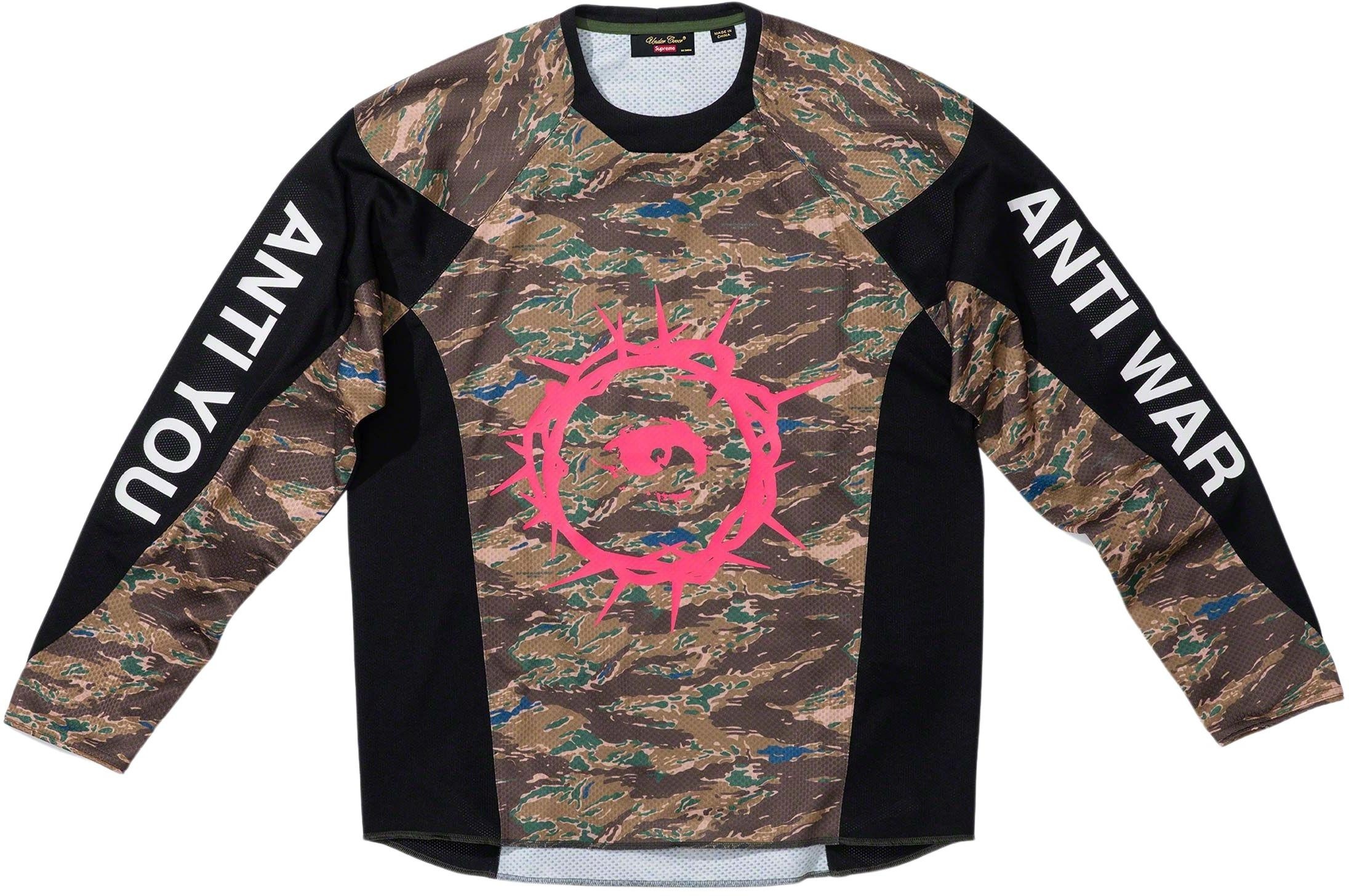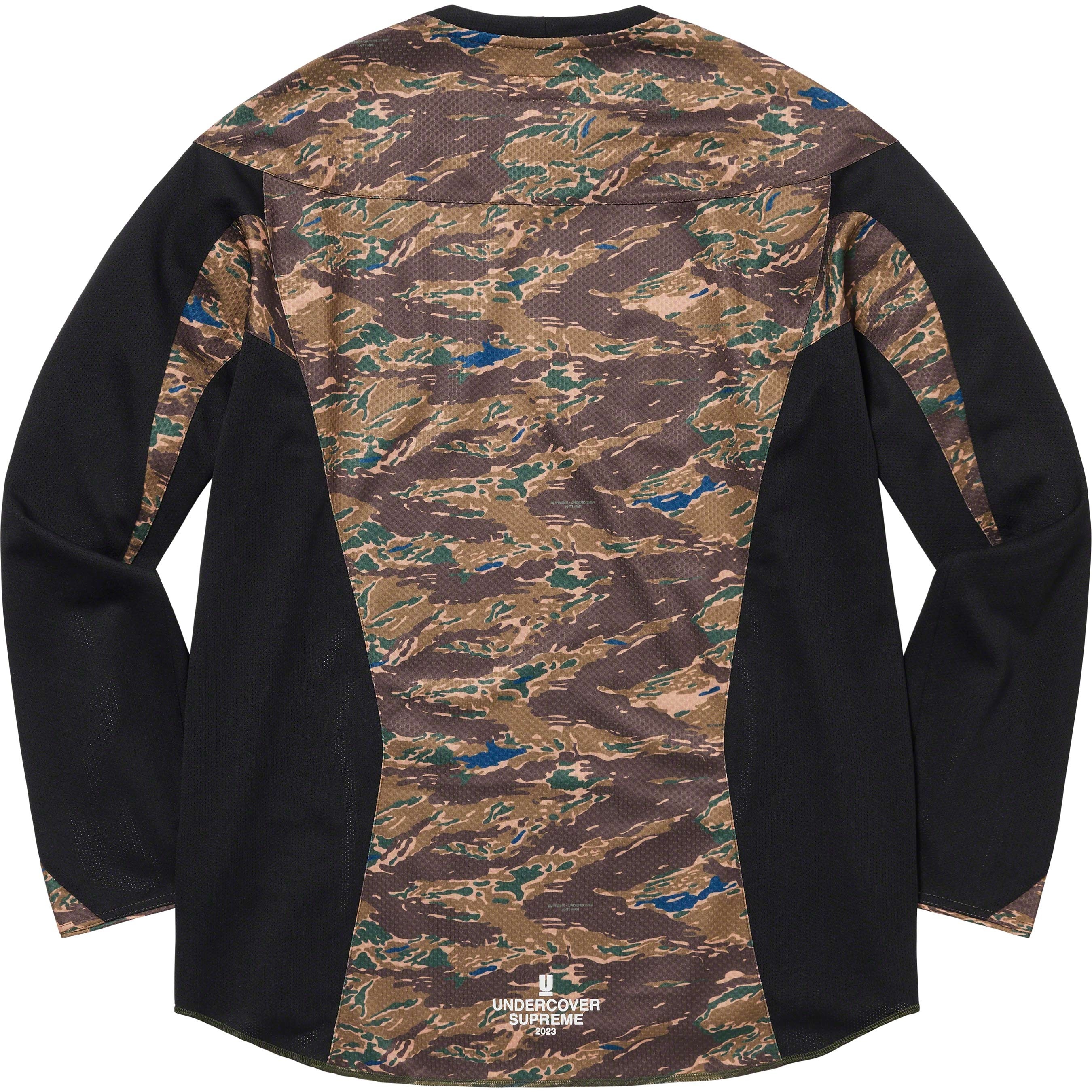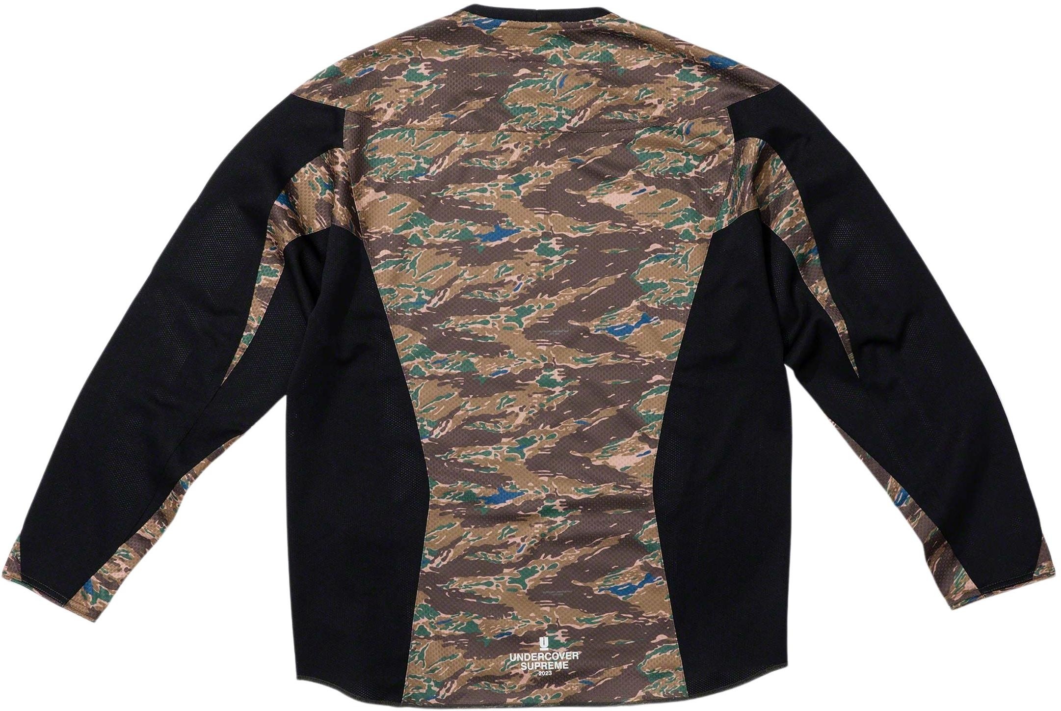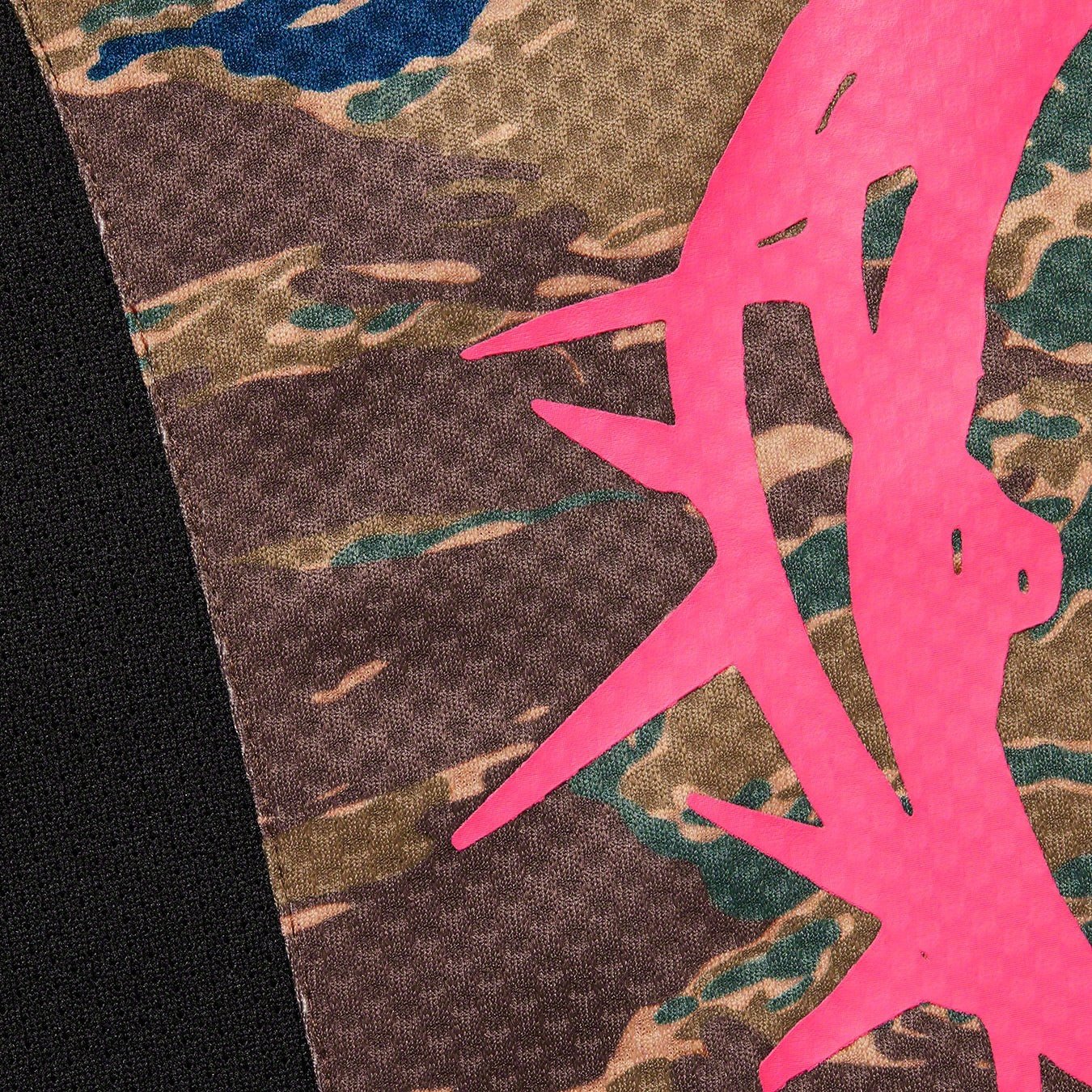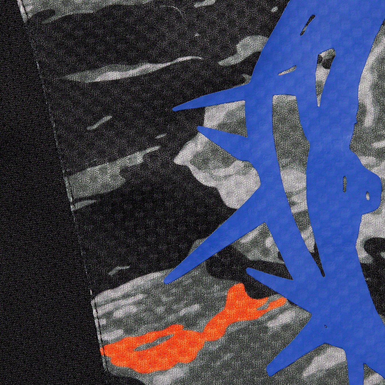 Poly mesh crewneck with printed graphics on chest and sleeves. Printed logos at back hem.