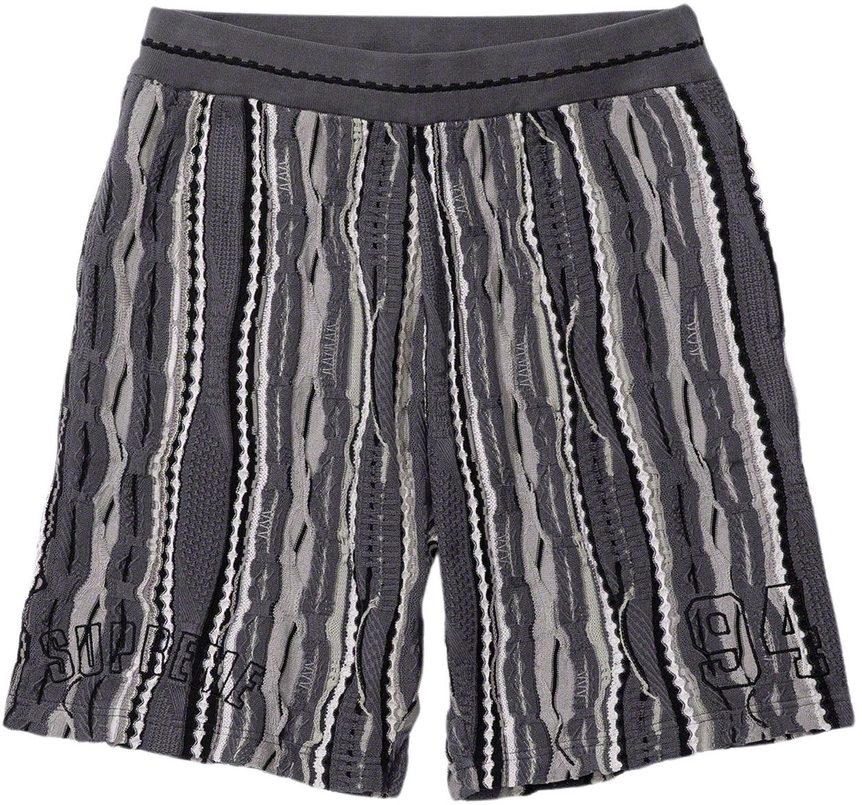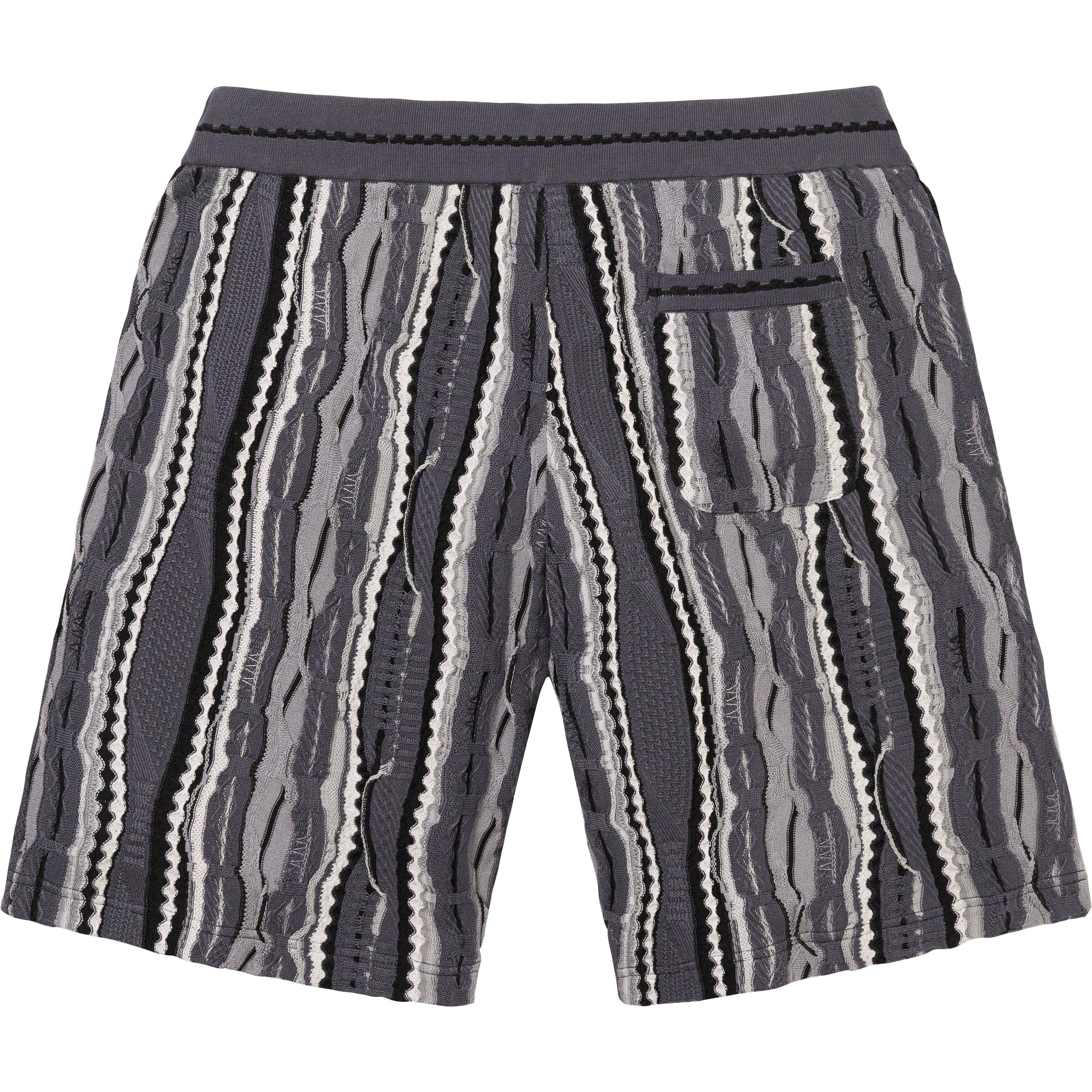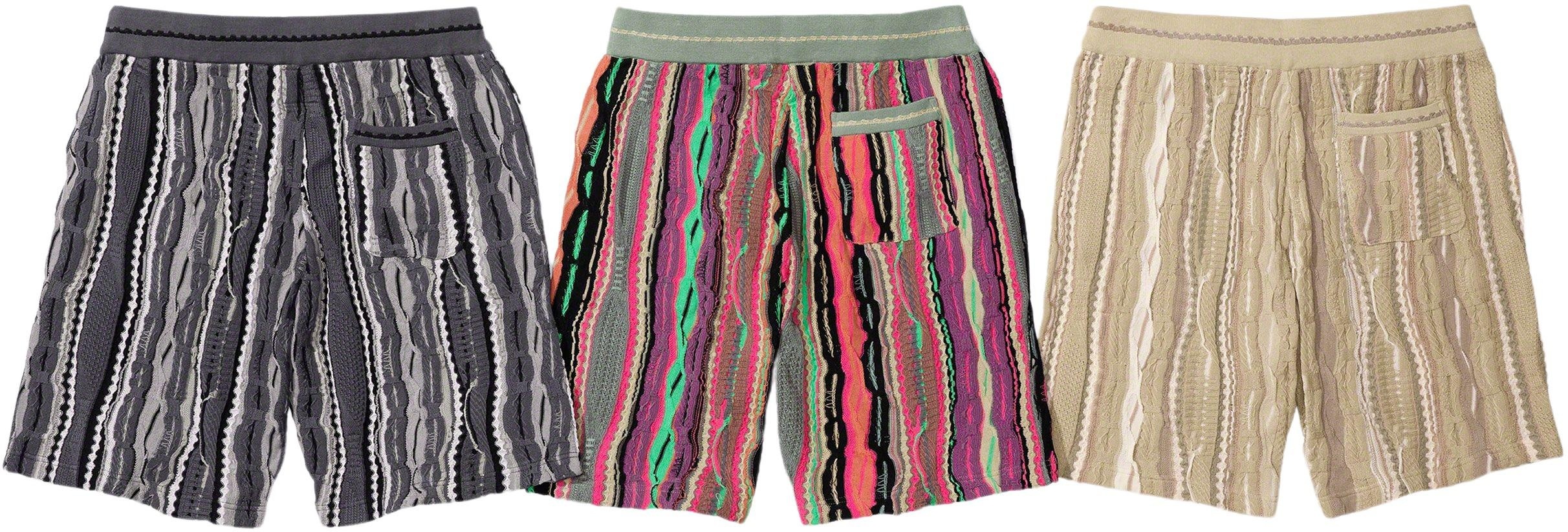 Coogi® knit cotton with on seam hand pockets and single back patch pocket. Knit rib waistband with interior drawcord. Logo and graphic appliqué thighs.