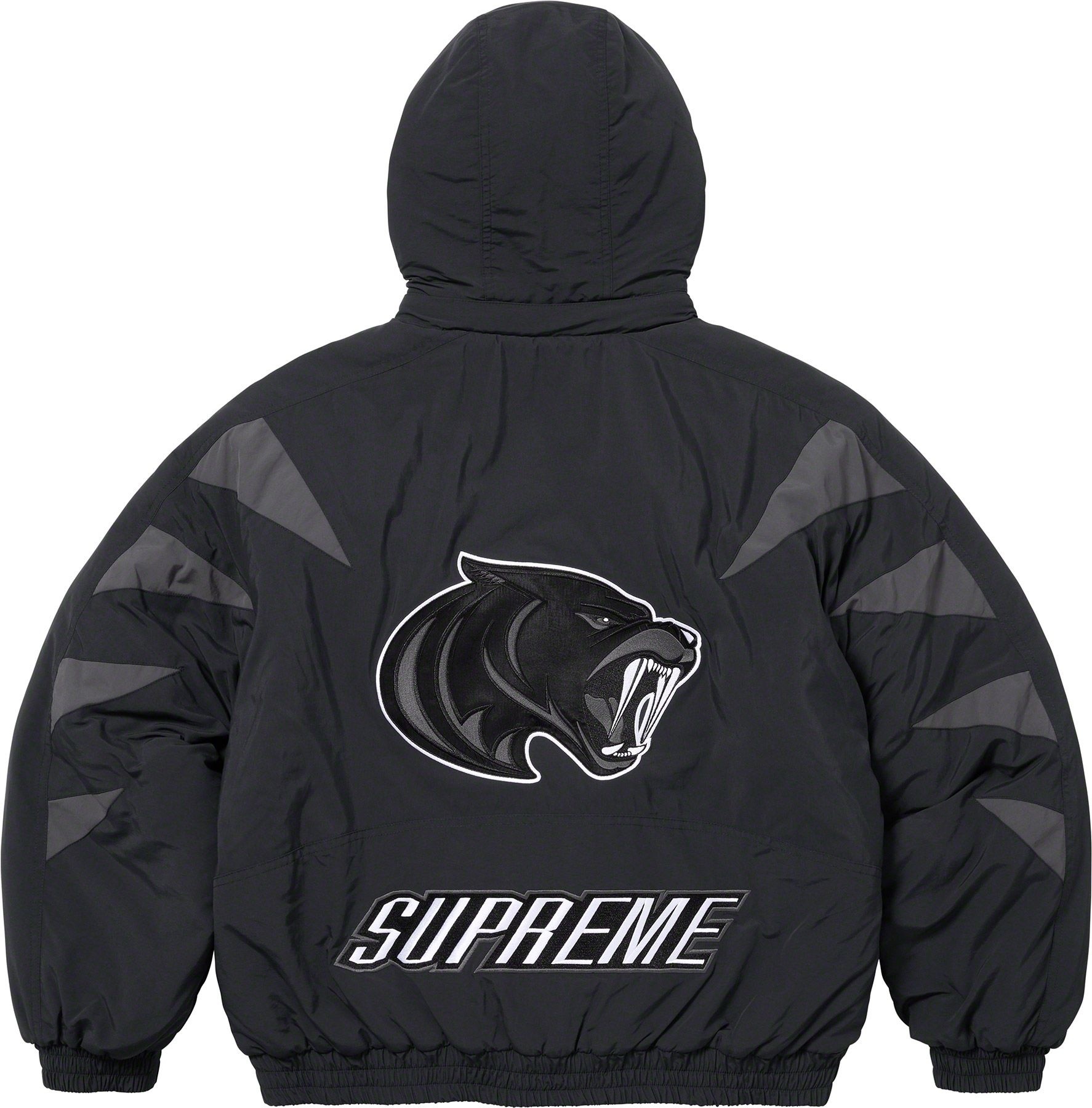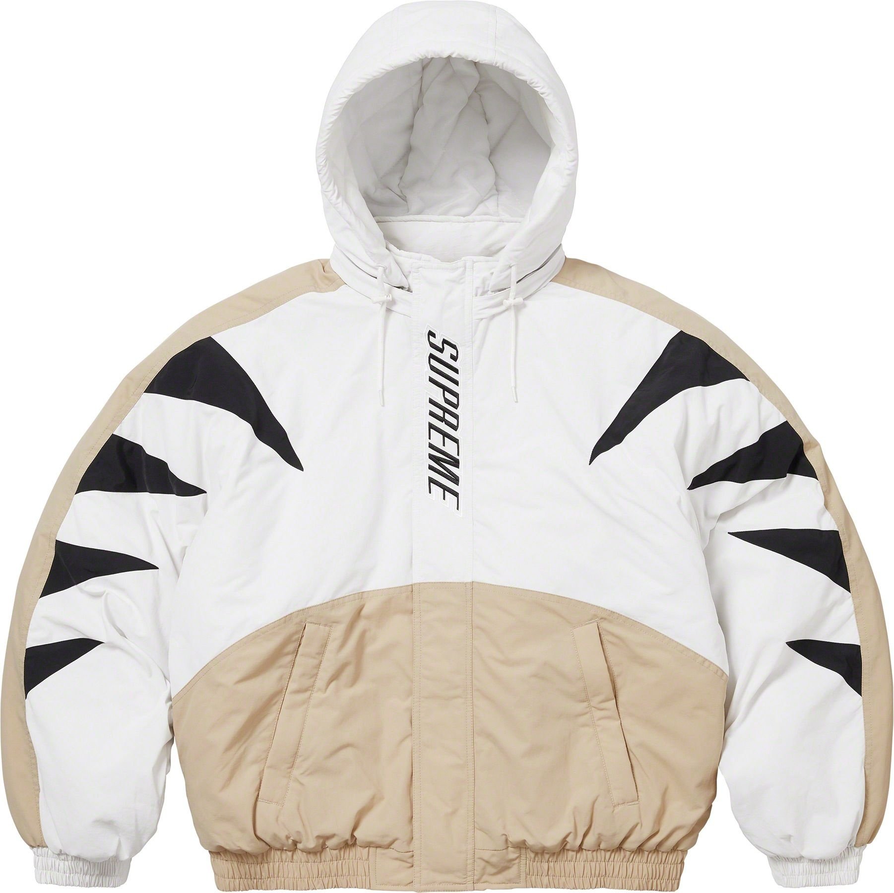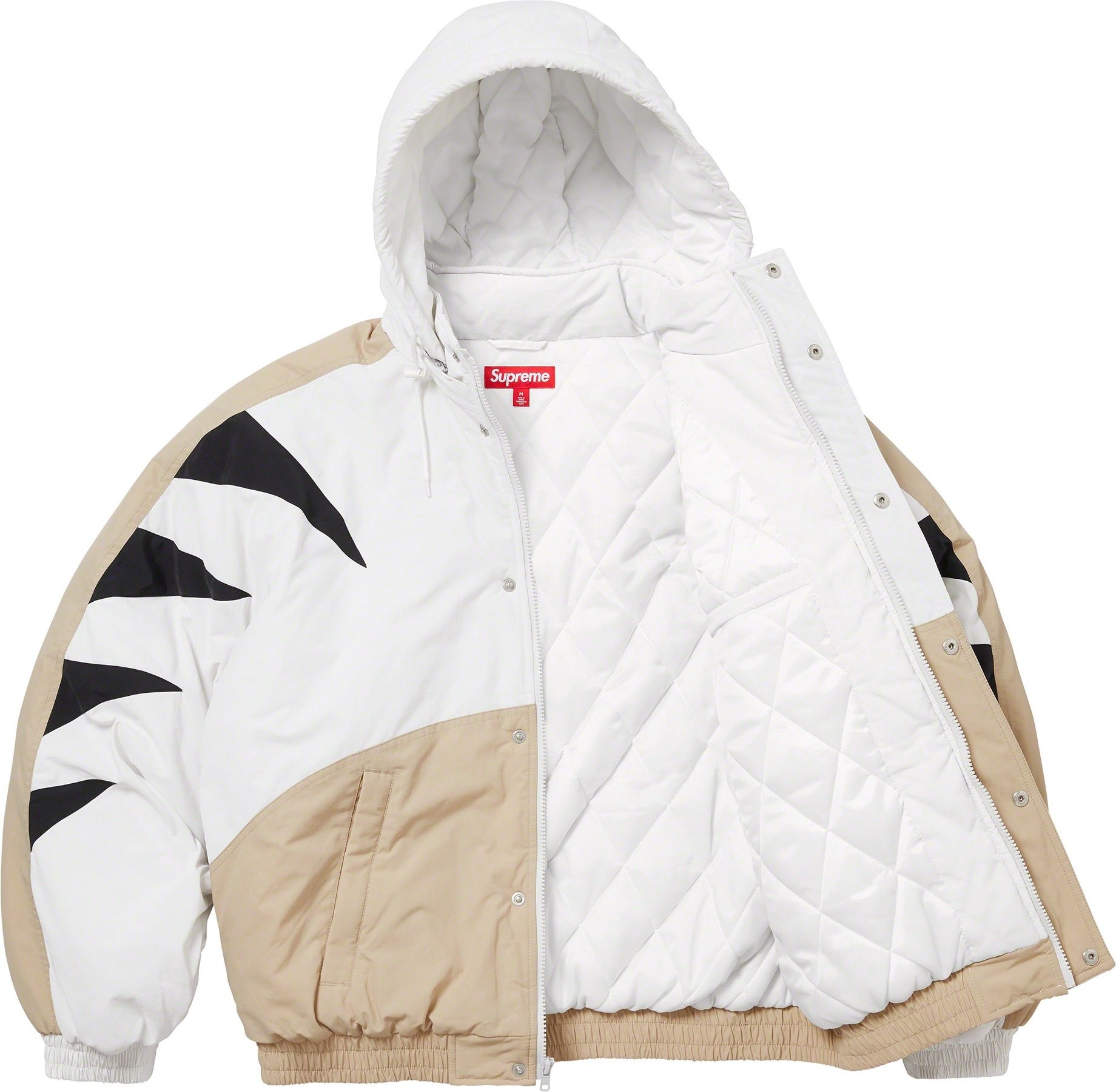 Water resistant Supplex® nylon taslan with fill and quilted taffeta lining. Full zip closure with hidden snap placket. Welt zip hand pockets at lower front and interior chest pocket. Removable hood with elastic cuffs and hem. Embroidered logos on placket and back with satin appliqué at back.