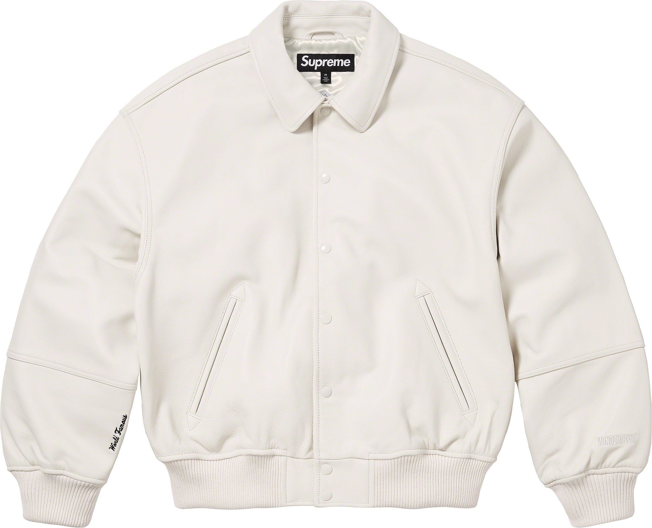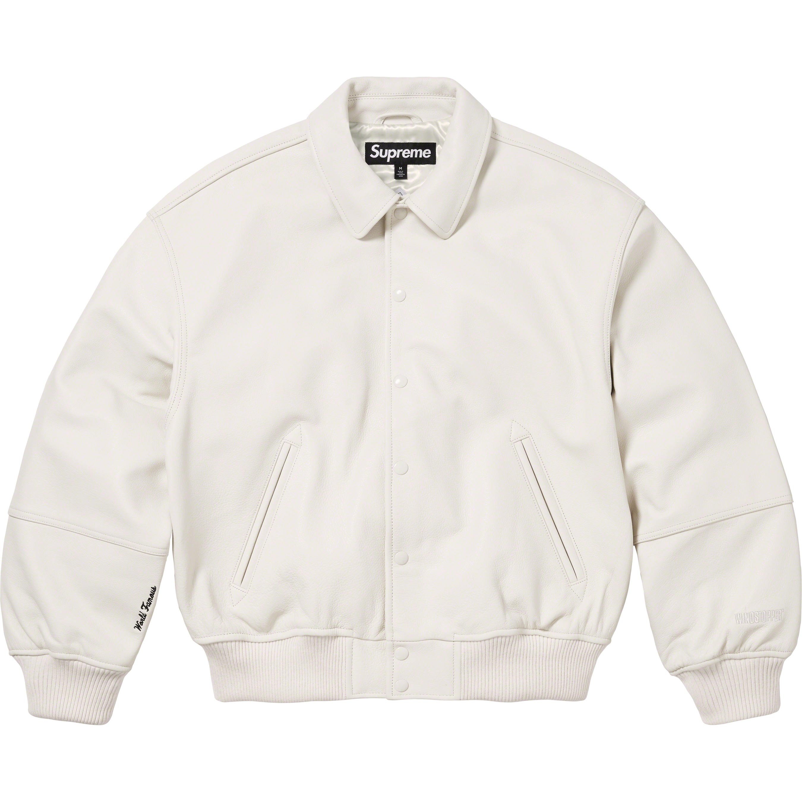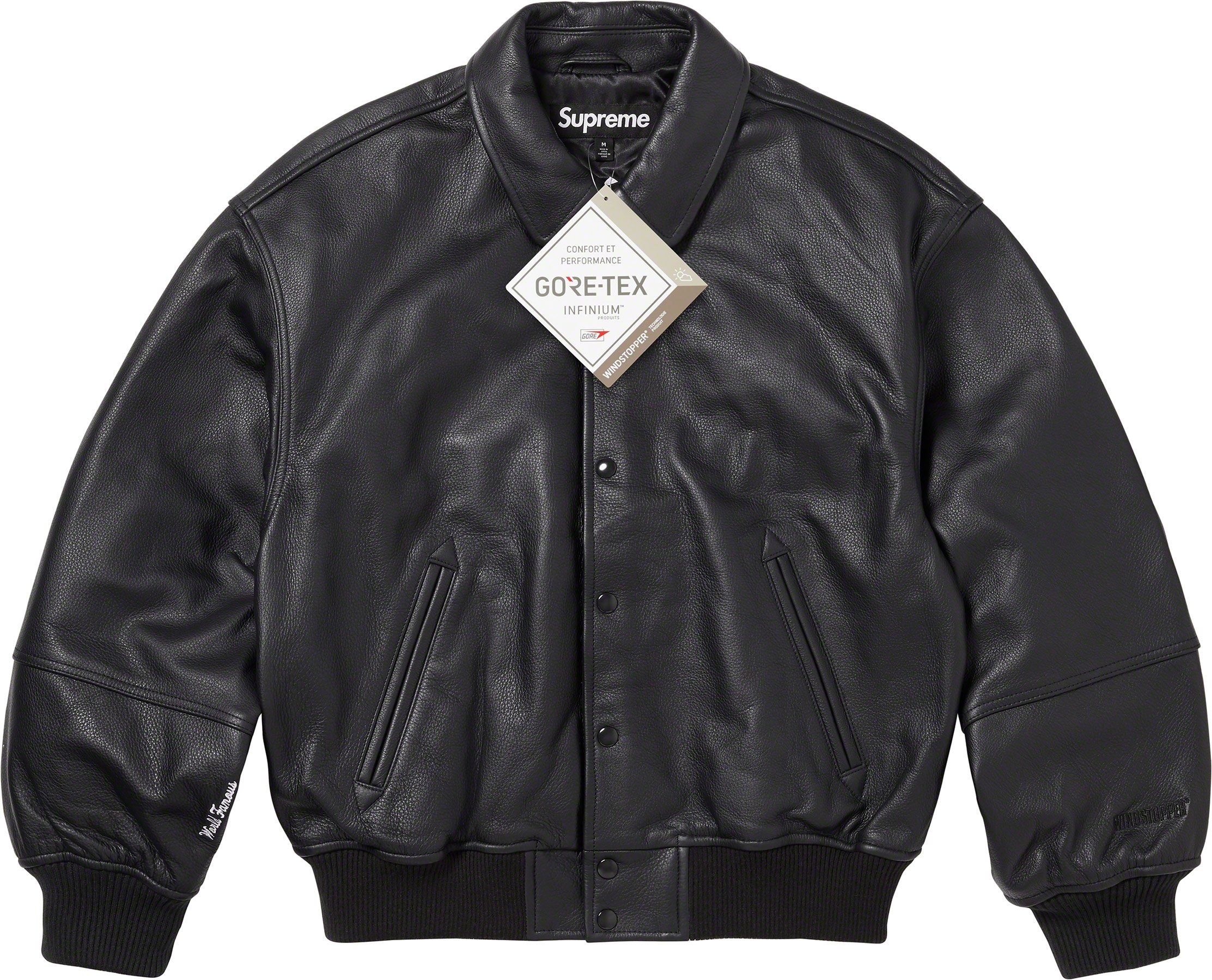 Cowhide leather with GORE WINDSTOPPER® drop liner and satin lining. Snap front closure with double welt hand pockets at lower front. Interior chest pocket with knit rib cuffs and hem. Embossed logo at back shoulders and sleeves. Embroidered graphics at cuffs.