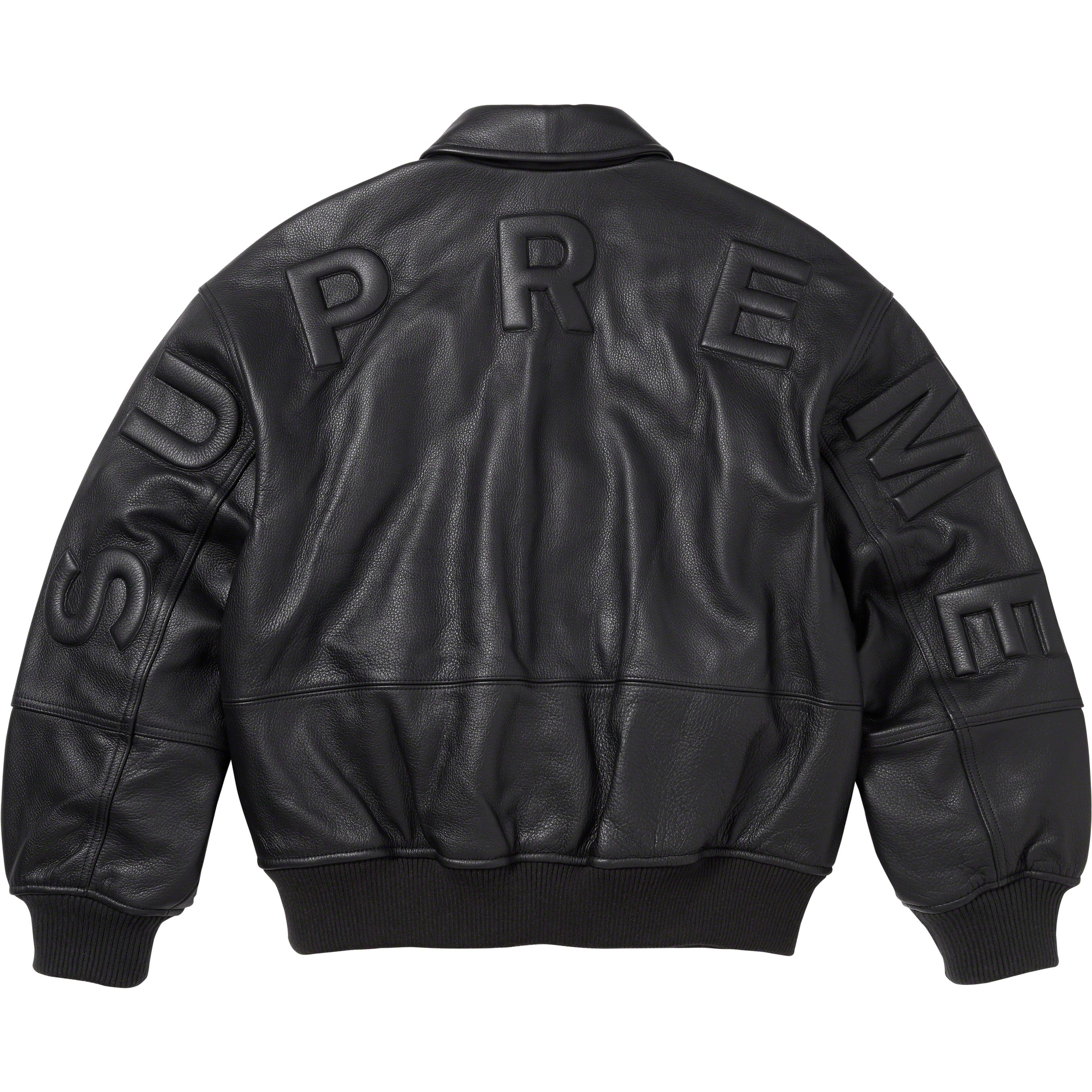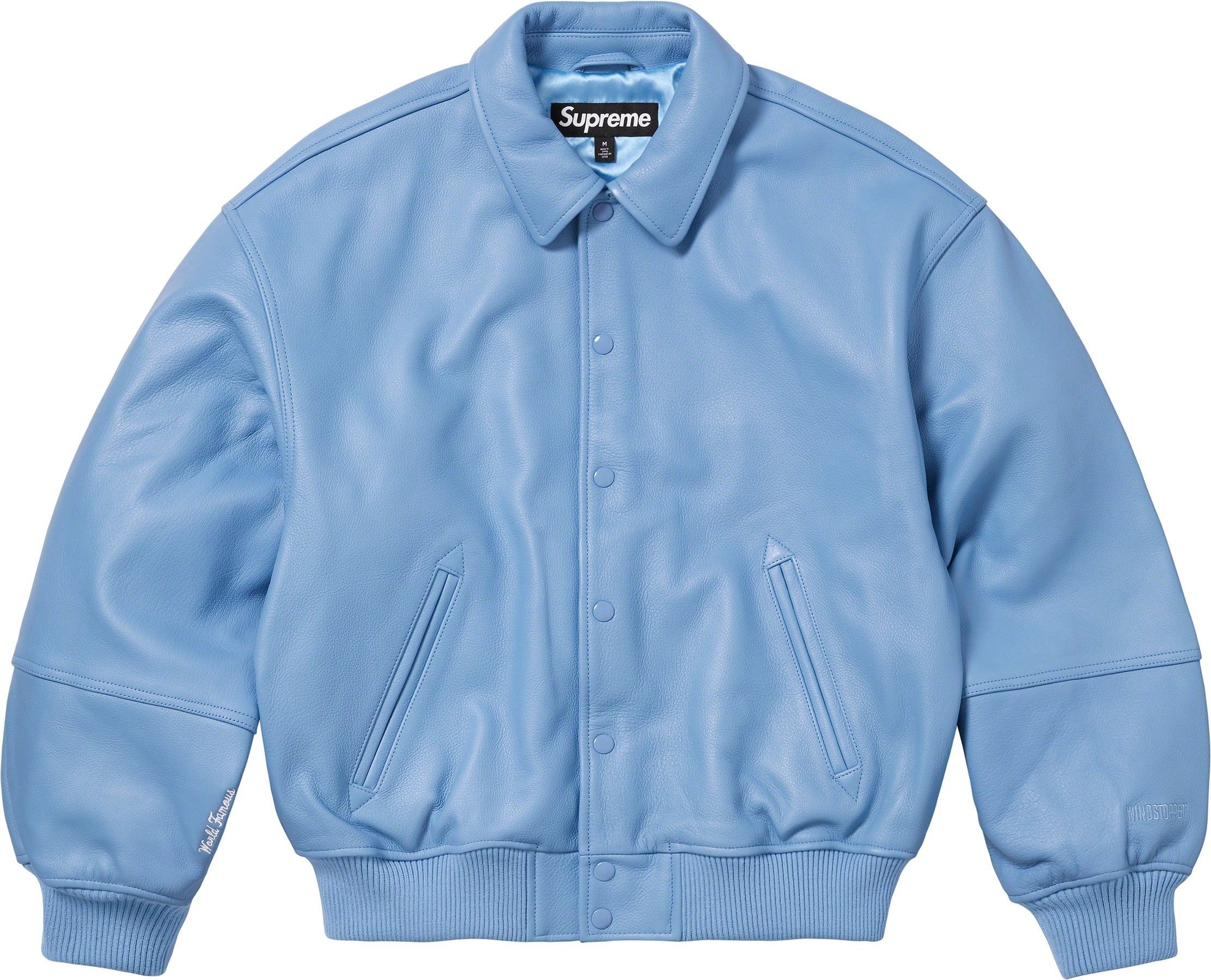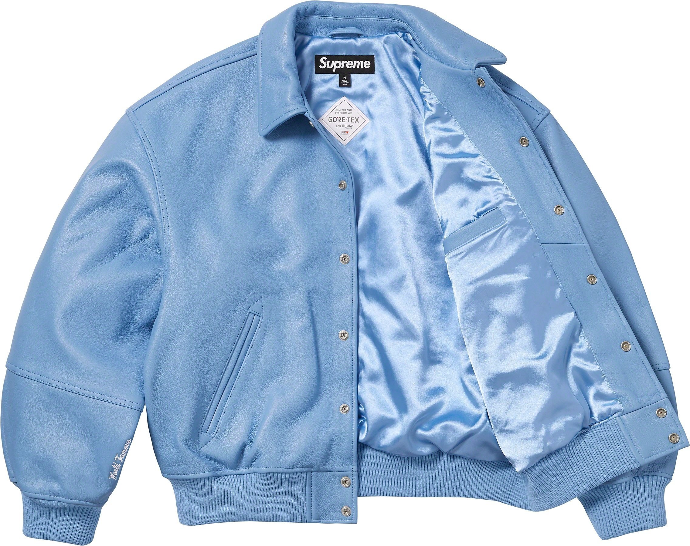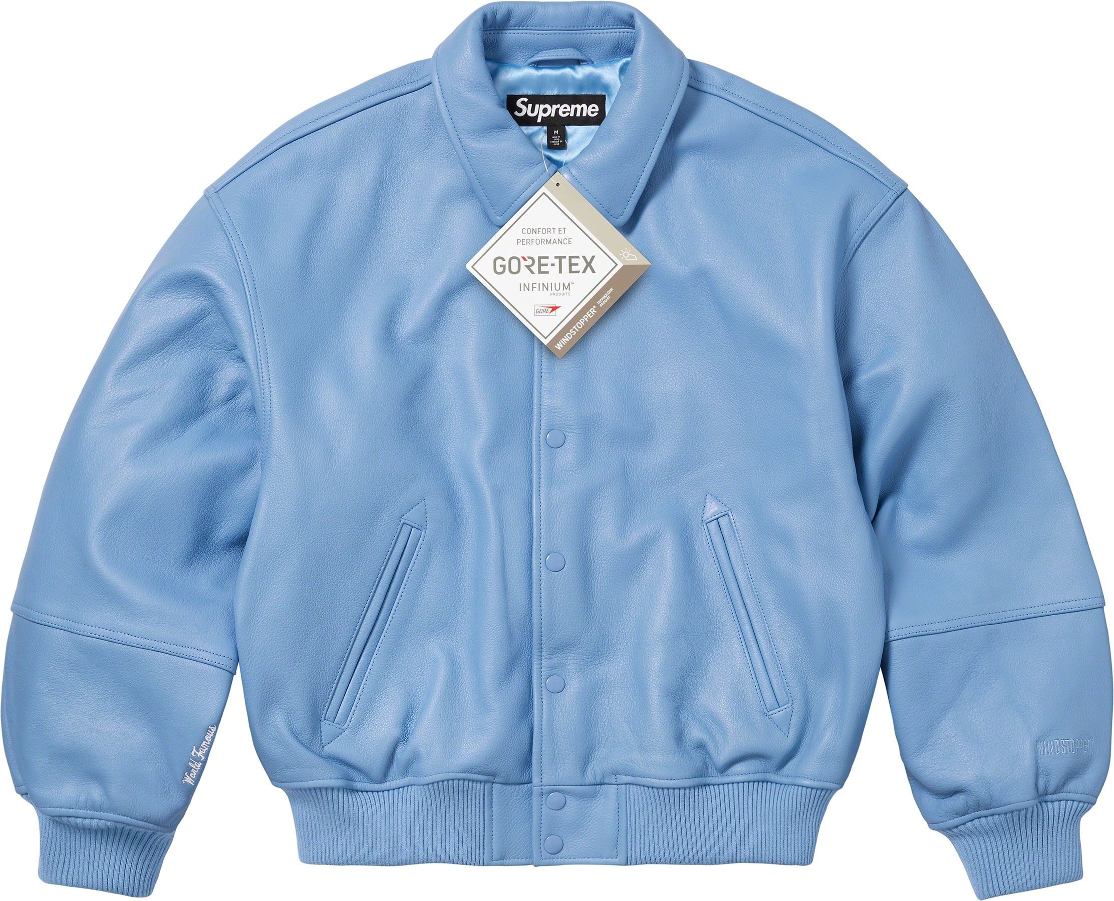 Cowhide leather with GORE WINDSTOPPER® drop liner and satin lining. Snap front closure with double welt hand pockets at lower front. Interior chest pocket with knit rib cuffs and hem. Embossed logo at back shoulders and sleeves. Embroidered graphics at cuffs.