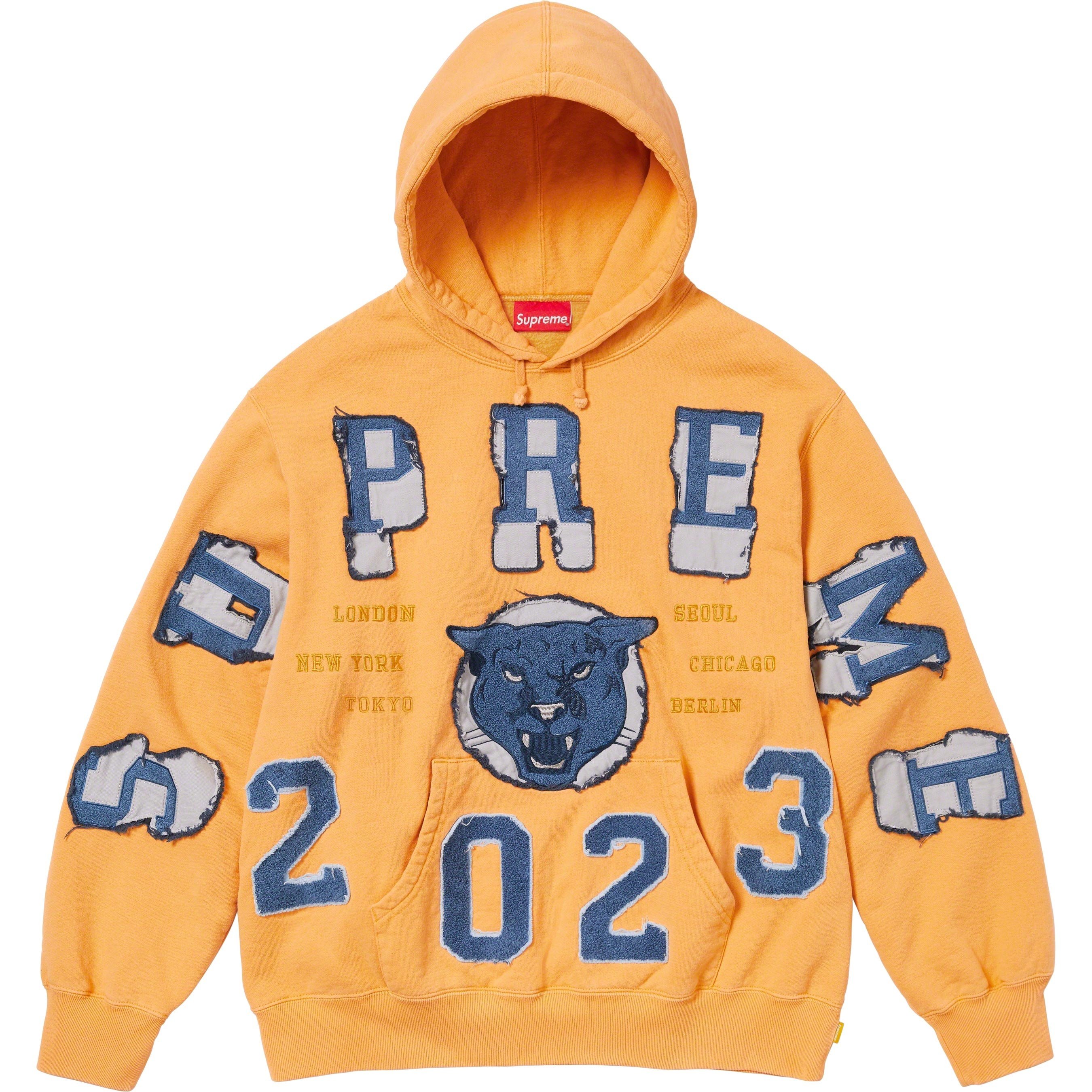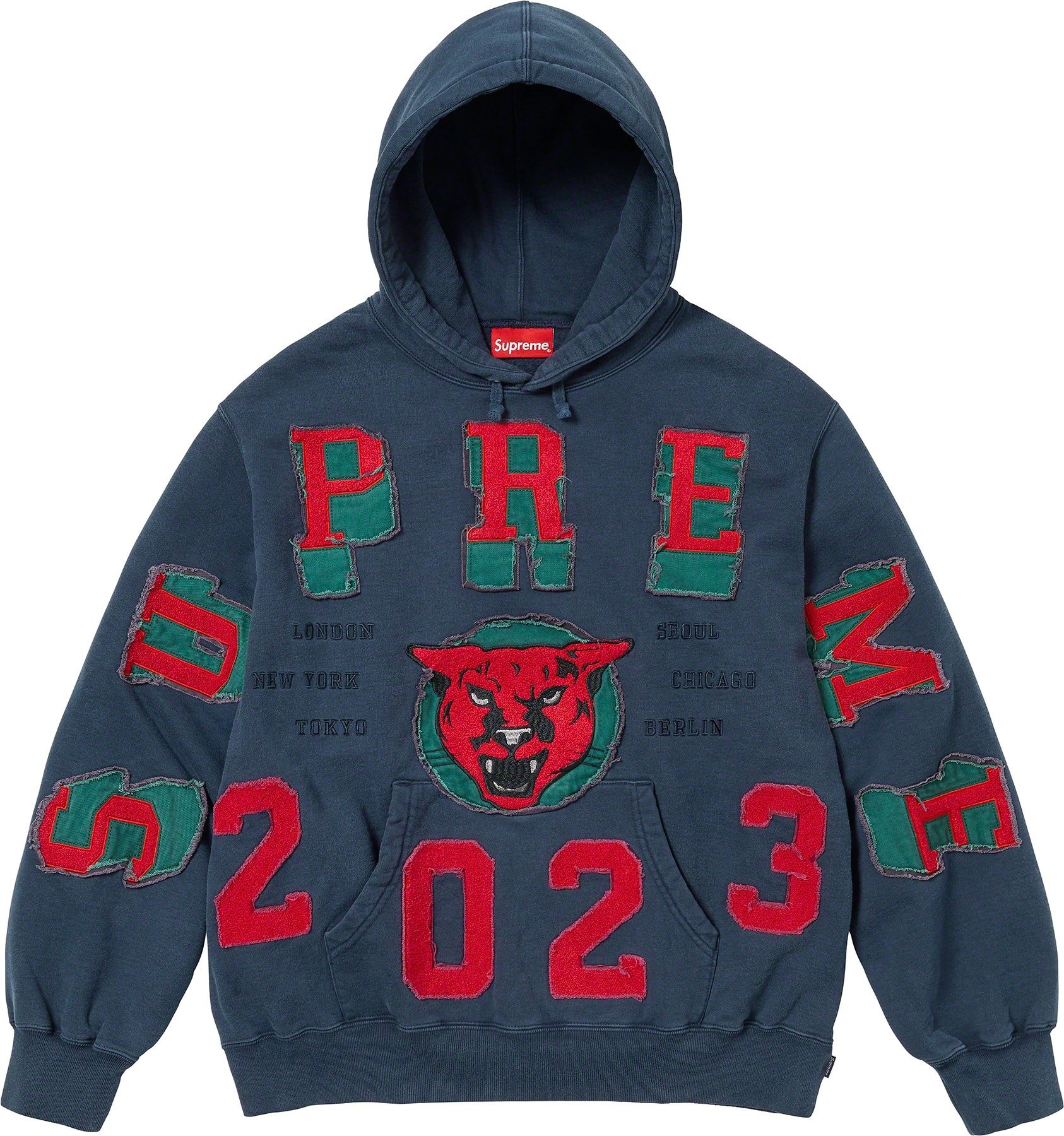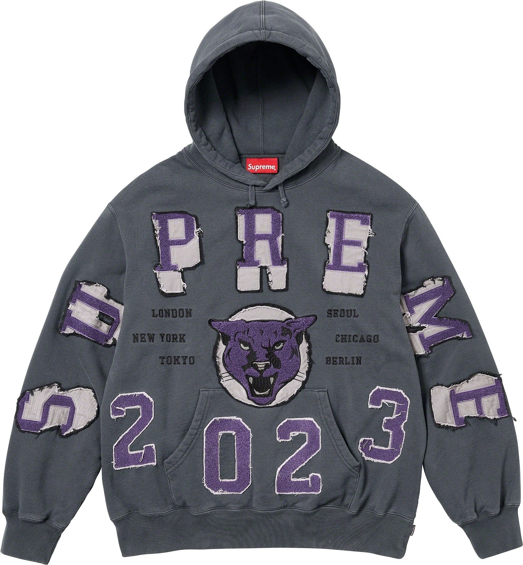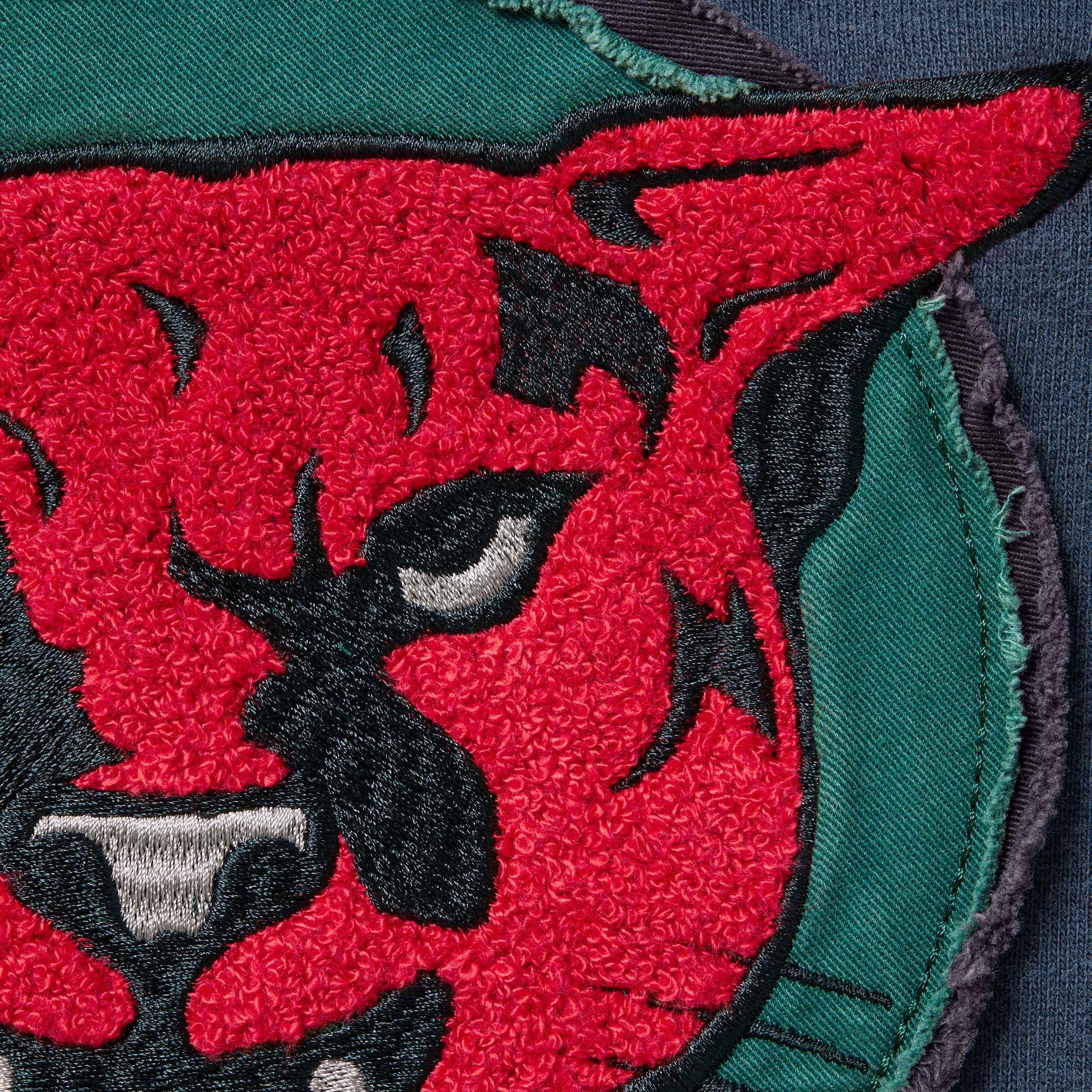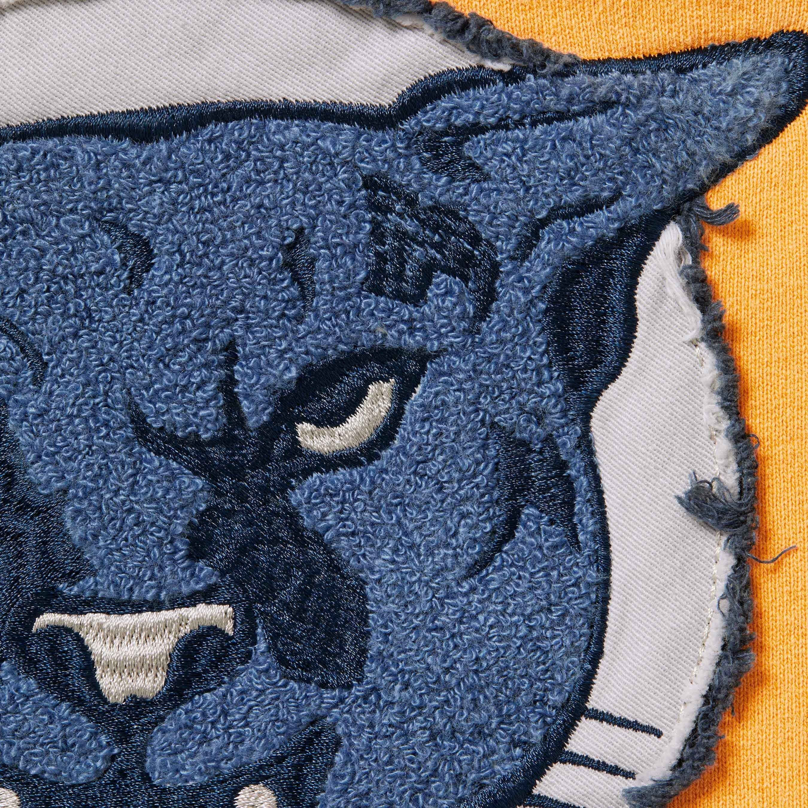 Brushed-back fleece with pouch pocket. Chenille appliqué with embroidered graphic on front and sleeves.