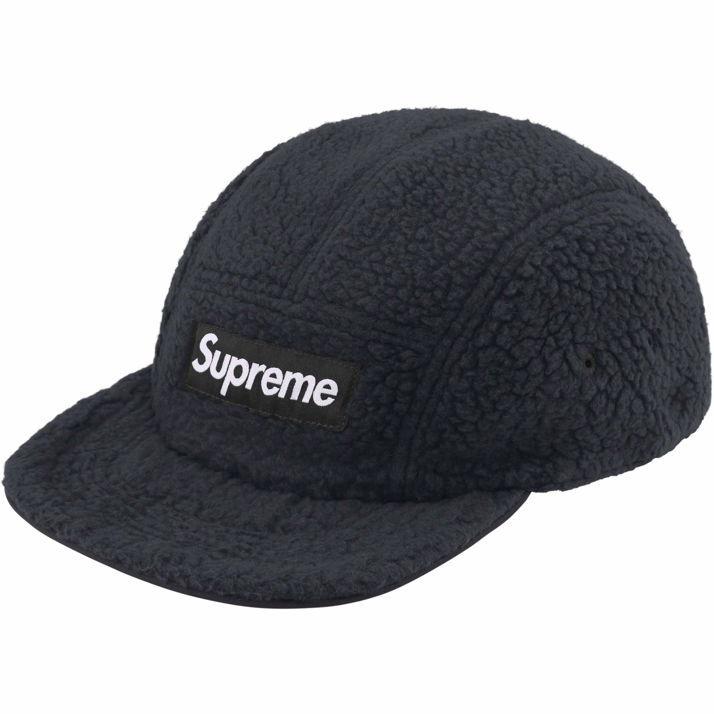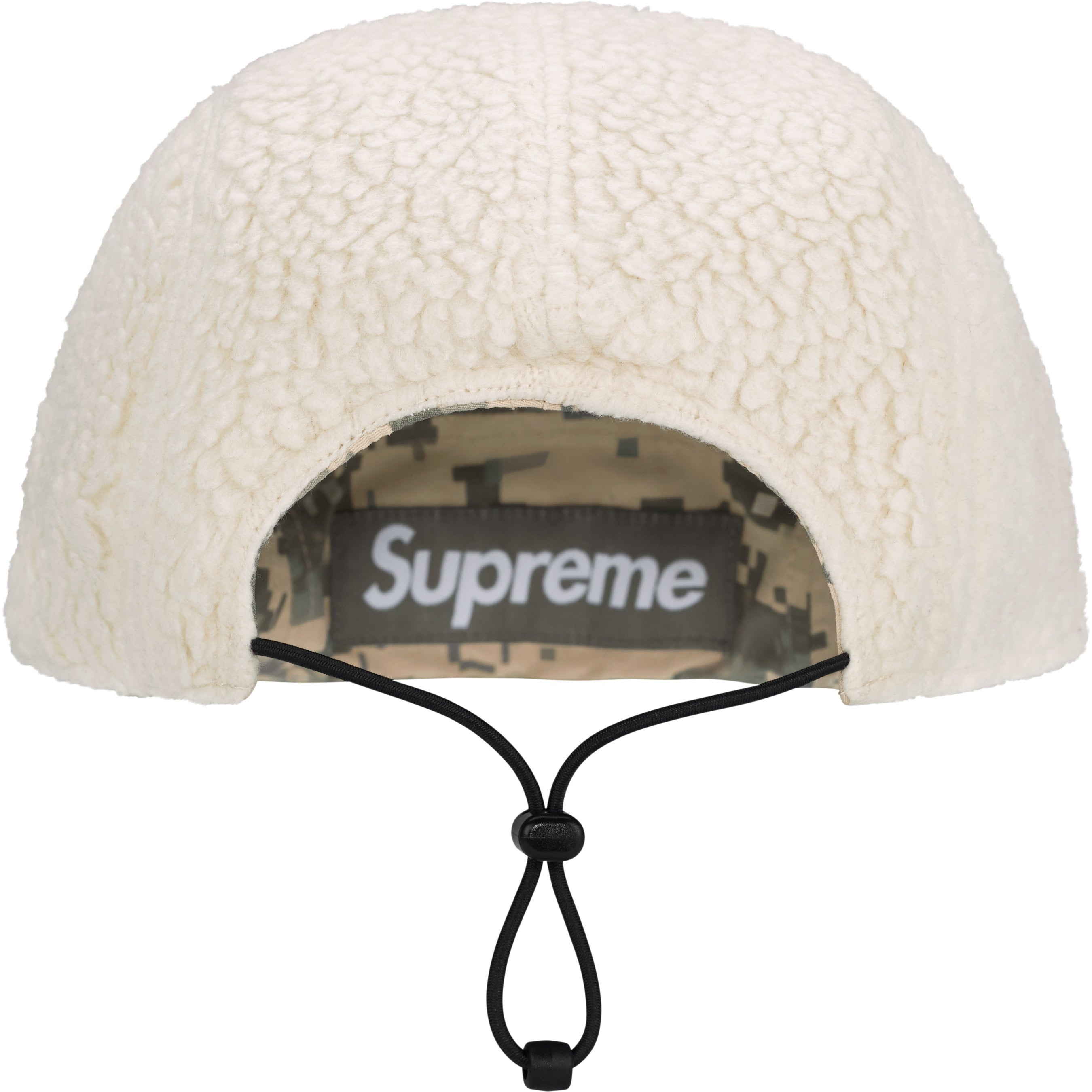 Water resistant nylon Supreme camp cap with interior elastic shockcord closure. Polartec® 300 shearling fleece reverse side and embroidered logo on visor.