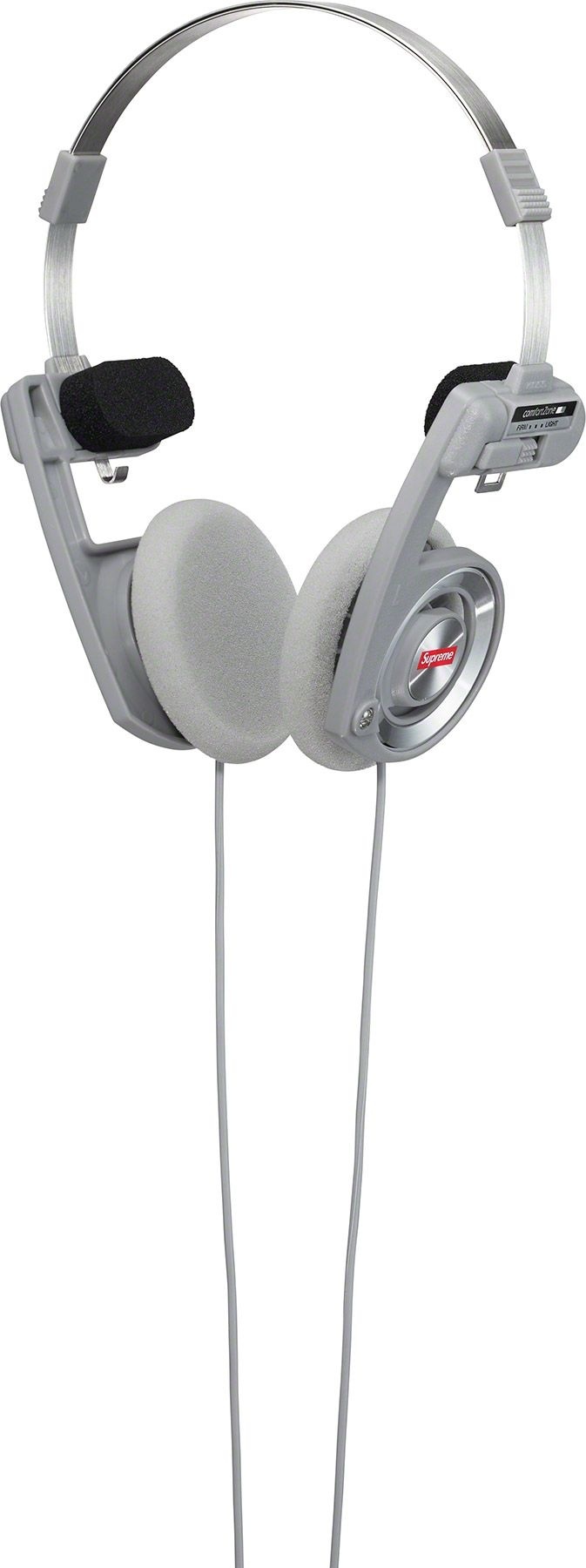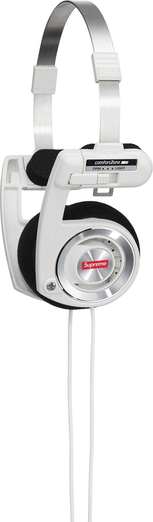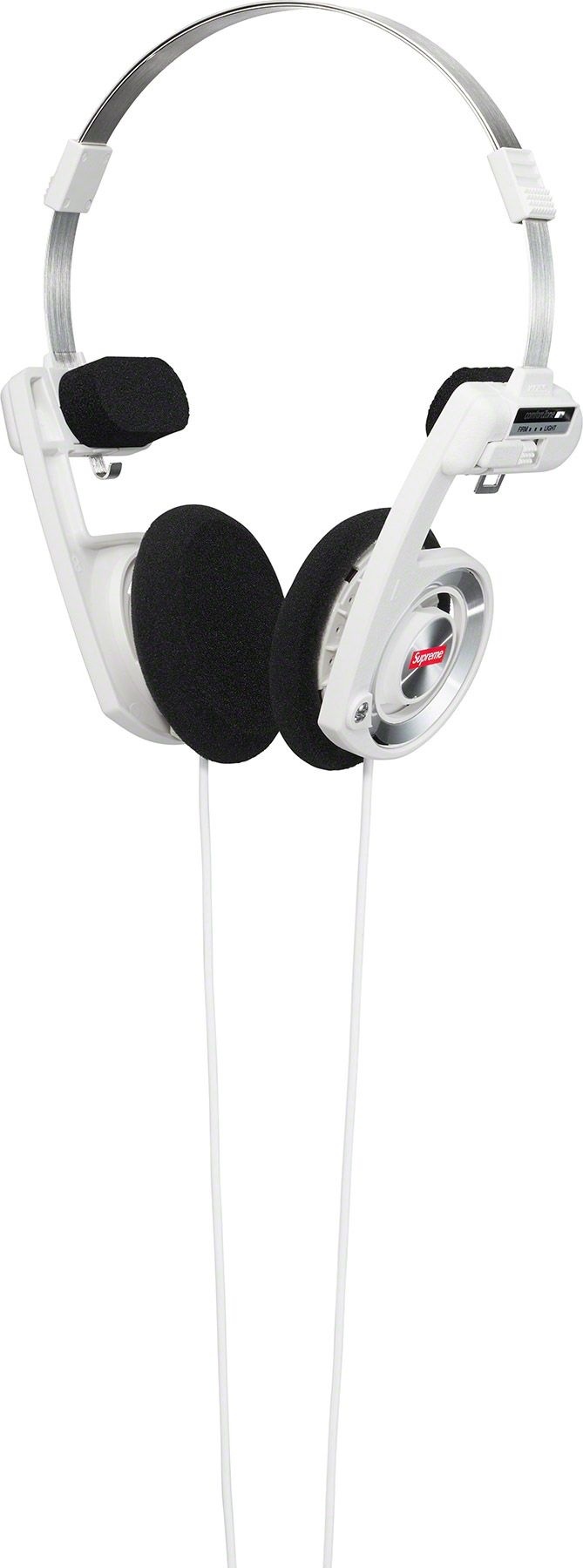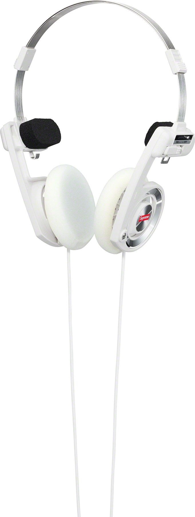 On-ear headphones with custom logos. Internal copper voice coils deliver deep bass and signal clarity. Collapsible headband with adjustable temporal zone pads to balance ear plate position. Additional set of lightweight foam cushions and protective case included. Made exclusively for Supreme.