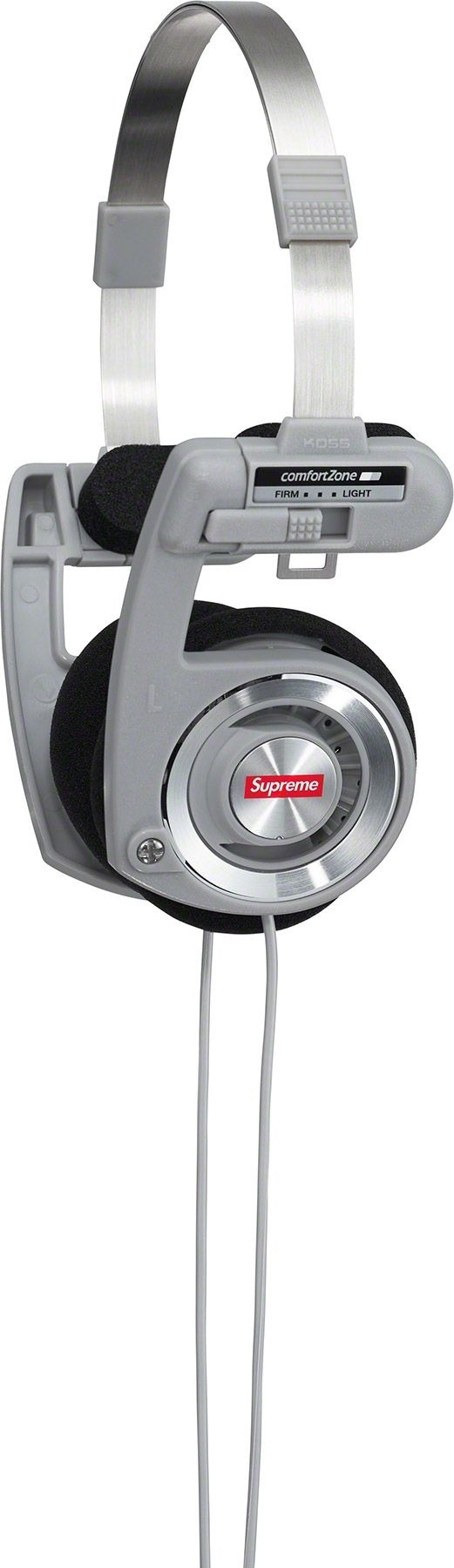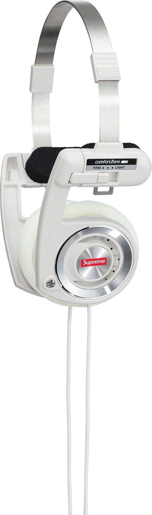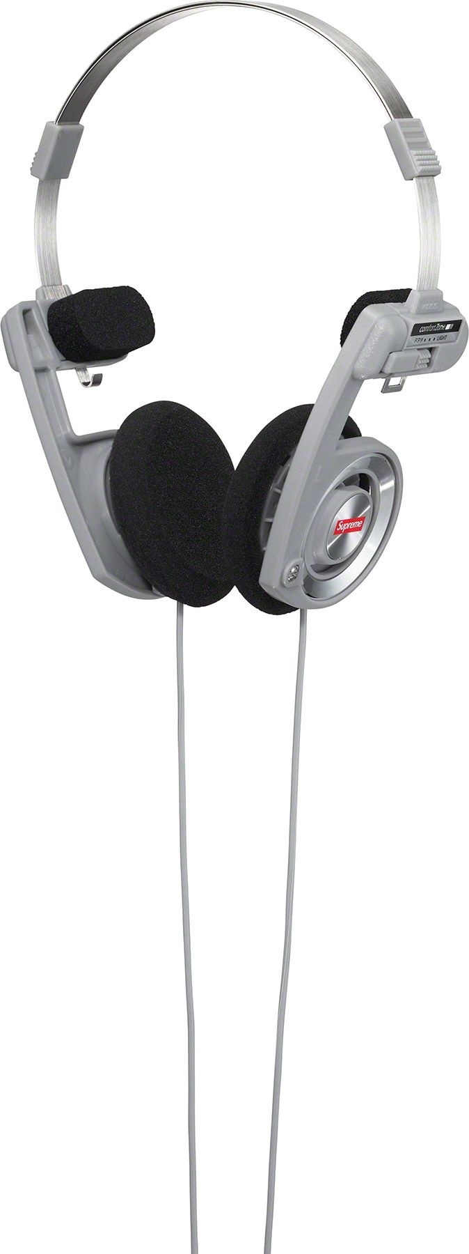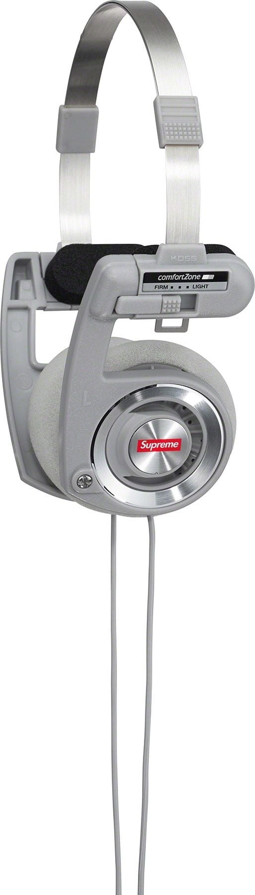 On-ear headphones with custom logos. Internal copper voice coils deliver deep bass and signal clarity. Collapsible headband with adjustable temporal zone pads to balance ear plate position. Additional set of lightweight foam cushions and protective case included. Made exclusively for Supreme.