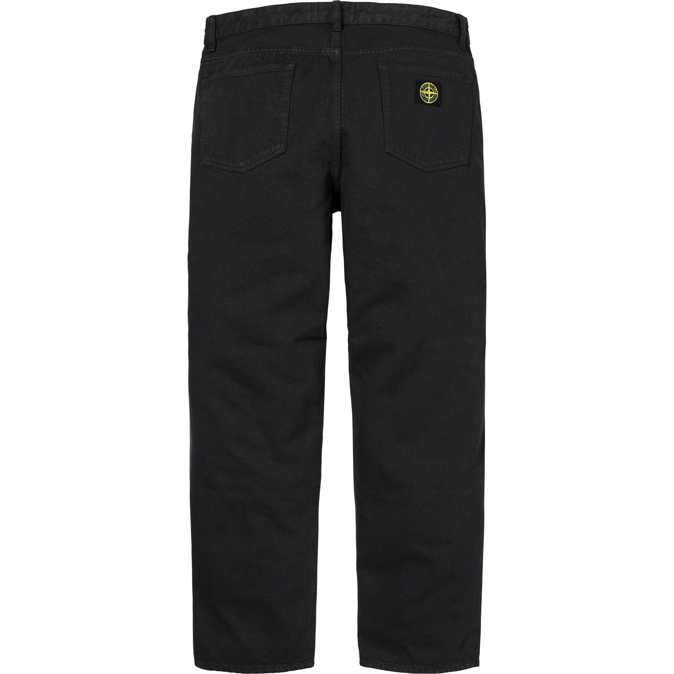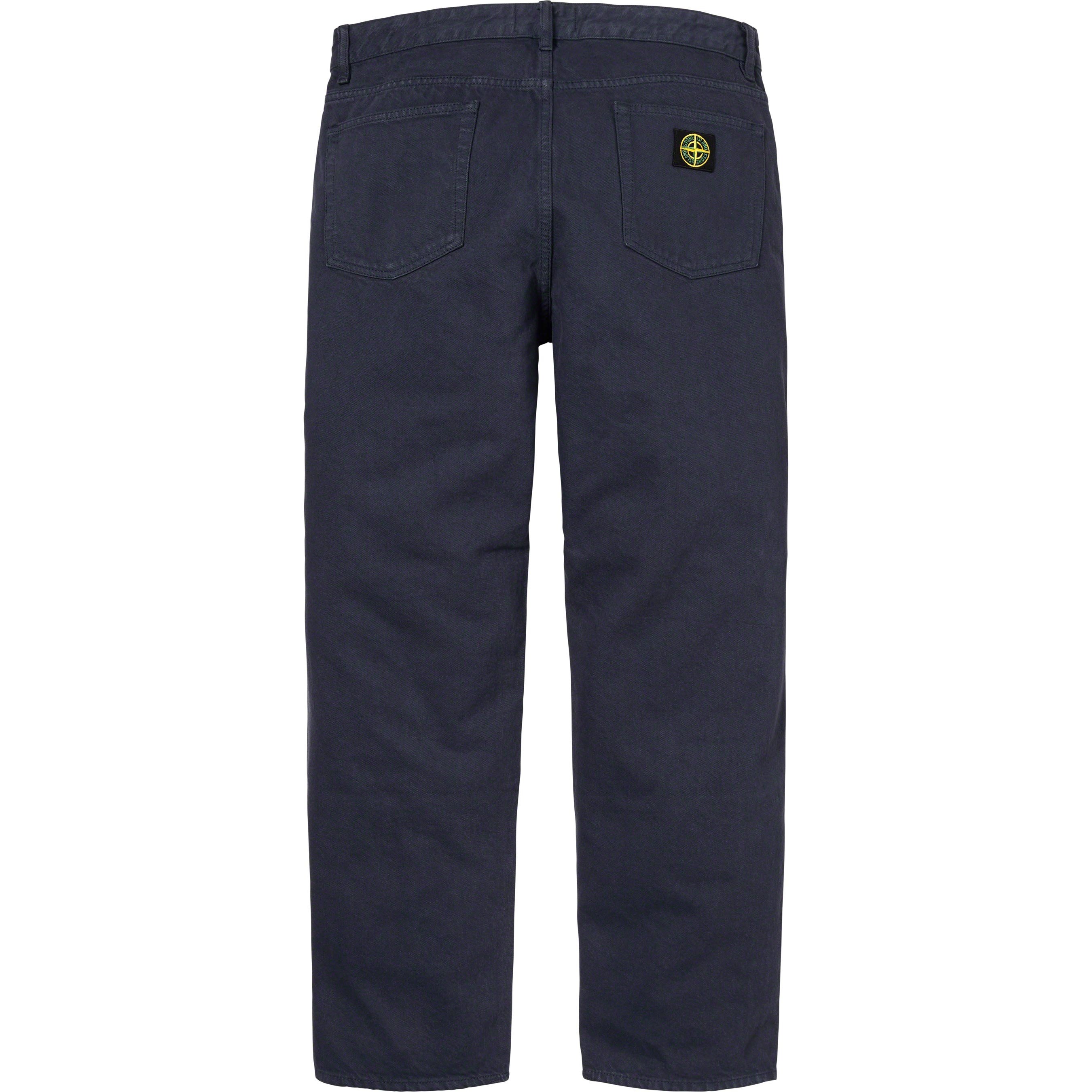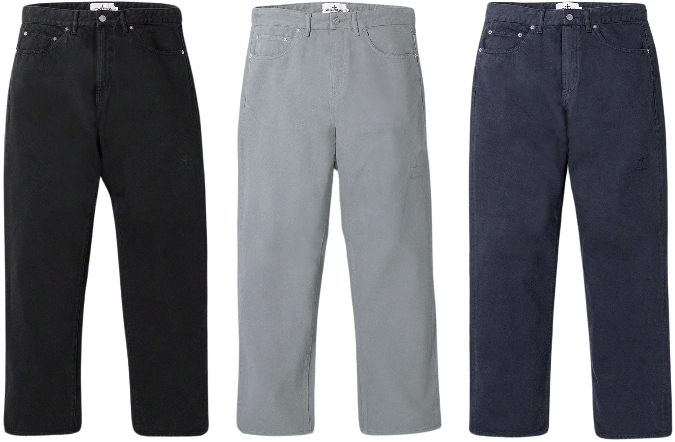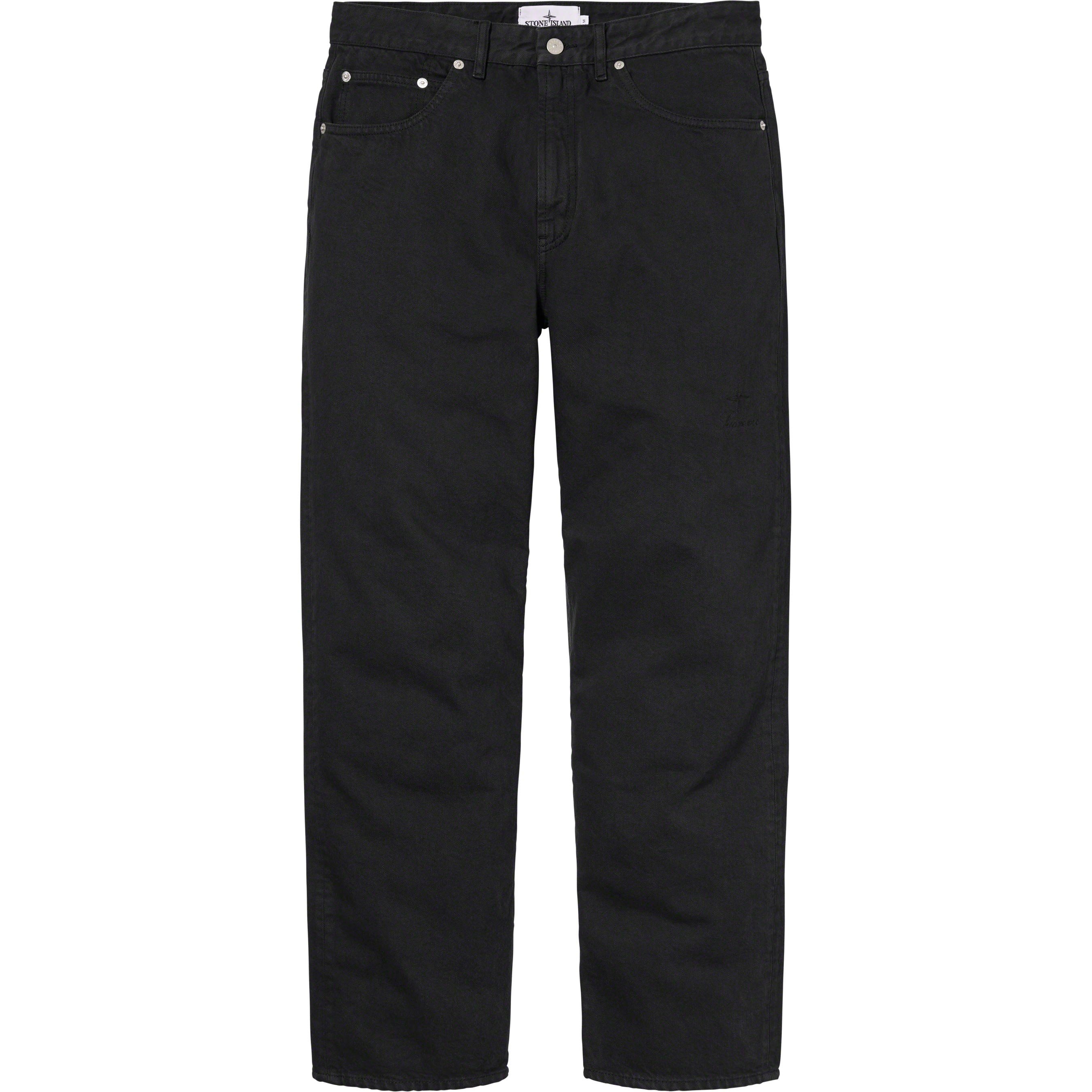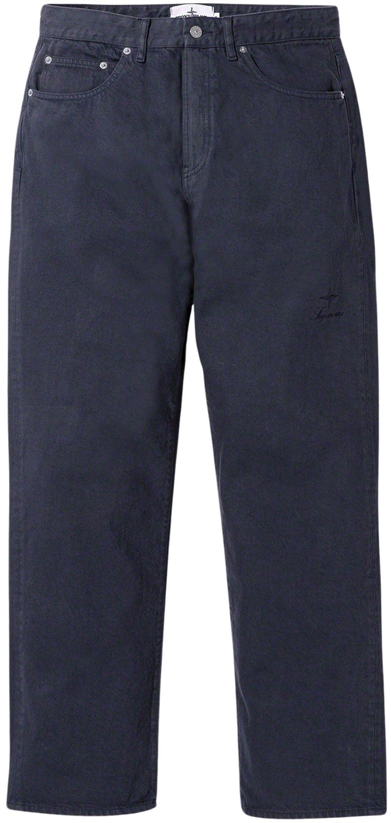 All cotton bull denim with garment dye treatment. Classic 5-pocket style with zip fly, single coin pocket, embroidered logos at thigh and Stone Island® patch on back pocket. Made exclusively for Supreme.