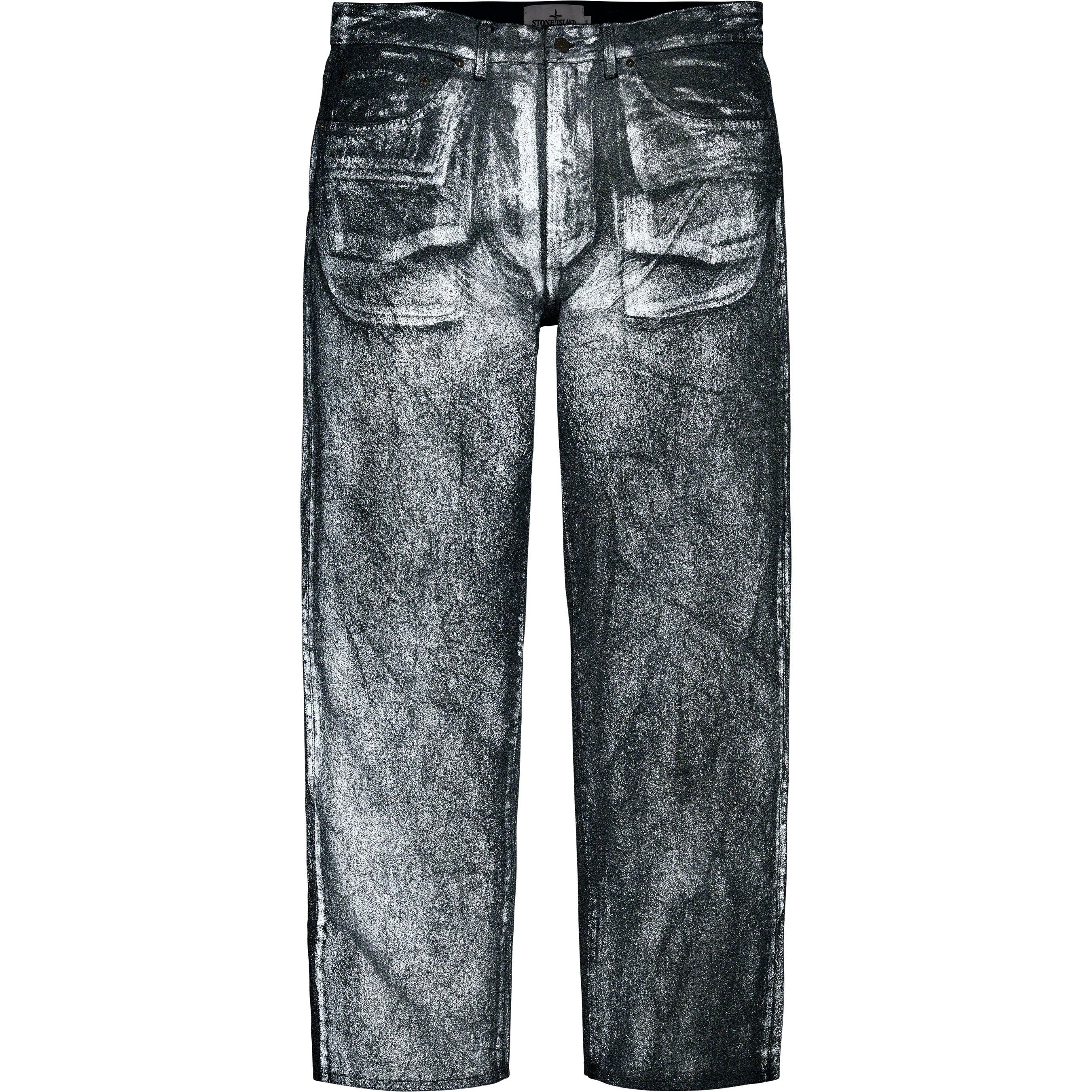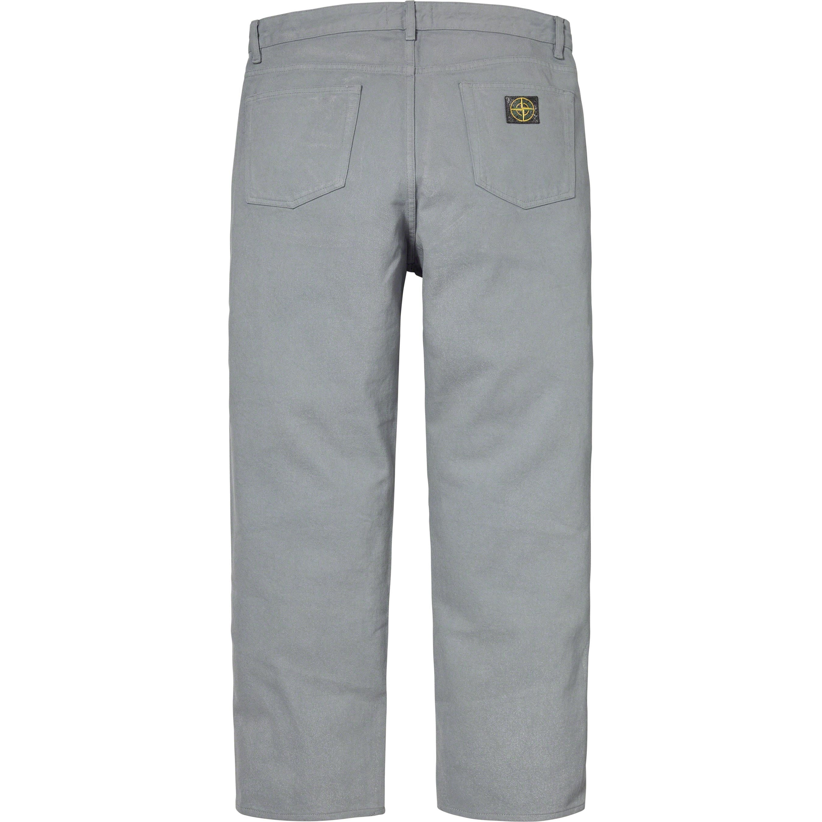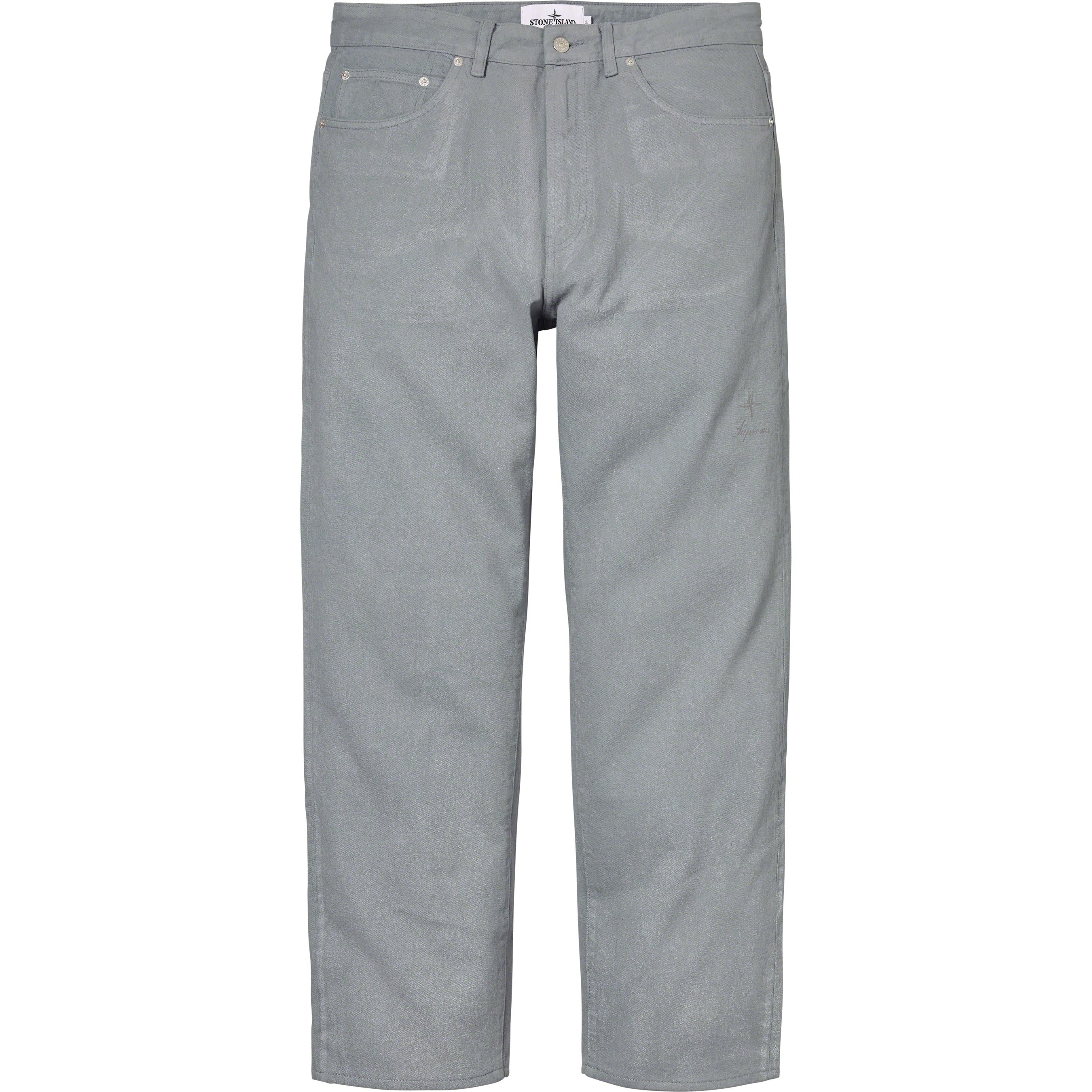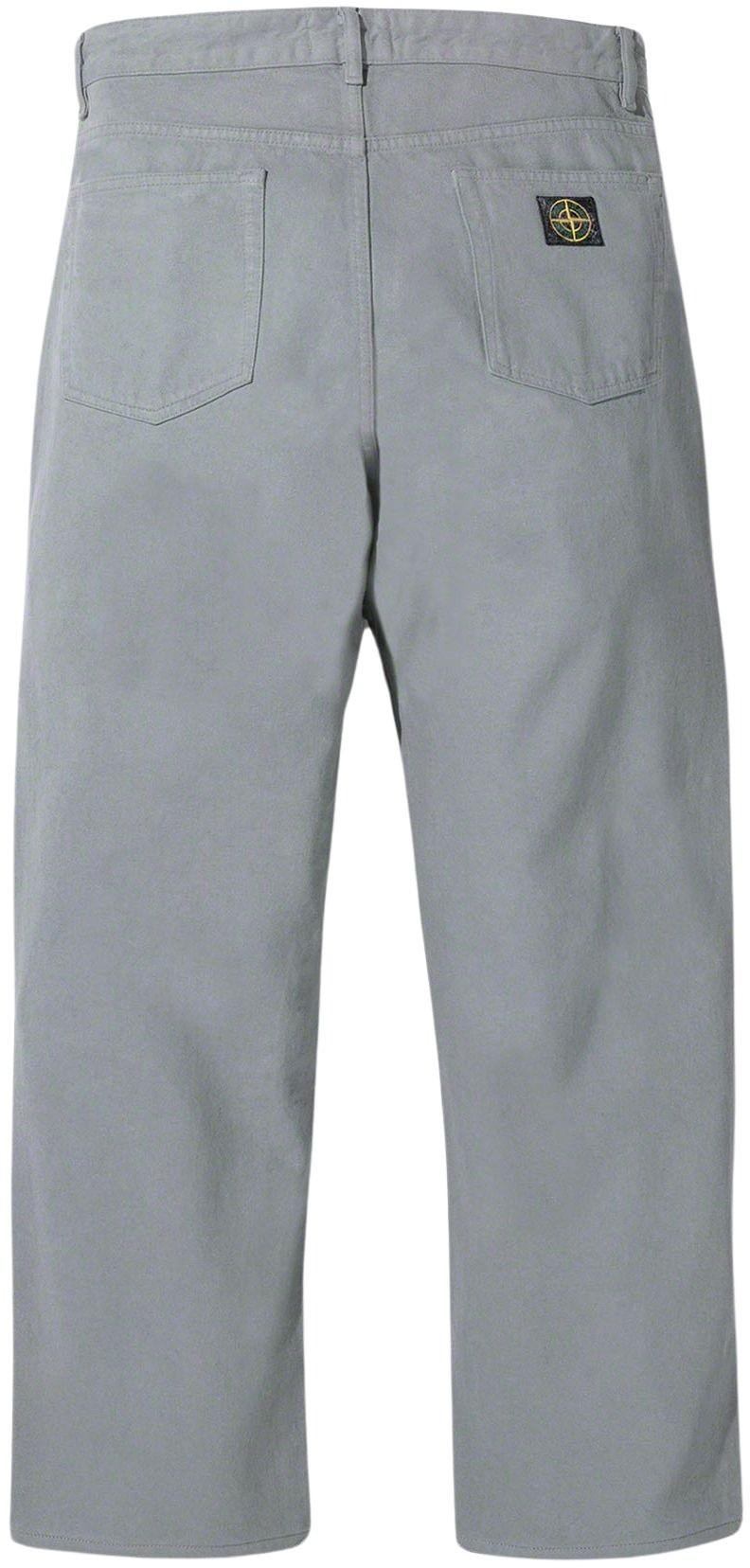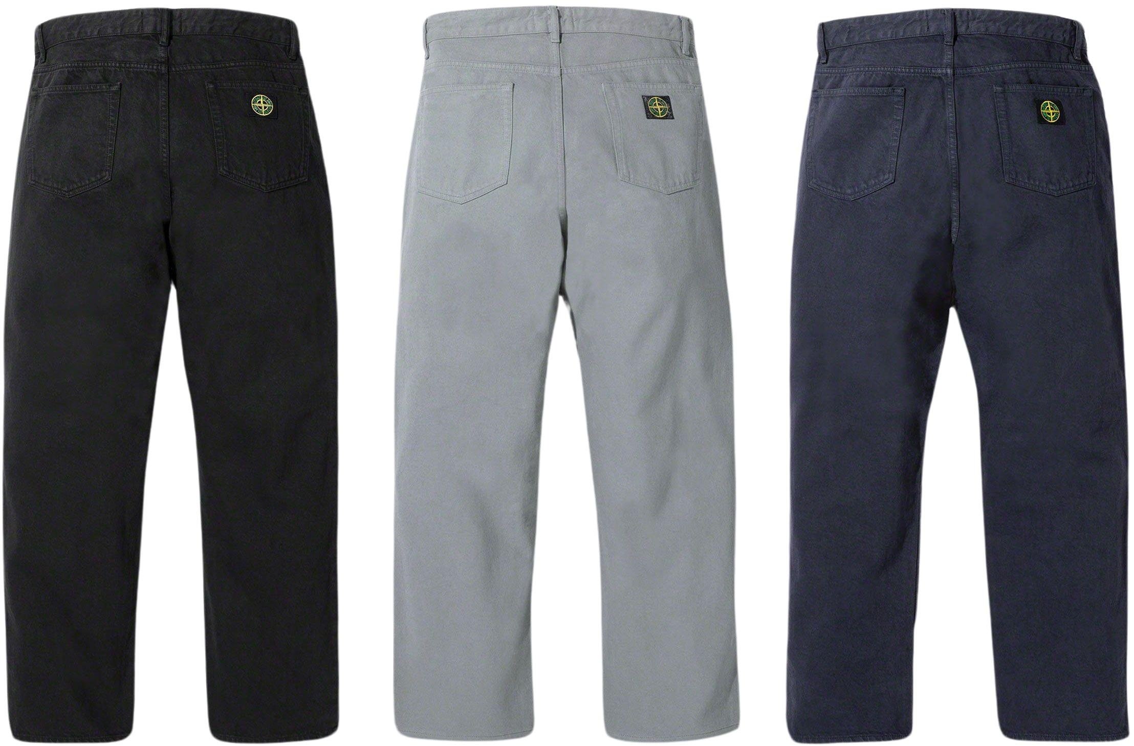 All cotton bull denim with garment dye treatment. Classic 5-pocket style with zip fly, single coin pocket, embroidered logos at thigh and Stone Island® patch on back pocket. Made exclusively for Supreme.
