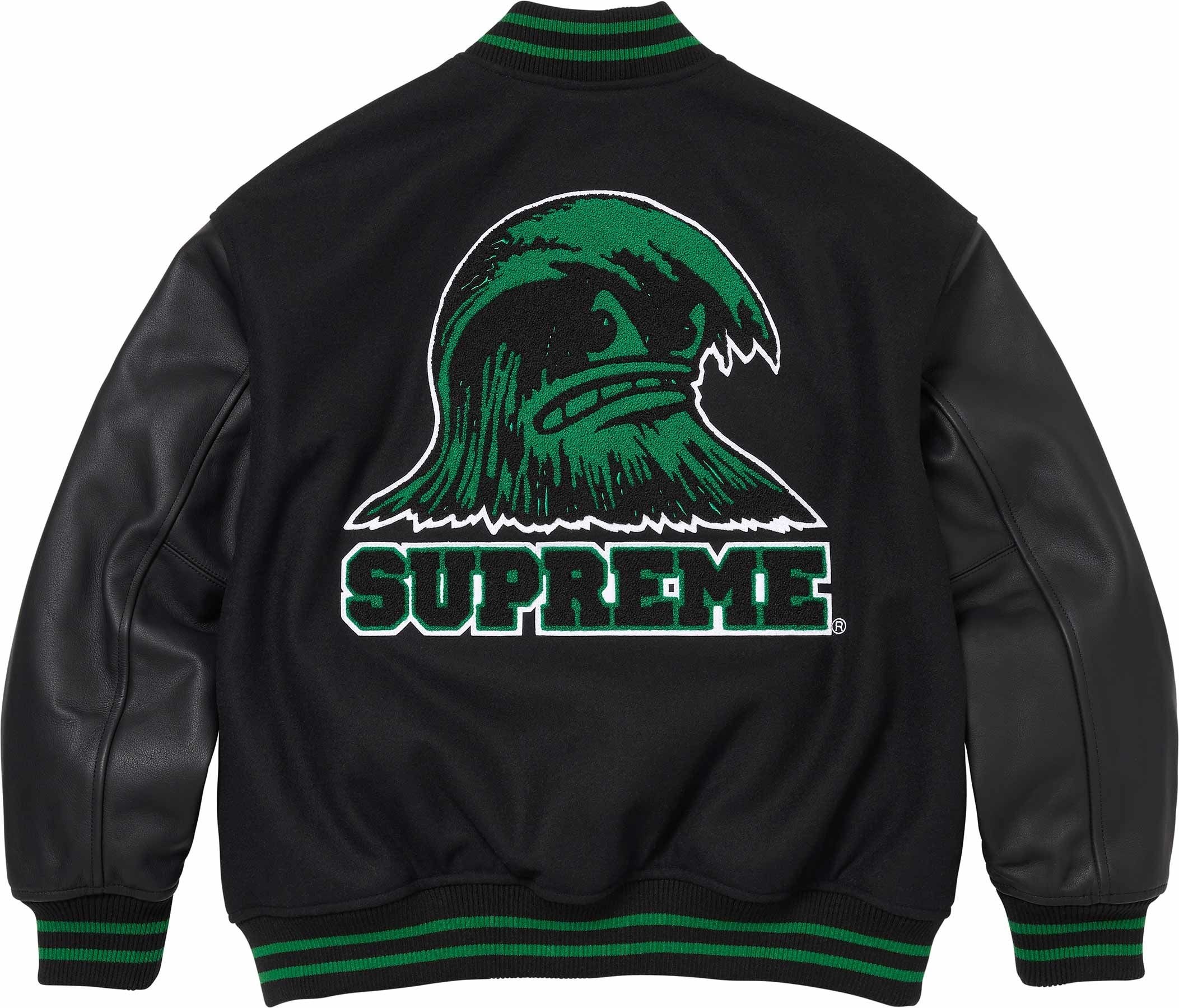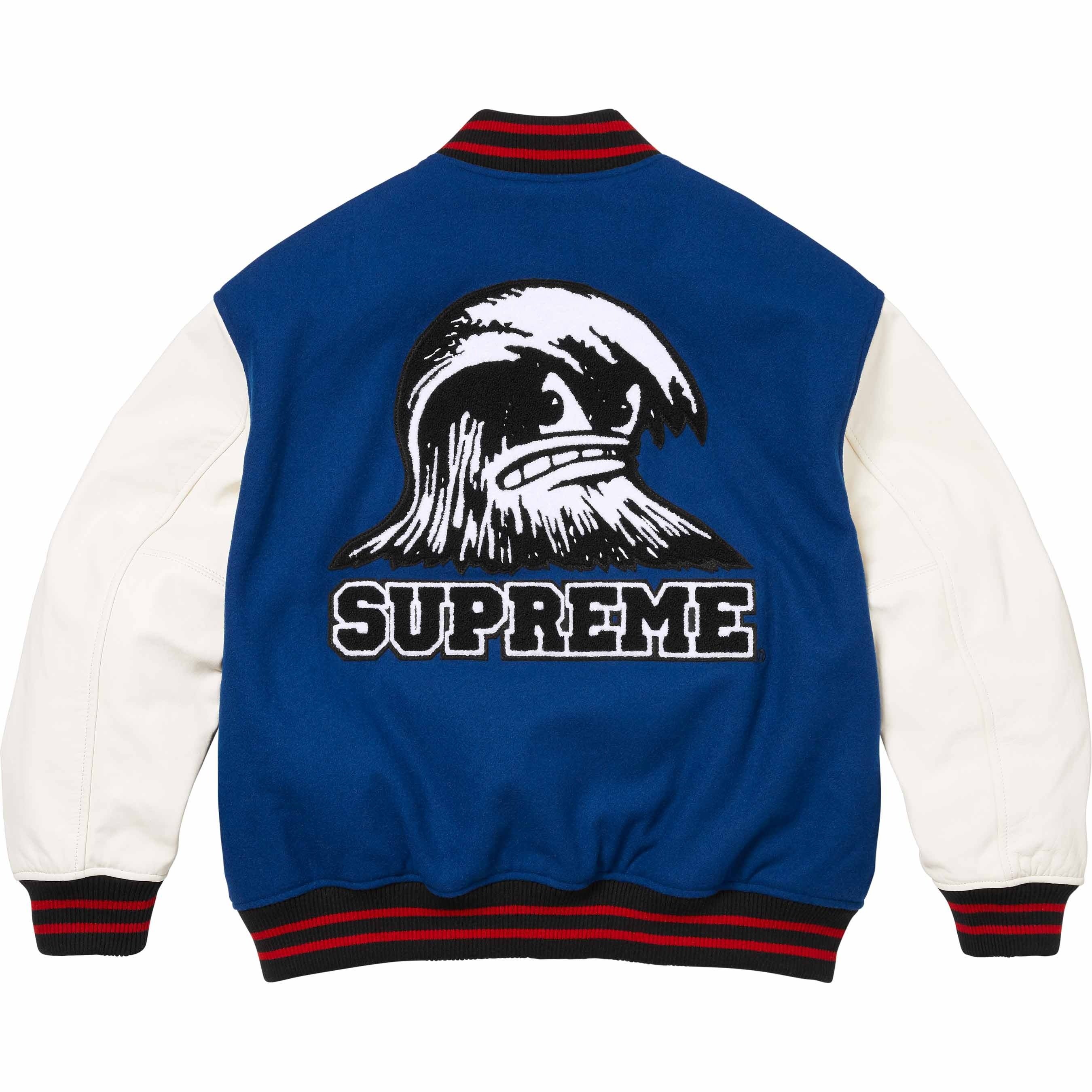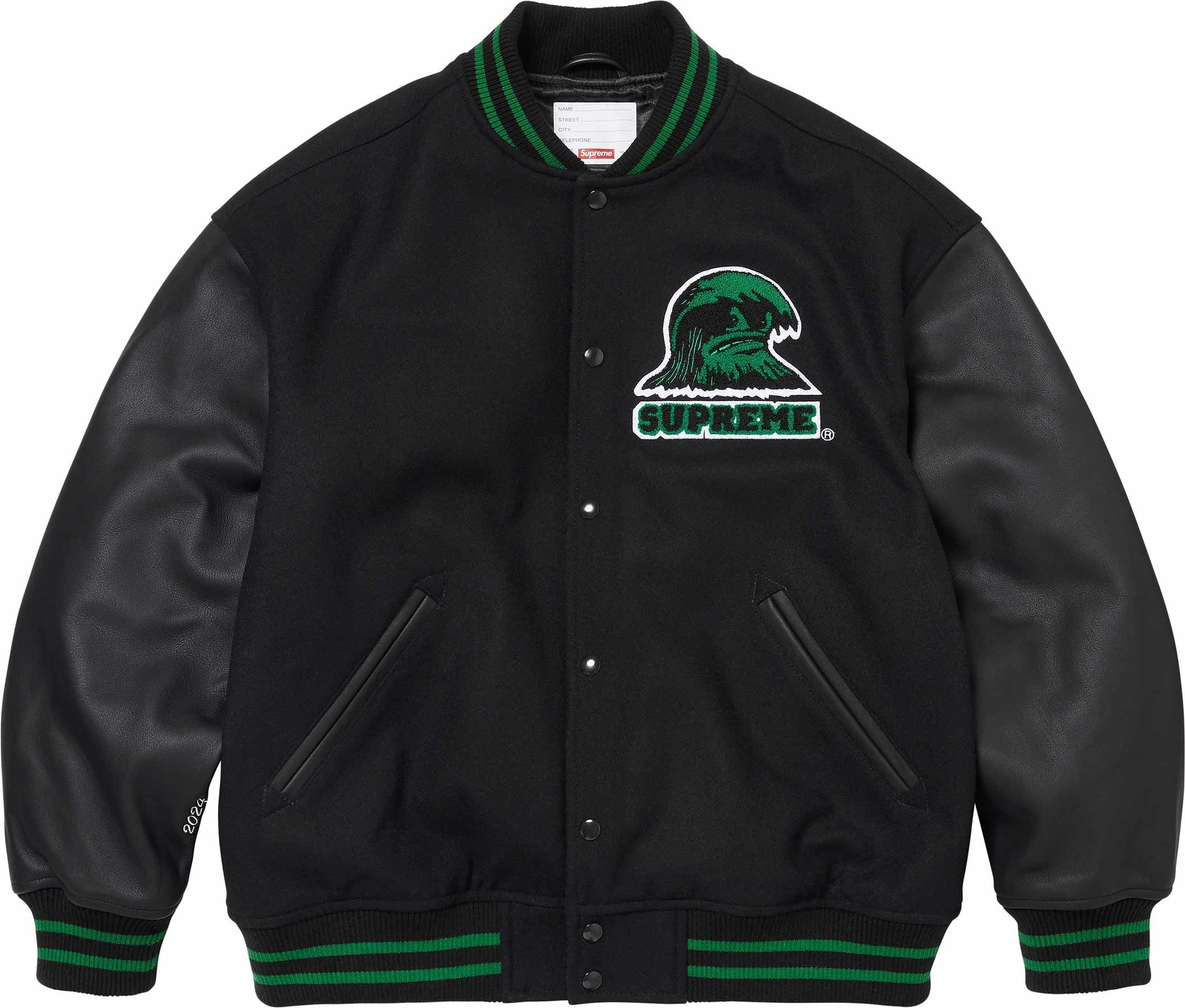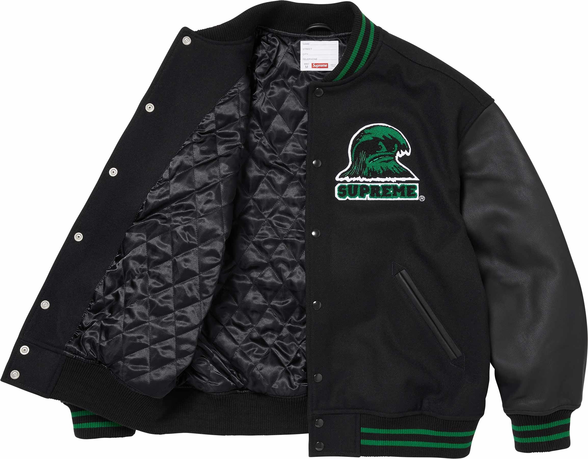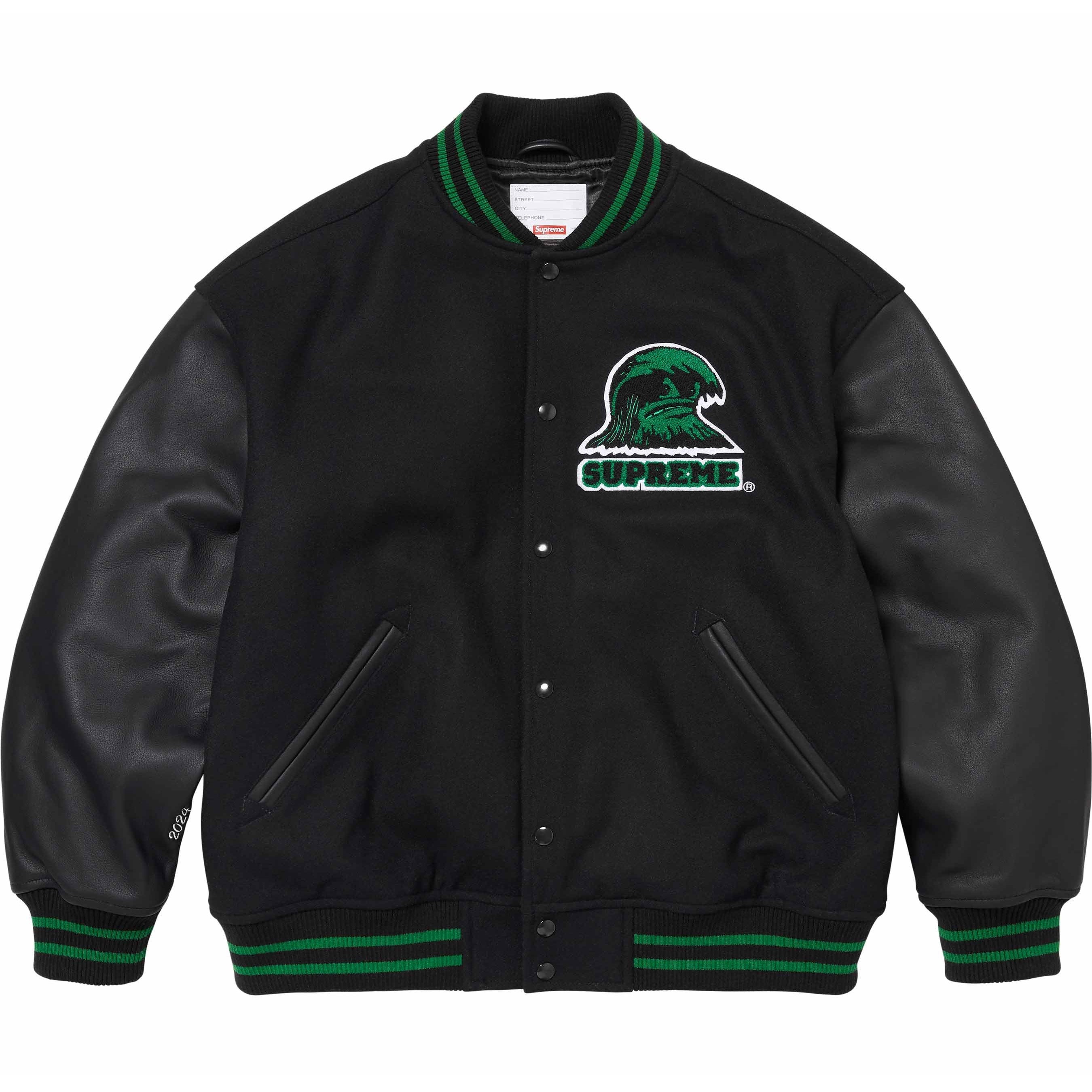 Wool blend with cowhide leather sleeves, fill and quilted satin lining. Snap front closure with double welt leather hand pockets at lower front and interior chest pocket. Knit rib collar, cuffs and hem. Felt and chenille appliqué at chest and back. Embroidered graphic at cuff.