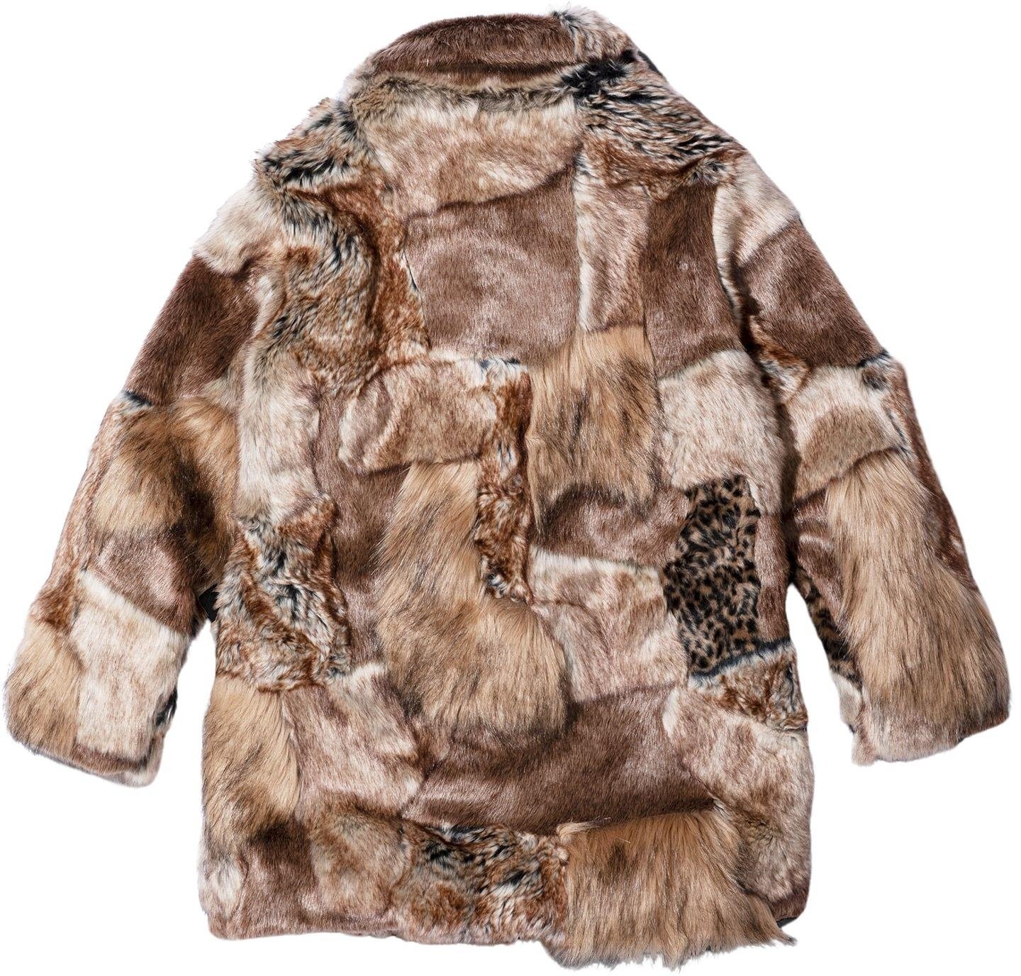 Faux fur with patchwork pattern and viscose lining. Button front closure with welt hand pockets at lower front and interior chest pockets. Embroidered logo and MM6 numeric signature at interior pocket. MM6 white stitch line at back.