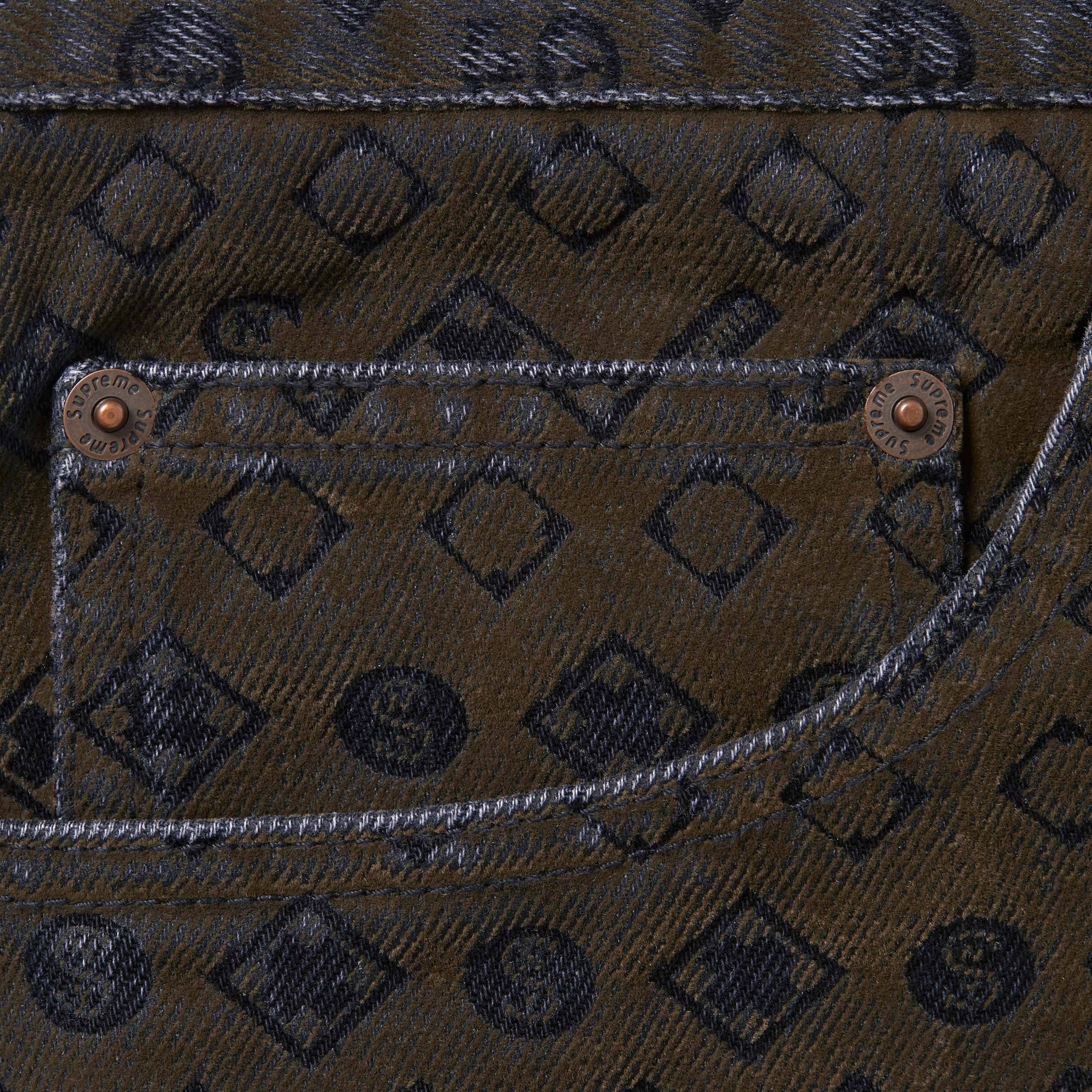 All cotton 13 oz. denim with flocked logo pattern and loose fit. Classic 5-pocket style with button fly, single coin pocket, copper oxide rivets and leather logo patch on back.