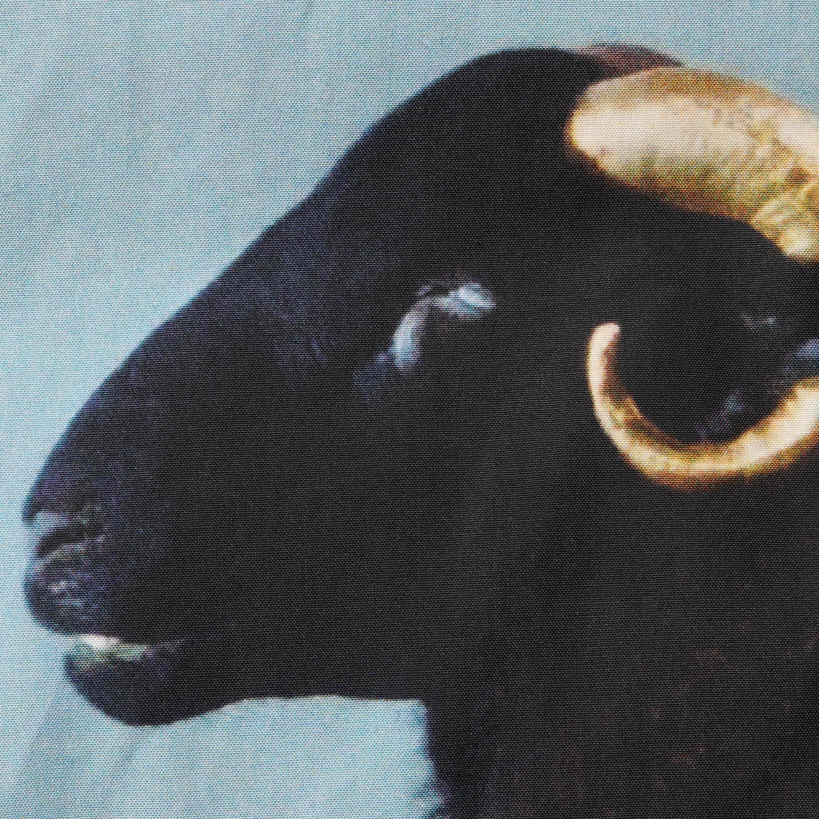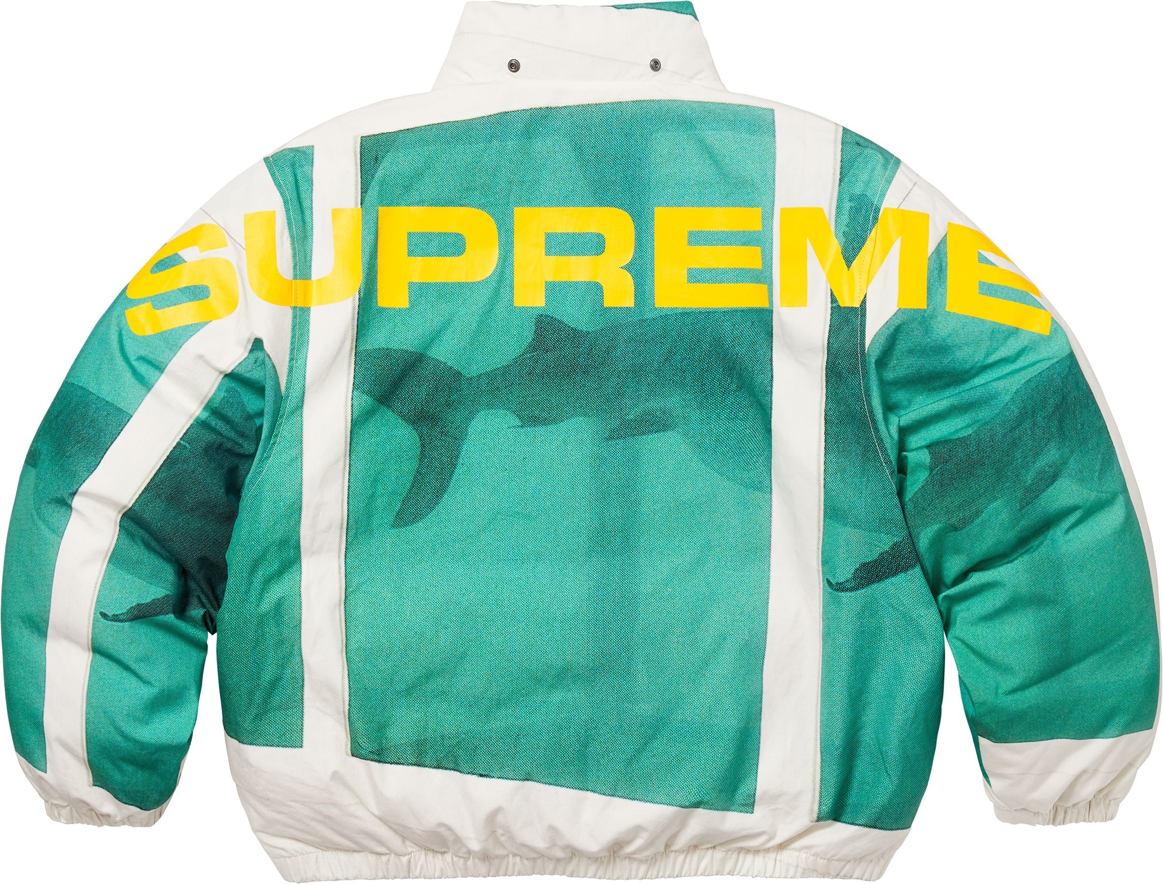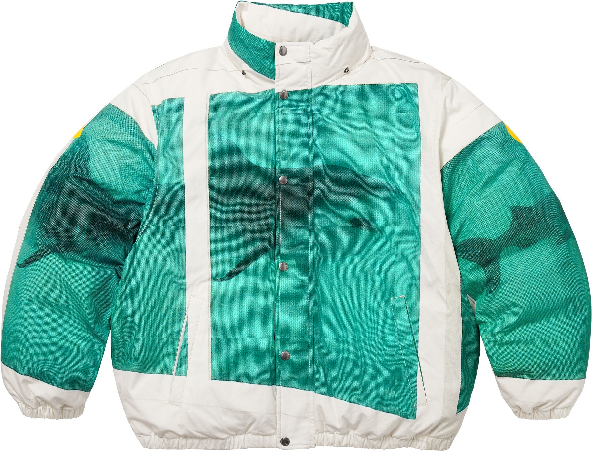 All cotton with printed graphic, down filled interior quilted baffles and poly lining. Full zip closure with snap placket. Welt hand pockets at lower front and interior zip pocket. Interior elastic shockcord at removable hood with elastic cuffs and hem. Printed logo on back. Original artwork by Damien Hirst.