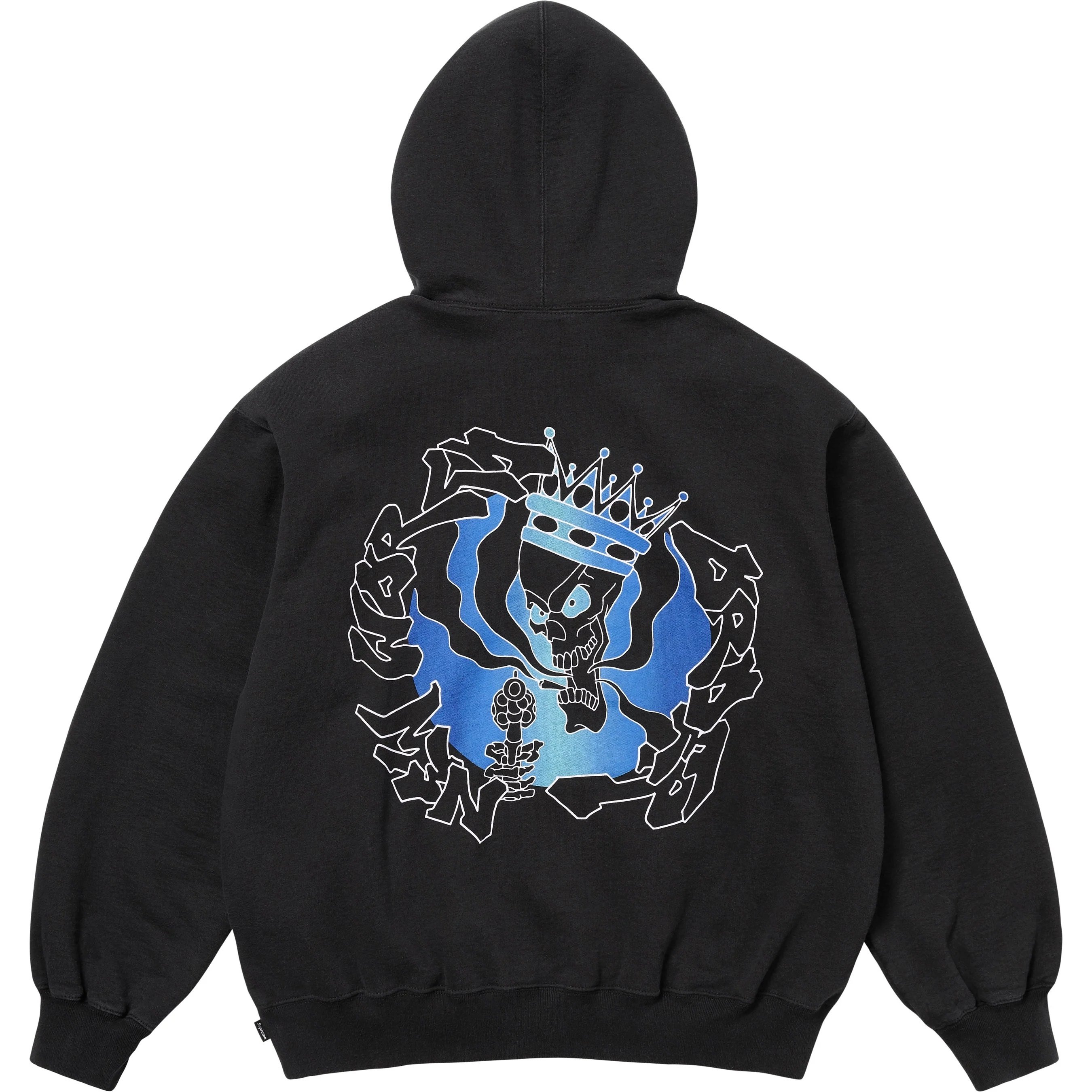Brushed-back fleece with pouch pocket. Printed logo on pouch pocket and hood. Printed graphic on back. Original artwork by Andre Thompson.