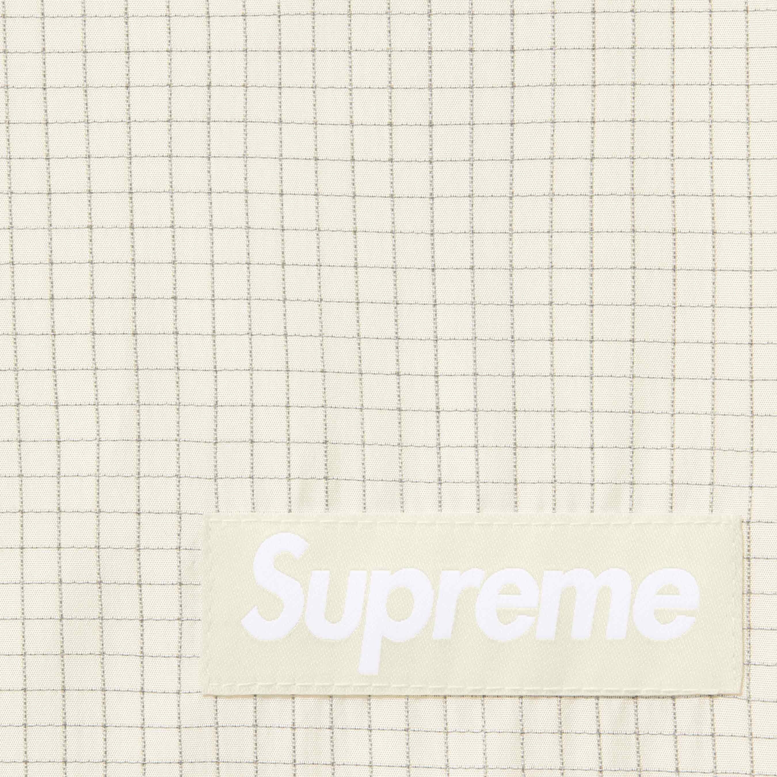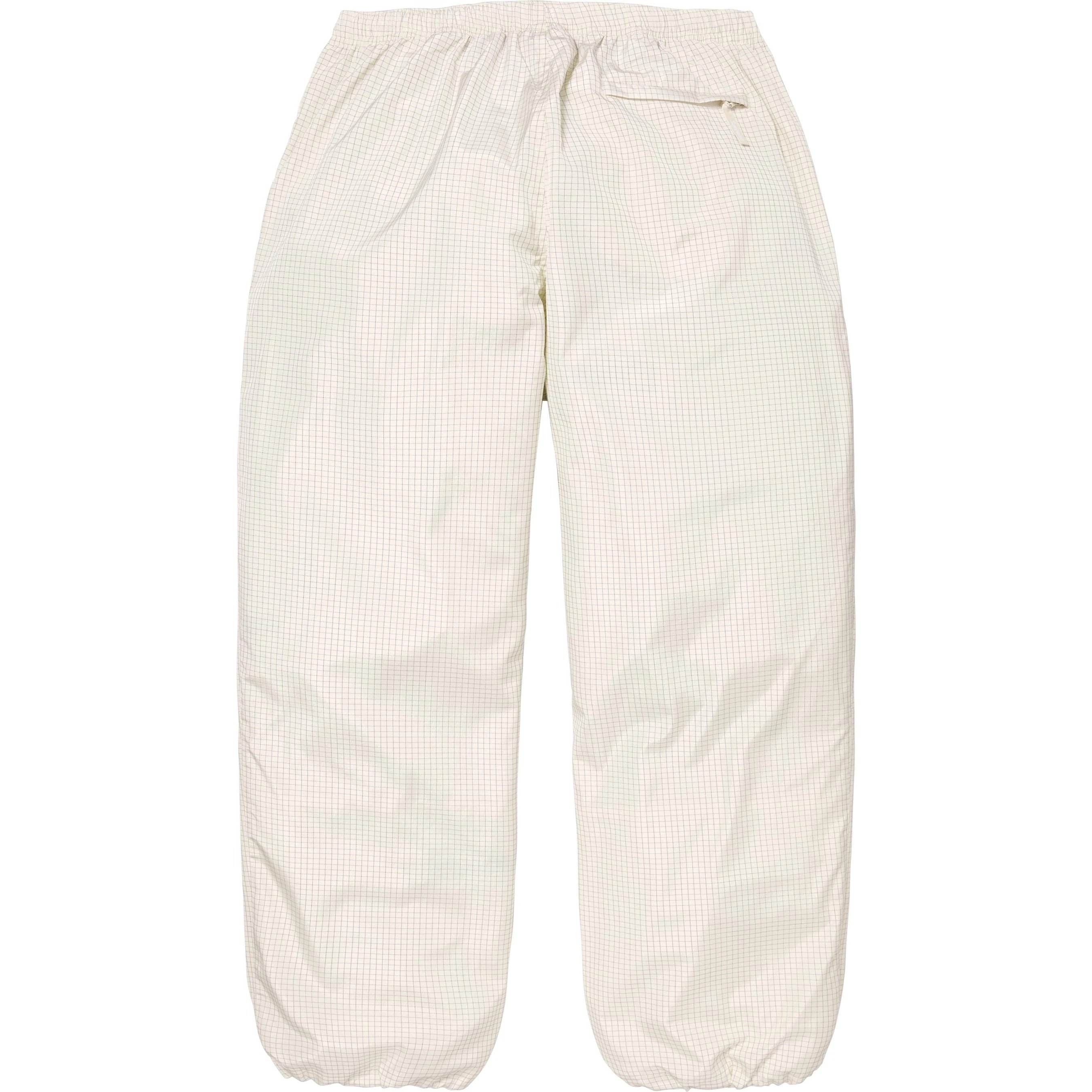 Water resistant reflective poly ripstop with mesh and taffeta lining. On seam zip hand pockets and single back zip pocket. Elastic waistband with interior drawcord and interior elastic shockcord at cuffs. Woven logo label at lower leg.