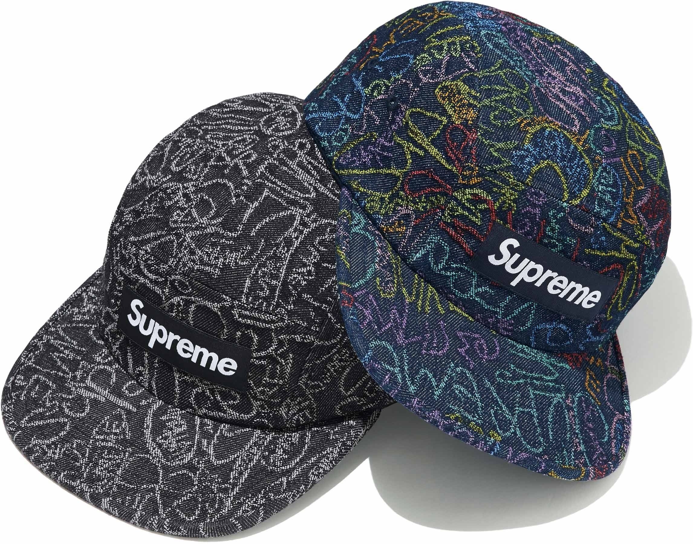All cotton denim Supreme camp cap with jacquard woven pattern.