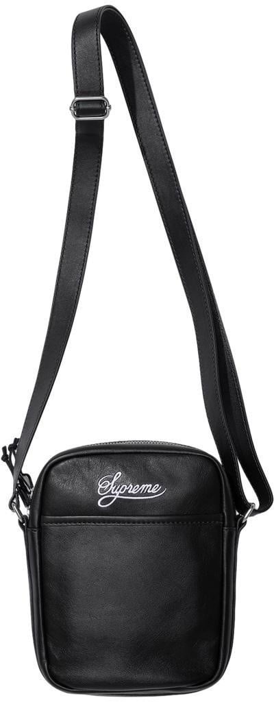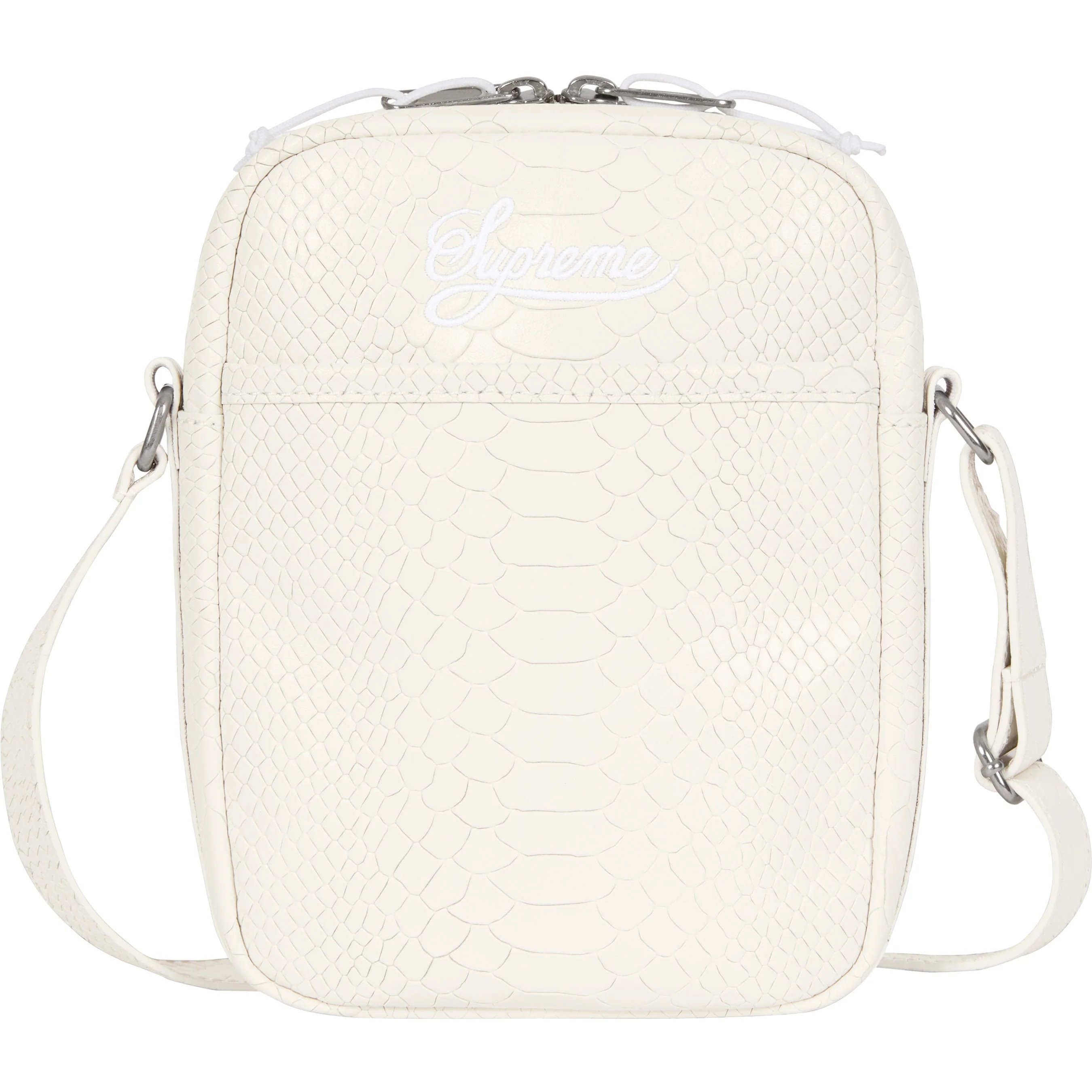 Cowhide leather with debossed snakeskin pattern and taffeta lining. Main zip compartment with interior zip pocket. Pouch pocket at back. Adjustable shoulder strap. Leather appliqué with debossed snakeskin pattern at front. Embroidered logo on back. 2L. Made exclusively for Supreme.