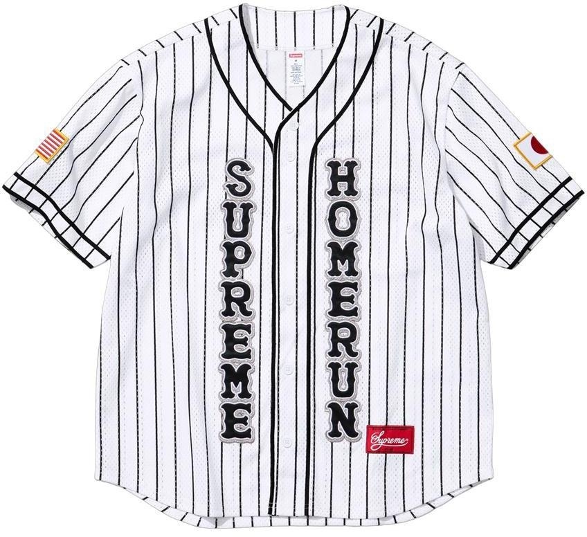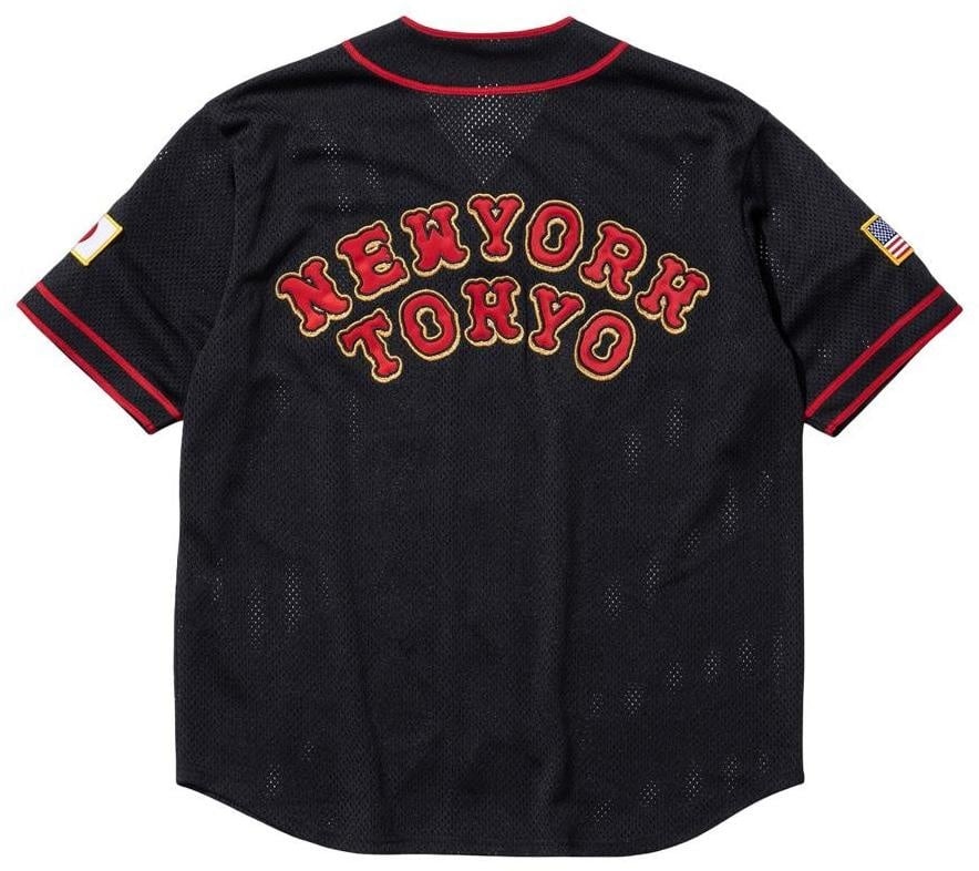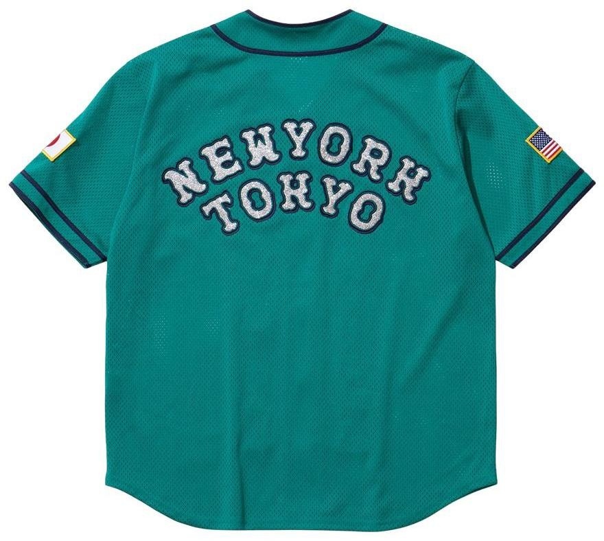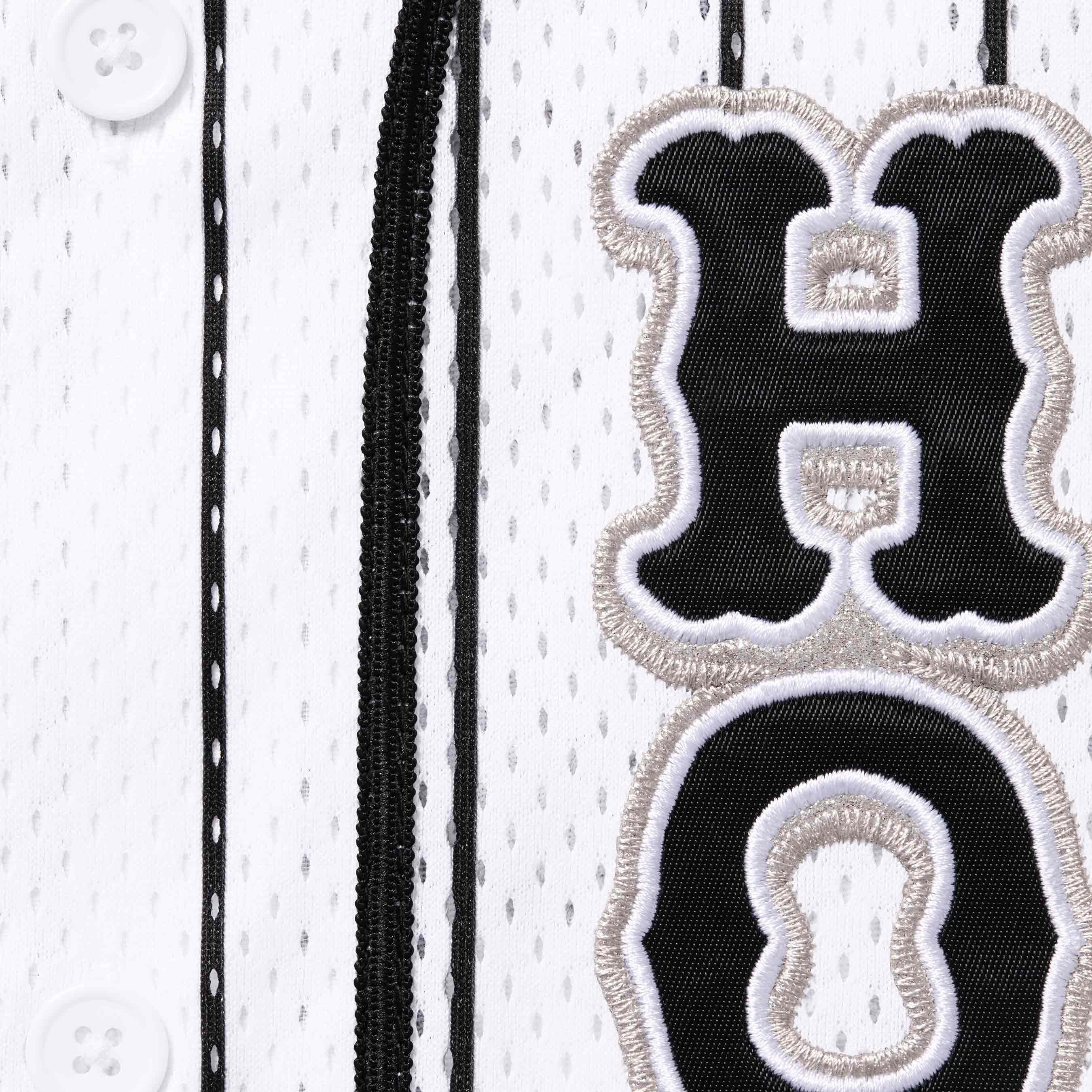 Poly eyelet mesh jersey with button front closure. Tackle twill appliqué at front and back. Embroidered patches on sleeves and athletic label at lower front.