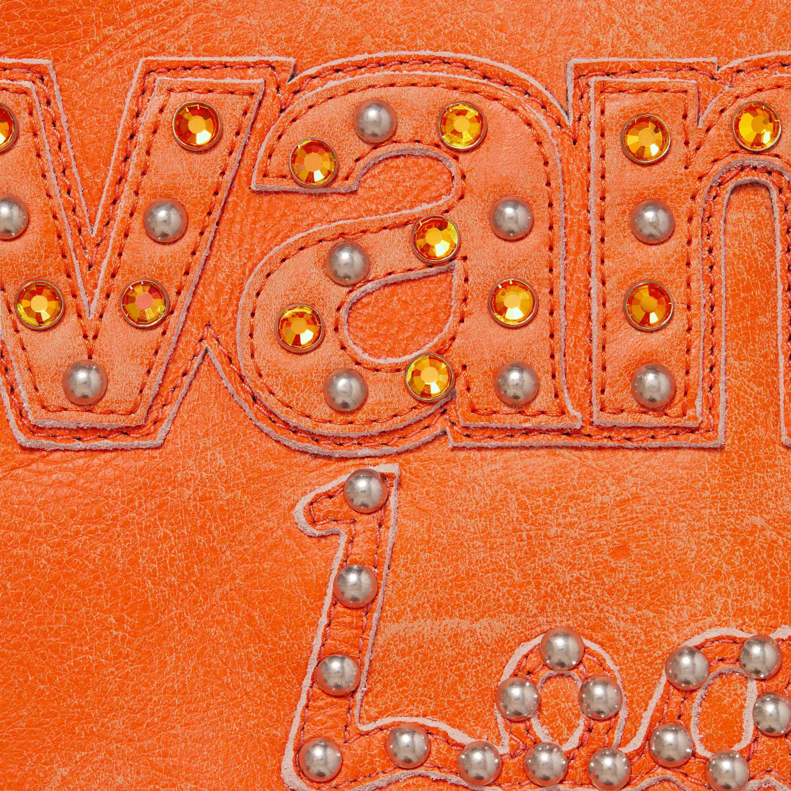 Cowhide leather with rhinestones and metal studs throughout, fill and quilted nylon lining. Full zip closure with double welt zip hand pockets at lower front and interior chest pockets. Knit rib cuffs and hem. Studded leather logo appliqué at front, sleeves and back. Embroidered logo patches on sleeves. Rhinestone studded metal logo plate at back neck. Made in the USA exclusively for Supreme.