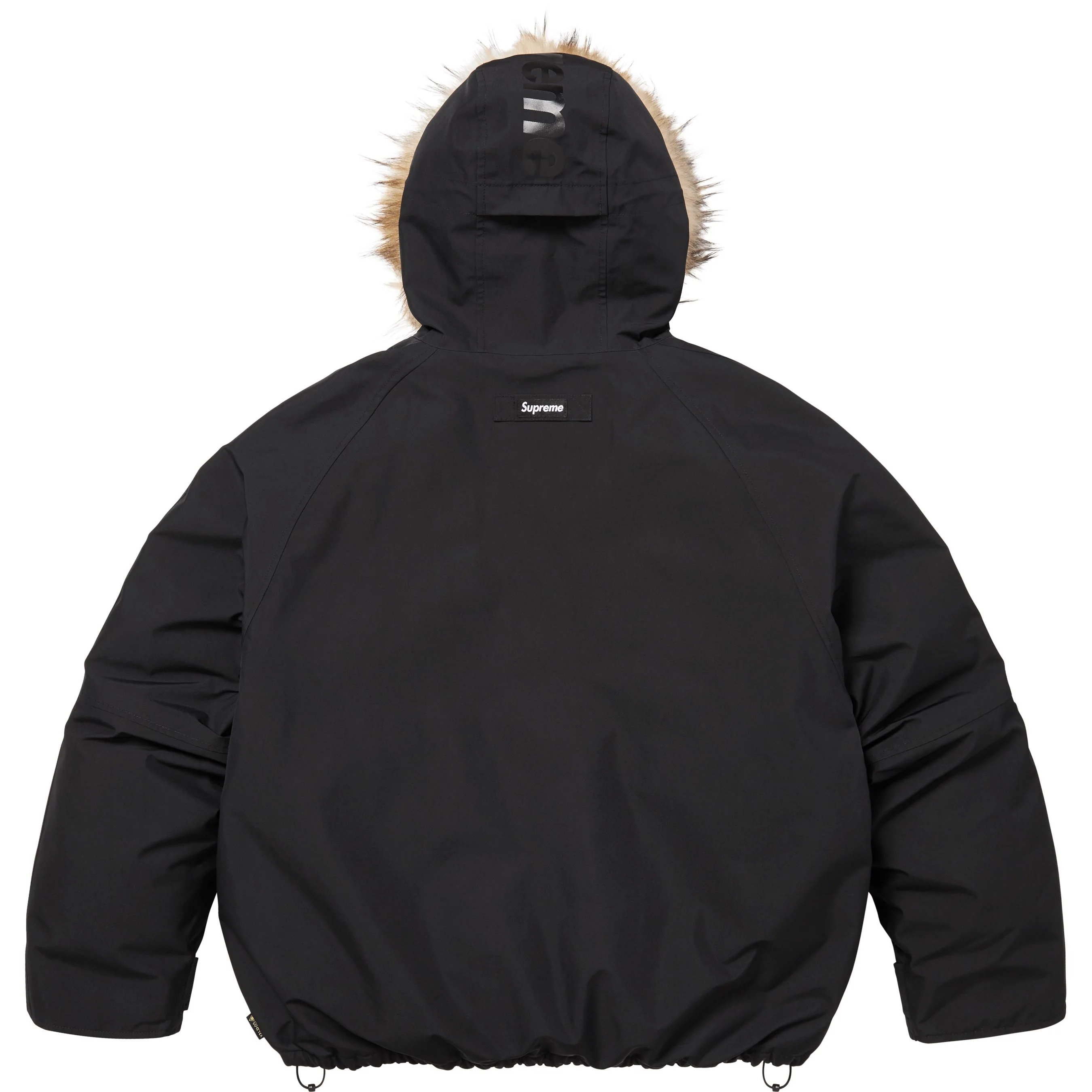 Waterproof, breathable GORE-TEX 2-Layer poly shell with taped seams, embossed logo nylon lining and removable liner jacket. Shell with full zip closure and hidden snap placket. Snap flap hand pockets at lower front, welt zip hand pockets at chest and interior zip pocket. Fixed hood with interior elastic shockcord and removable faux fur trim. Interior elastic shockcord at hem with velcro tab adjusters at cuffs. Woven logo patch at hem with transparent printed logo on hood. Embroidered logos on hood and cuff. Water resistant, removable and reversible nylon liner jacket with 700-Fill down insulated quilted baffles. Full zip closure with pouch pocket at lower front. Knit rib cuffs and hem with embroidered graphic at cuff. Reverse side with welt hand pockets at lower front and embroidered logo patch on chest.