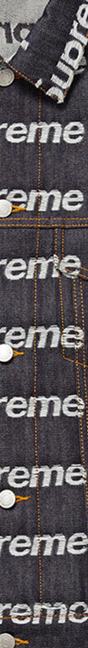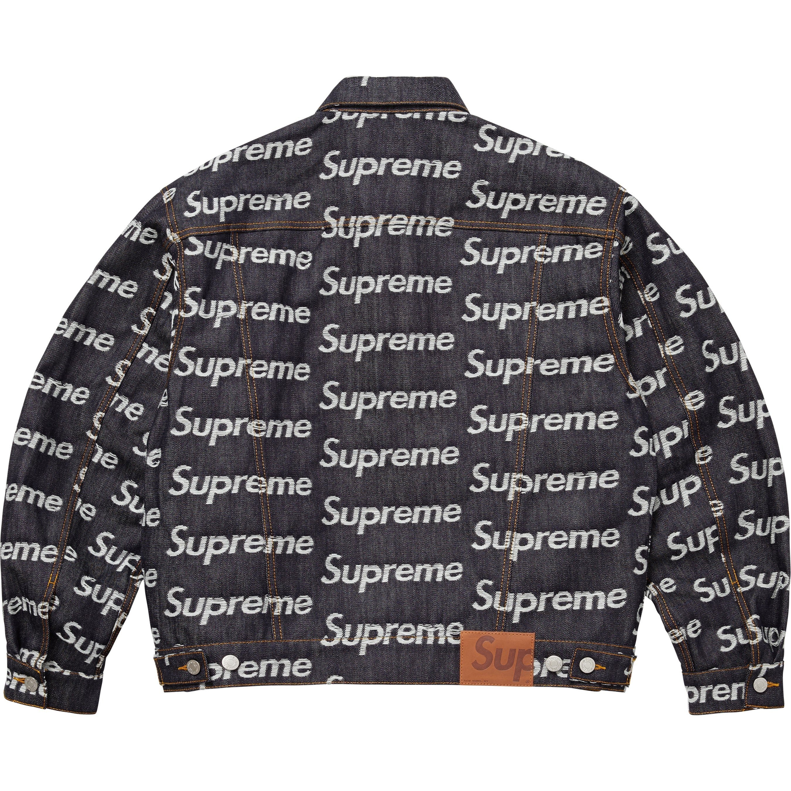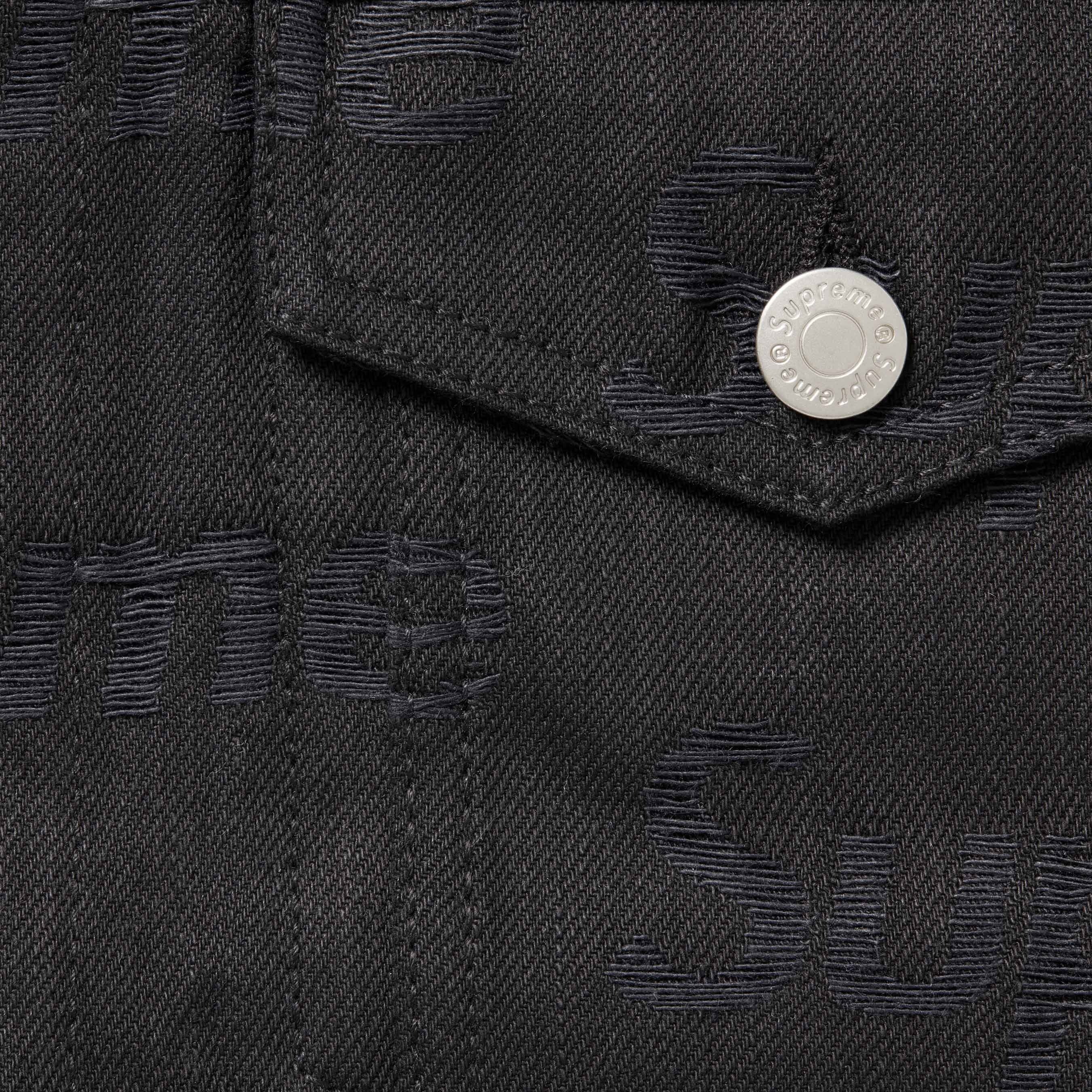 All cotton 14 oz. denim with frayed jacquard logo pattern. Button front closure with on seam hand pockets at lower front and button flap patch pockets at chest. Tab adjusters at cuffs and back hem with leather logo patch.