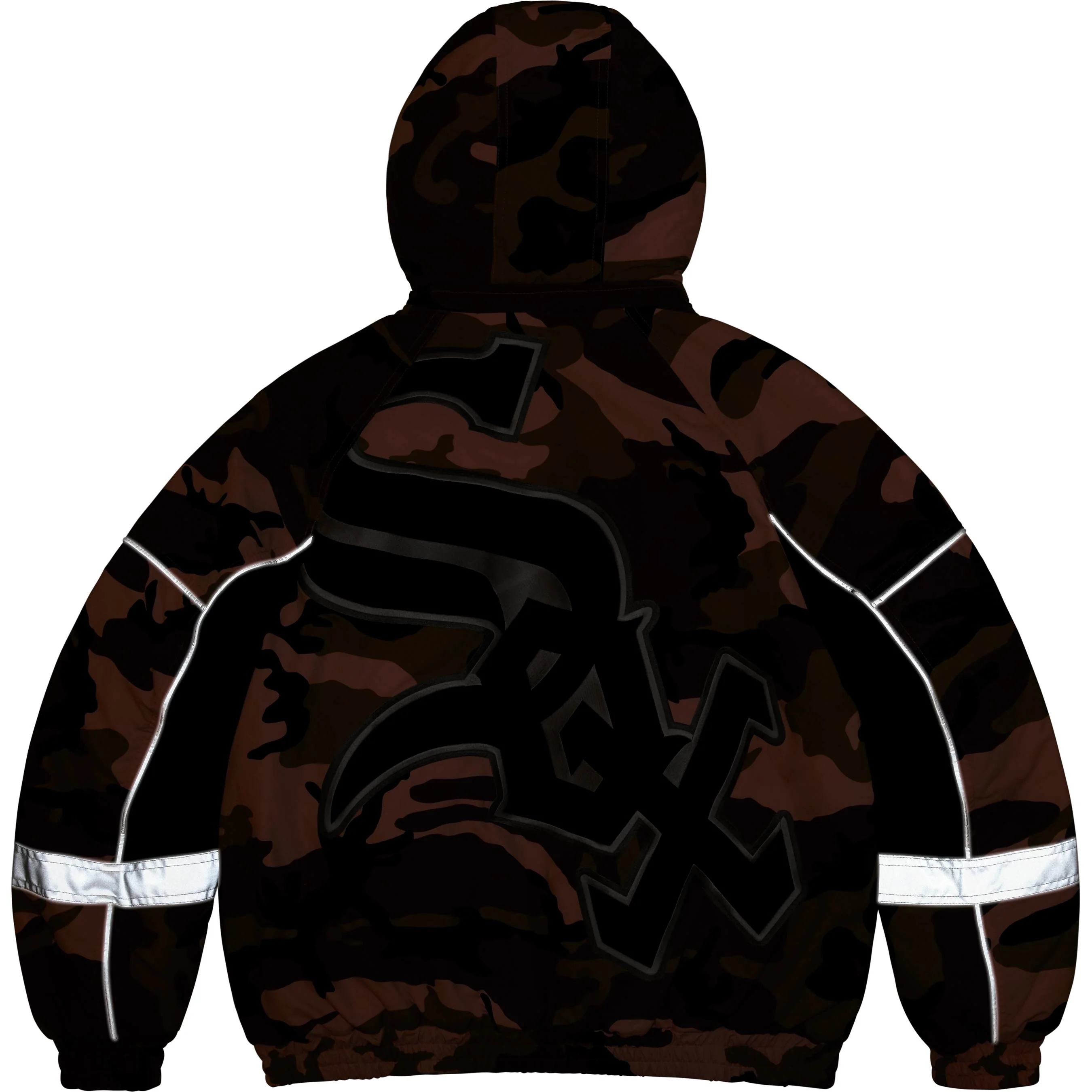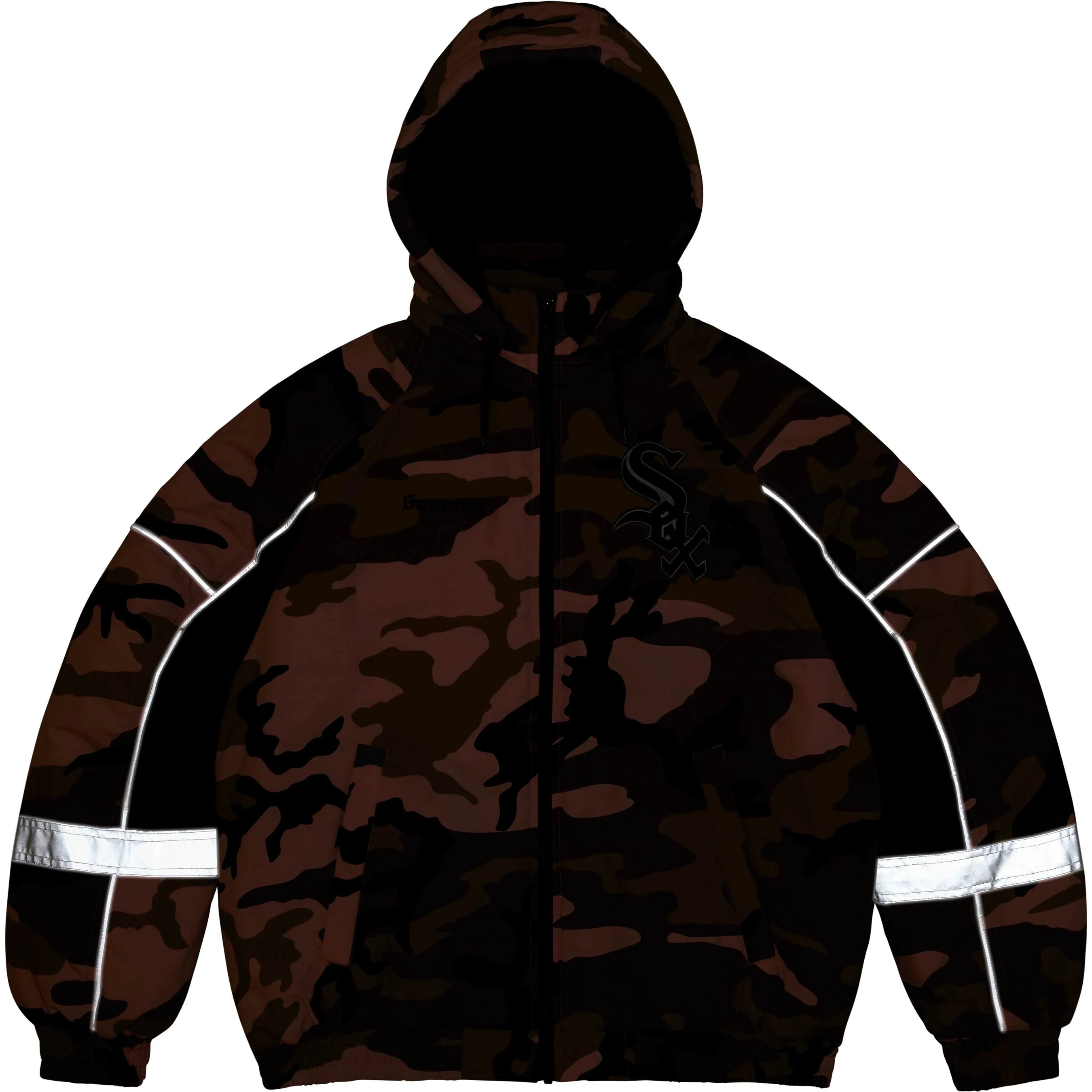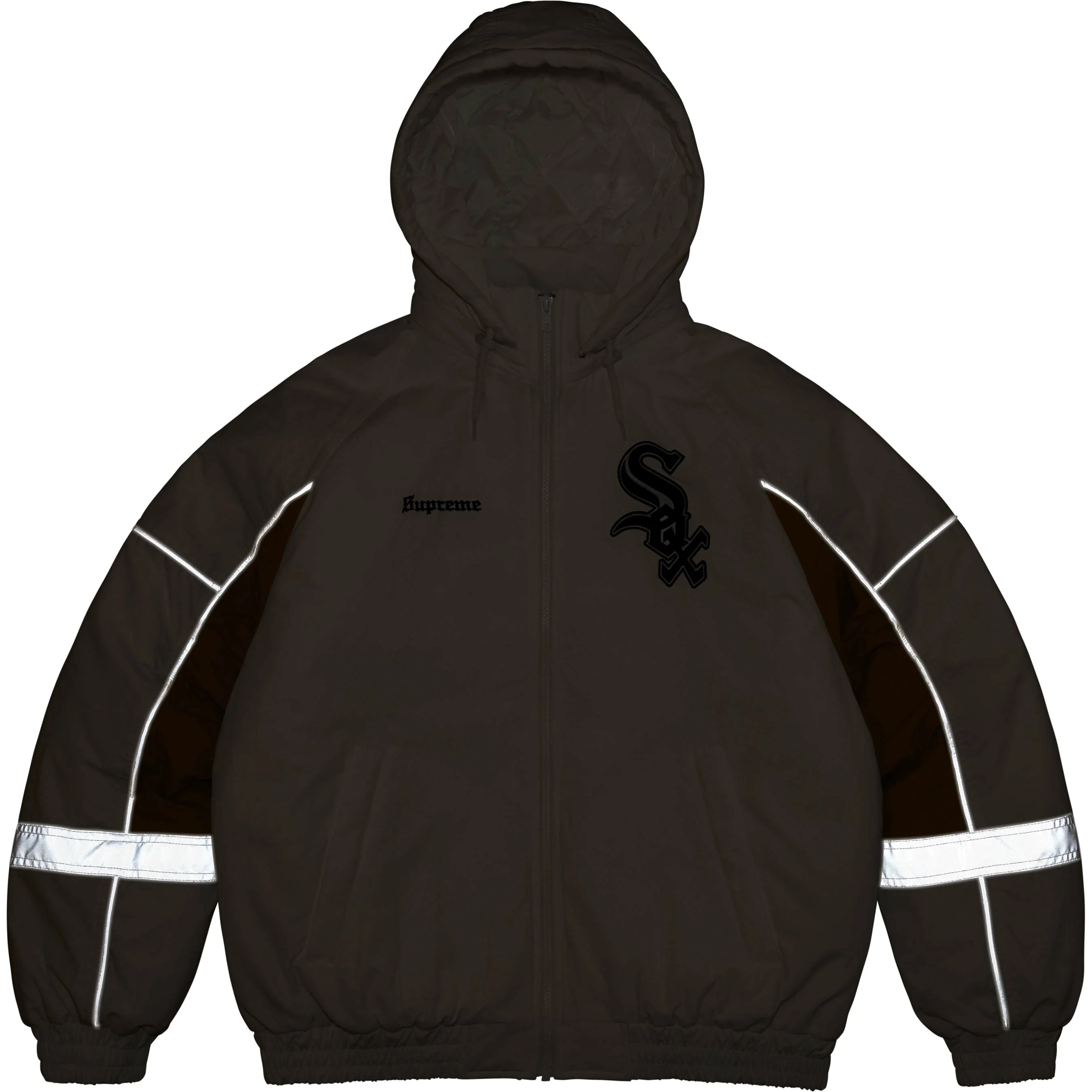 Water resistant Supplex® nylon taslan with 3M® Thinsulate™ insulation and quilted taffeta lining. Full zip closure with welt zip hand pockets at lower front and interior chest pocket. Removable hood with elastic cuffs and hem. 3M® Reflective piping and stripe at cuffs. Embroidered logos on chest and back neck. Graphic appliqué at chest and back. Official White Sox™ merchandise made exclusively for Supreme.