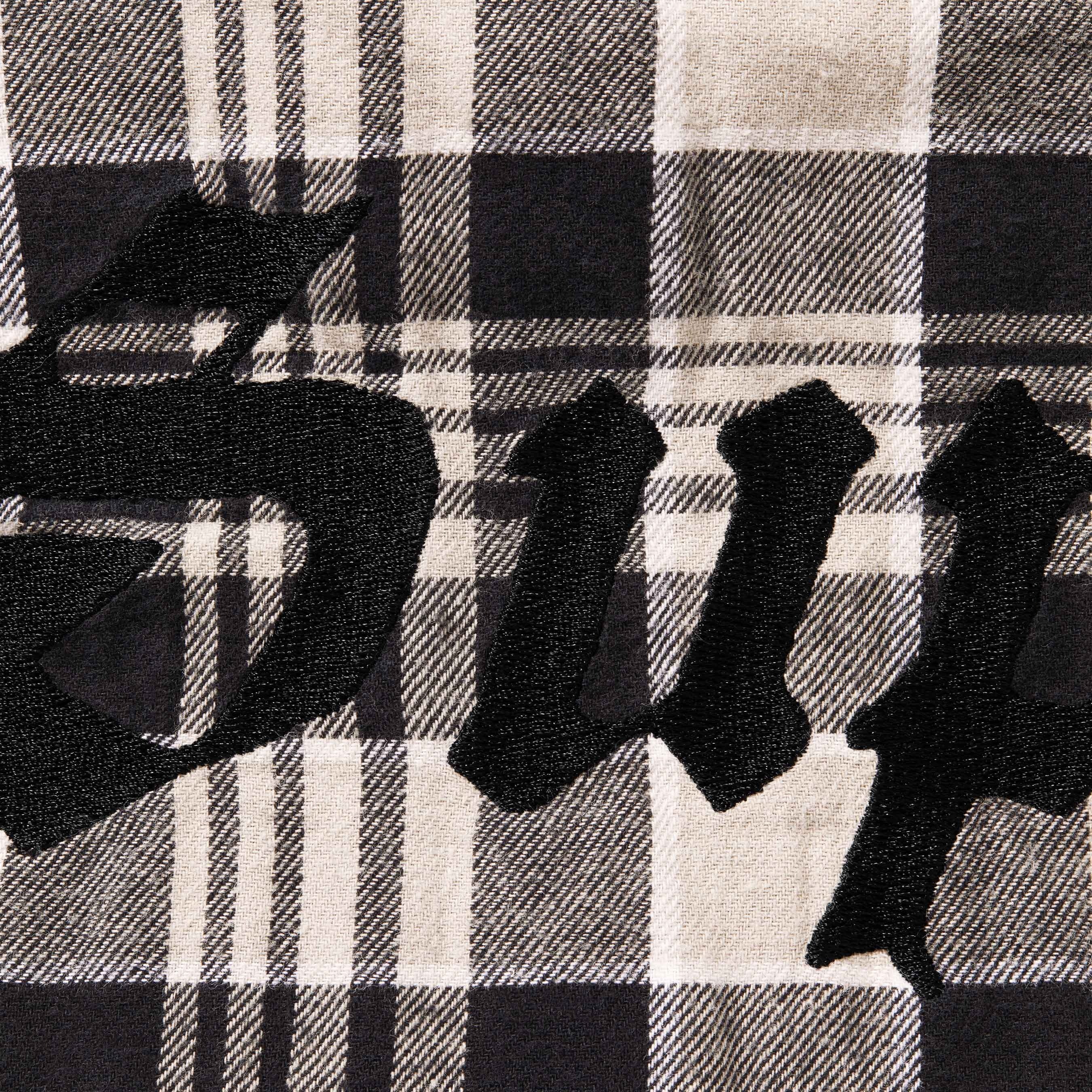 All cotton flannel with faux shearling lining and quilted filled taffeta sleeve lining. Full zip closure with on seam hand pockets at lower front and utility pockets at chest. Embroidered logo on back.