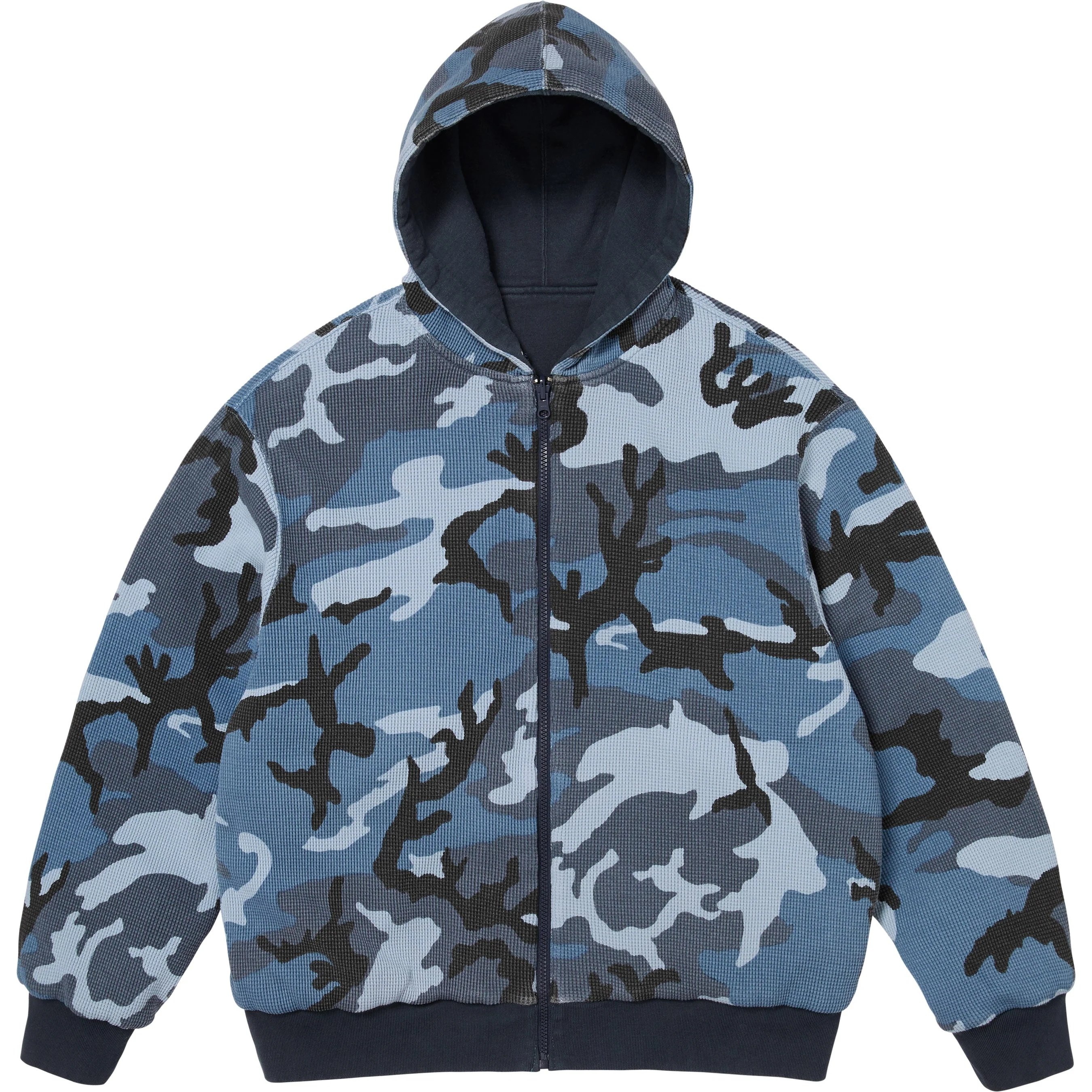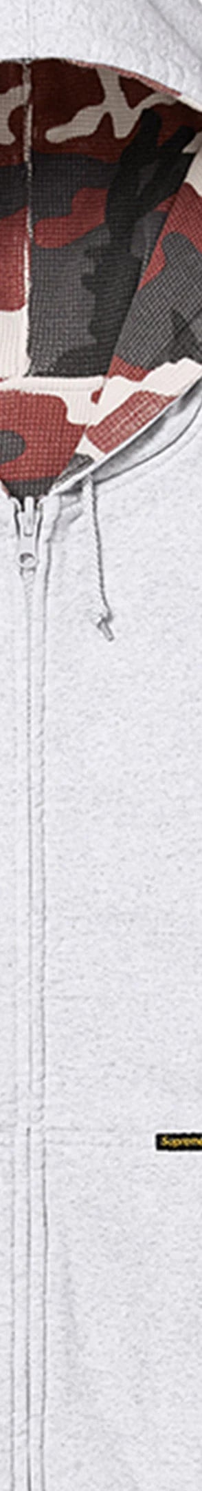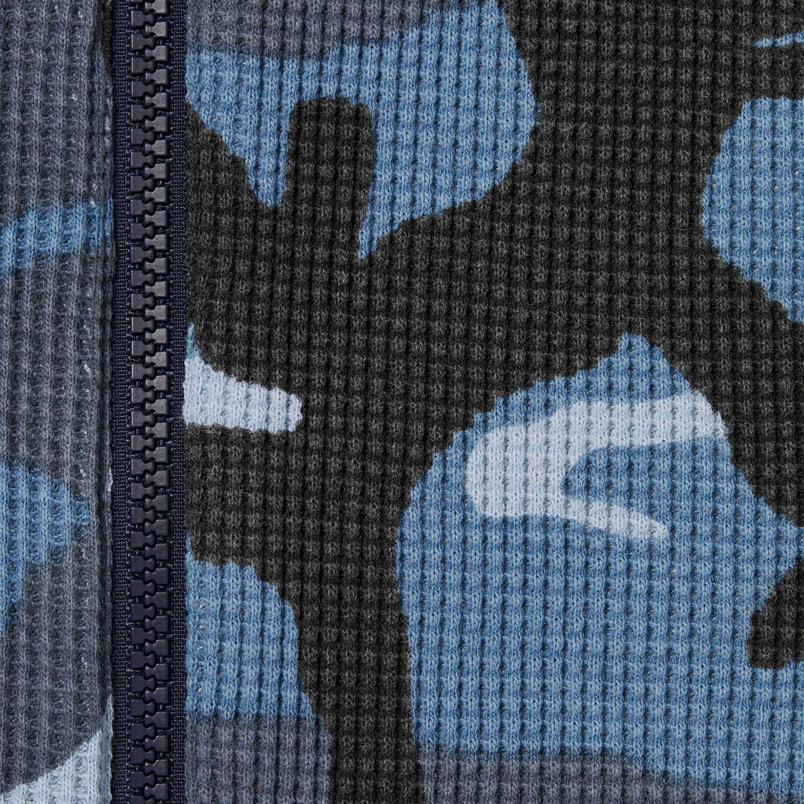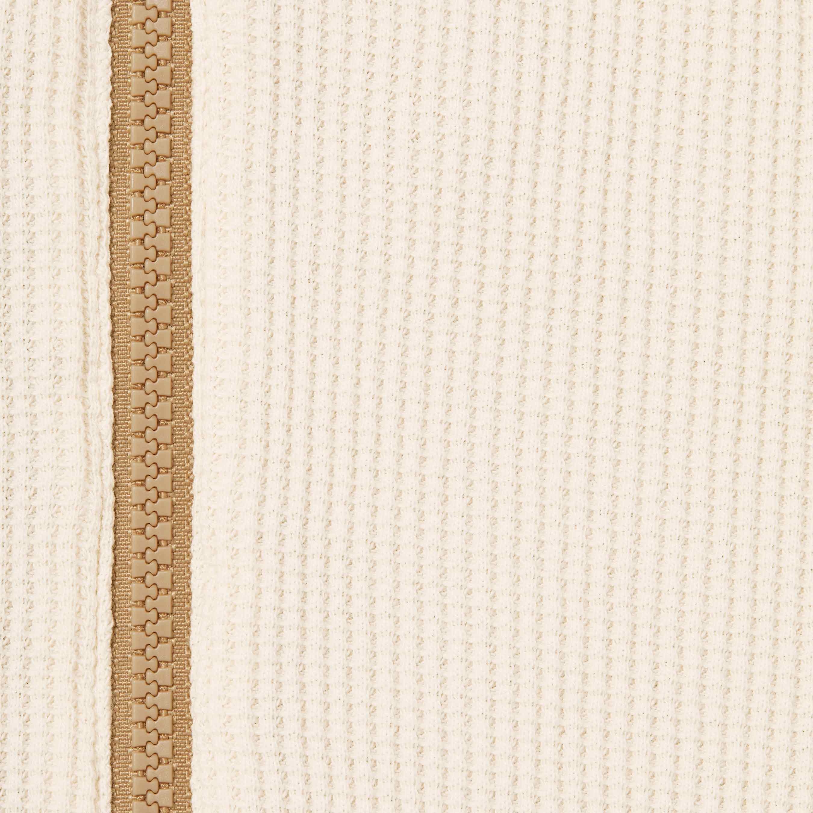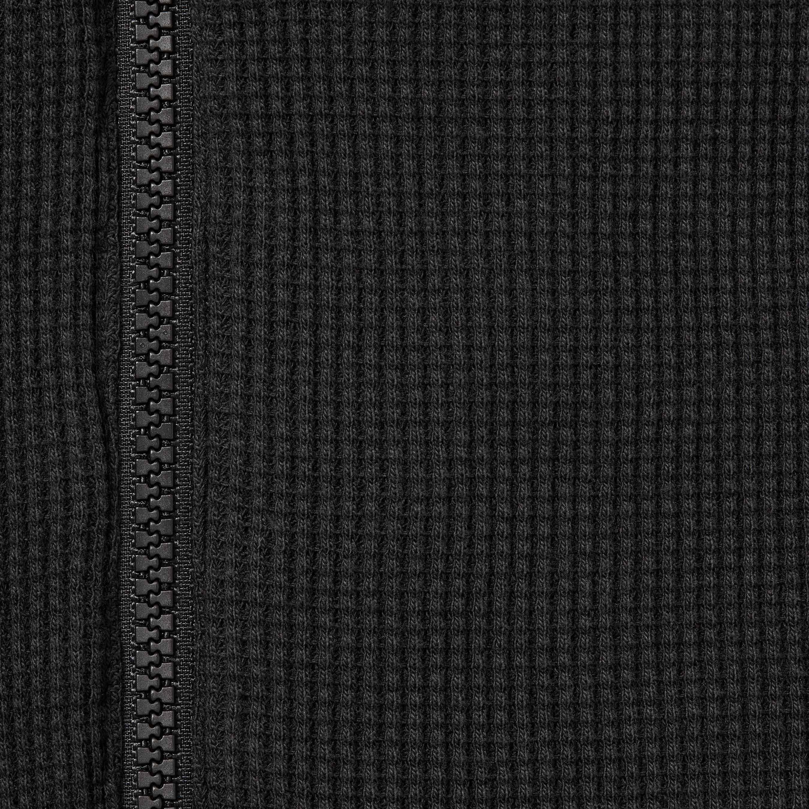 Brushed-back fleece with full zip closure and pouch pocket. Cotton waffle thermal reverse side with on seam hand pockets at lower front.