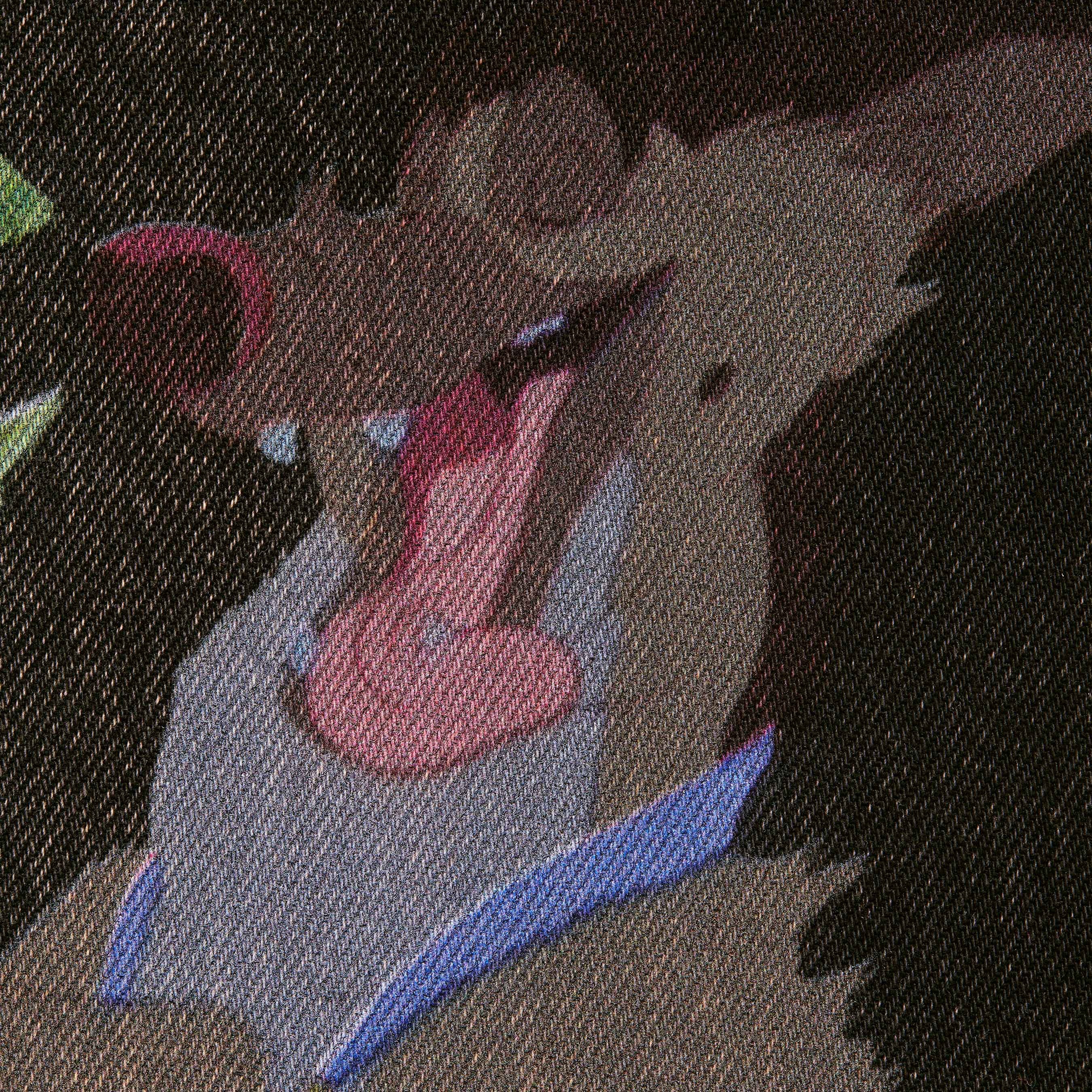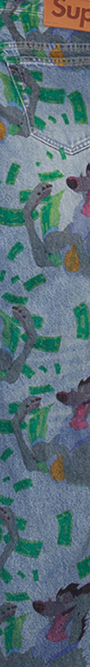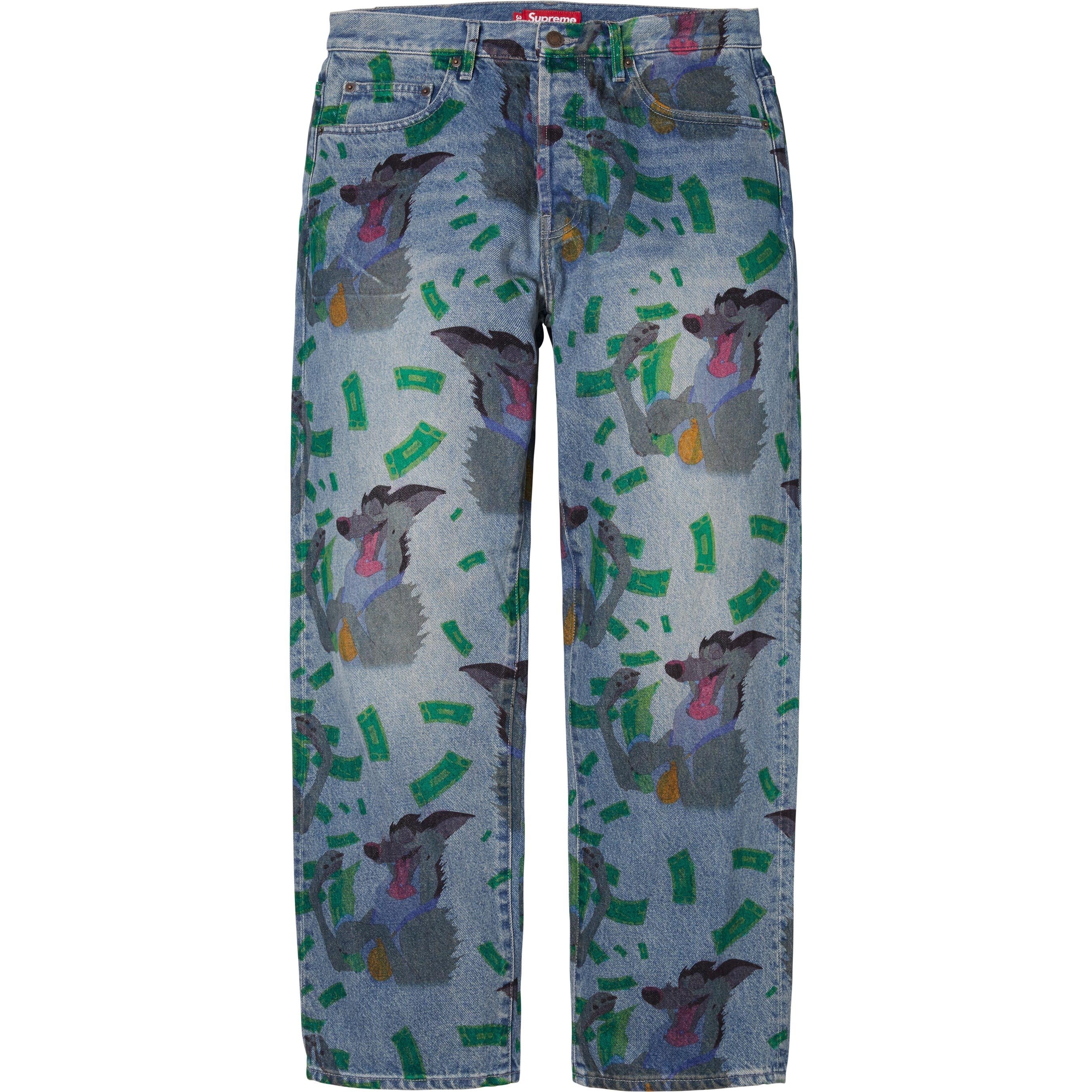 All cotton 13 oz. denim with printed graphic and loose fit. Classic 5-pocket style with button fly, single coin pocket, copper oxide rivets and leather logo patch on back.