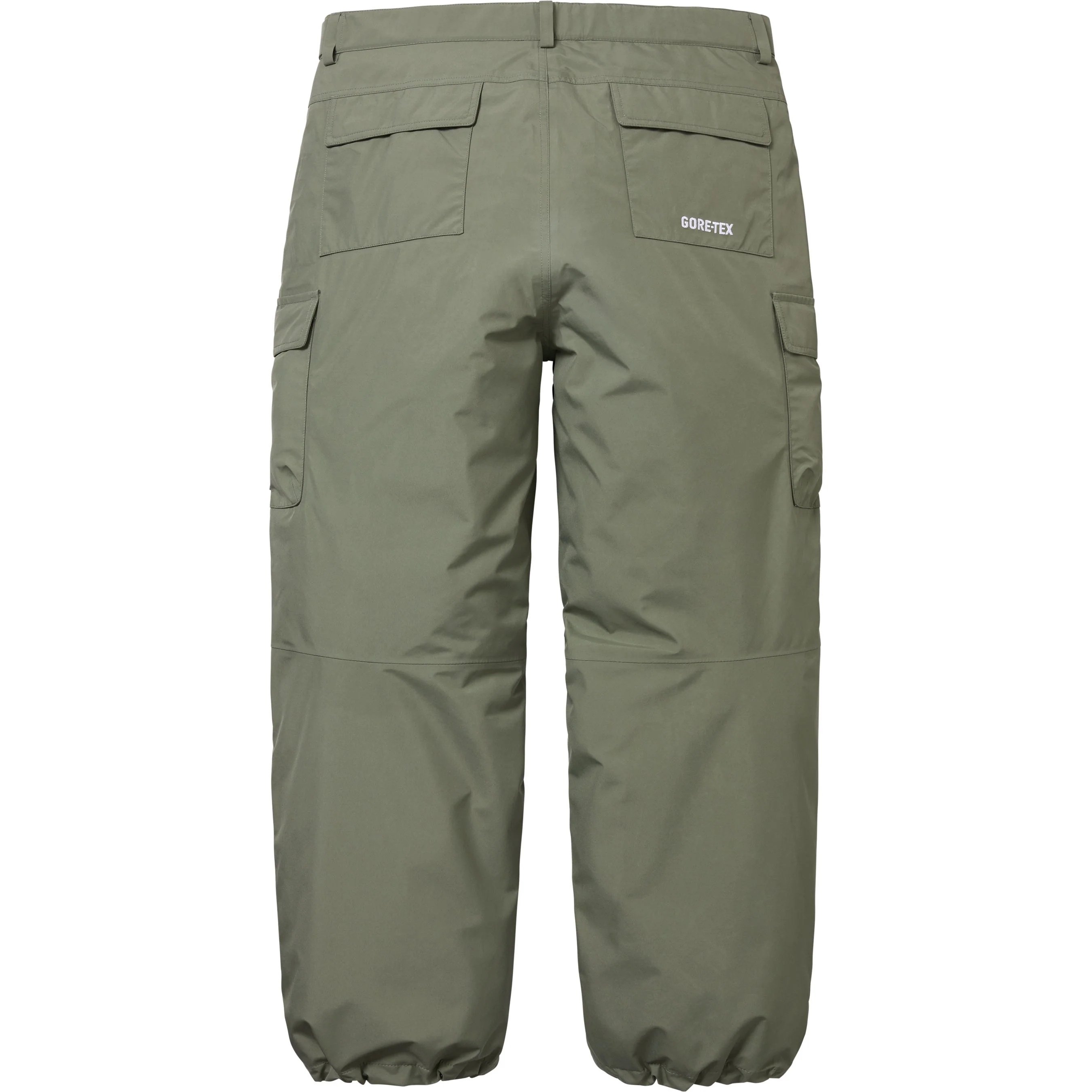 Waterproof, breathable GORE-TEX 3-Layer poly shell with taped seams and tricot backing. On seam zip hand pockets with velcro flap patch pockets at seat and cargo pockets at thighs. Zip fly with snap closure and velcro tab adjusters at waist. Interior elastic shockcord at cuffs. Woven logo label at side pocket with embroidered logo at back pocket.