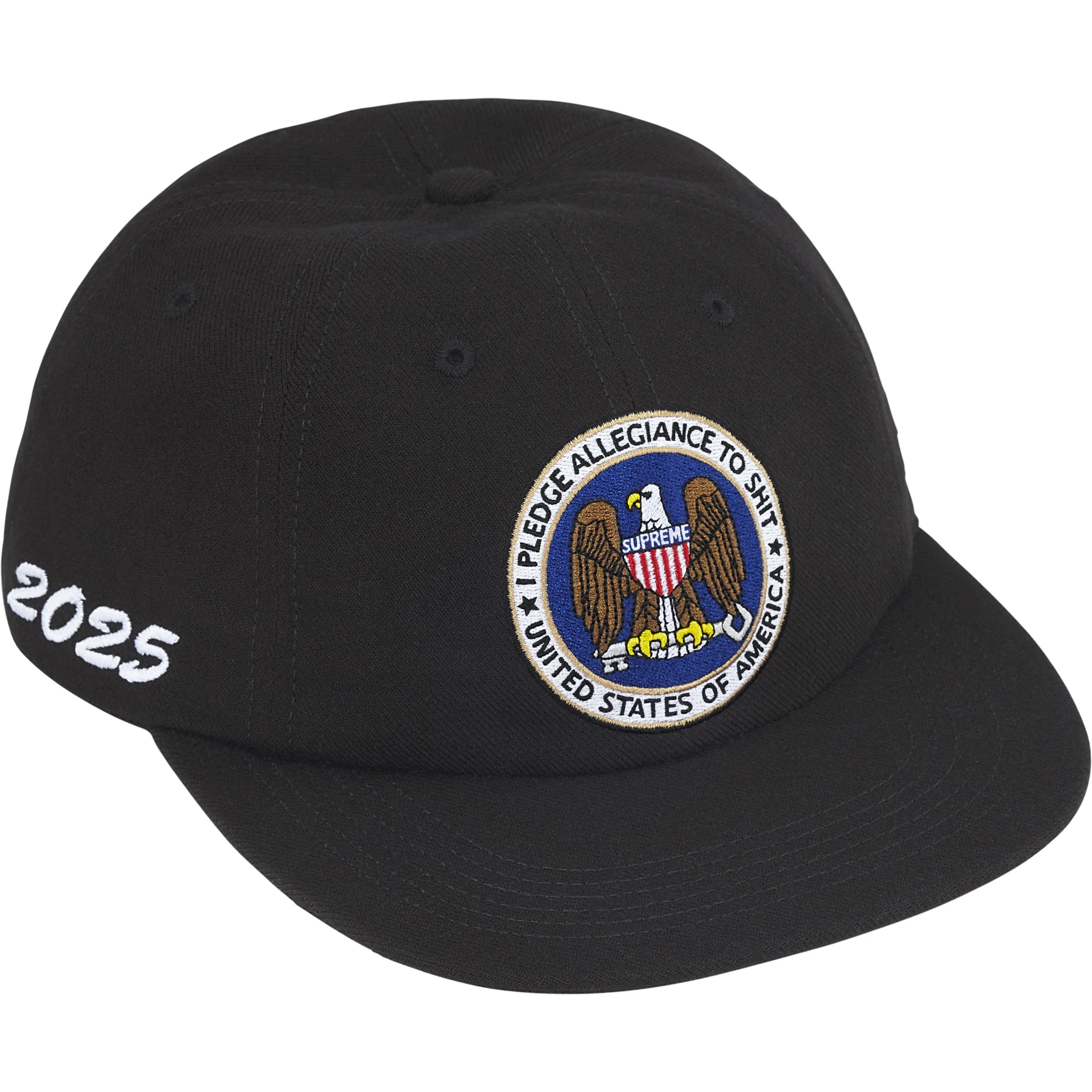 Wool blend 6-Panel hat with snap closure. Embroidered graphic on front and side. Embroidered logo on back.
