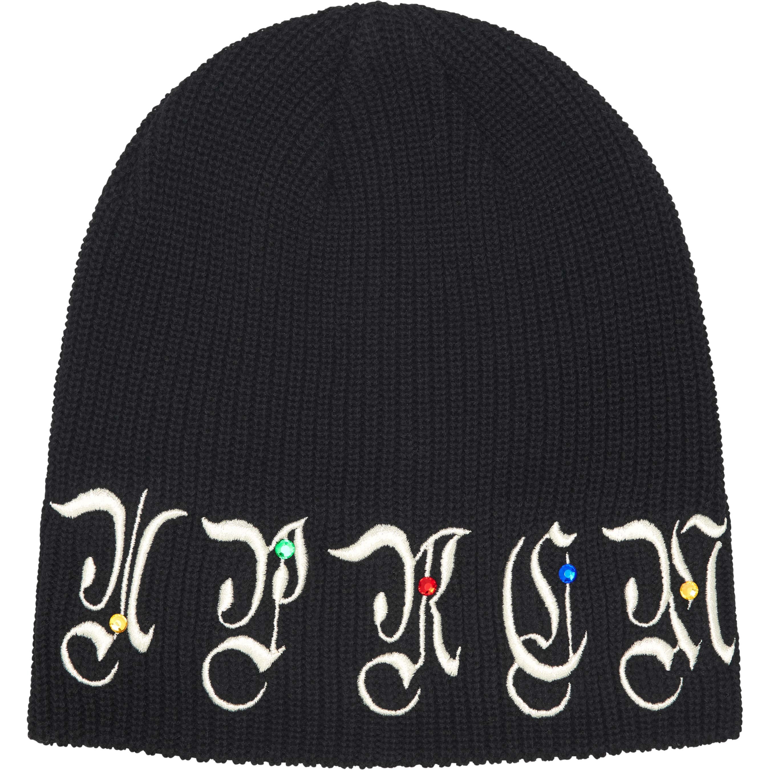 Acrylic beanie with embroidered logo and rhinestone studs. Original embroidered artwork by AOI.