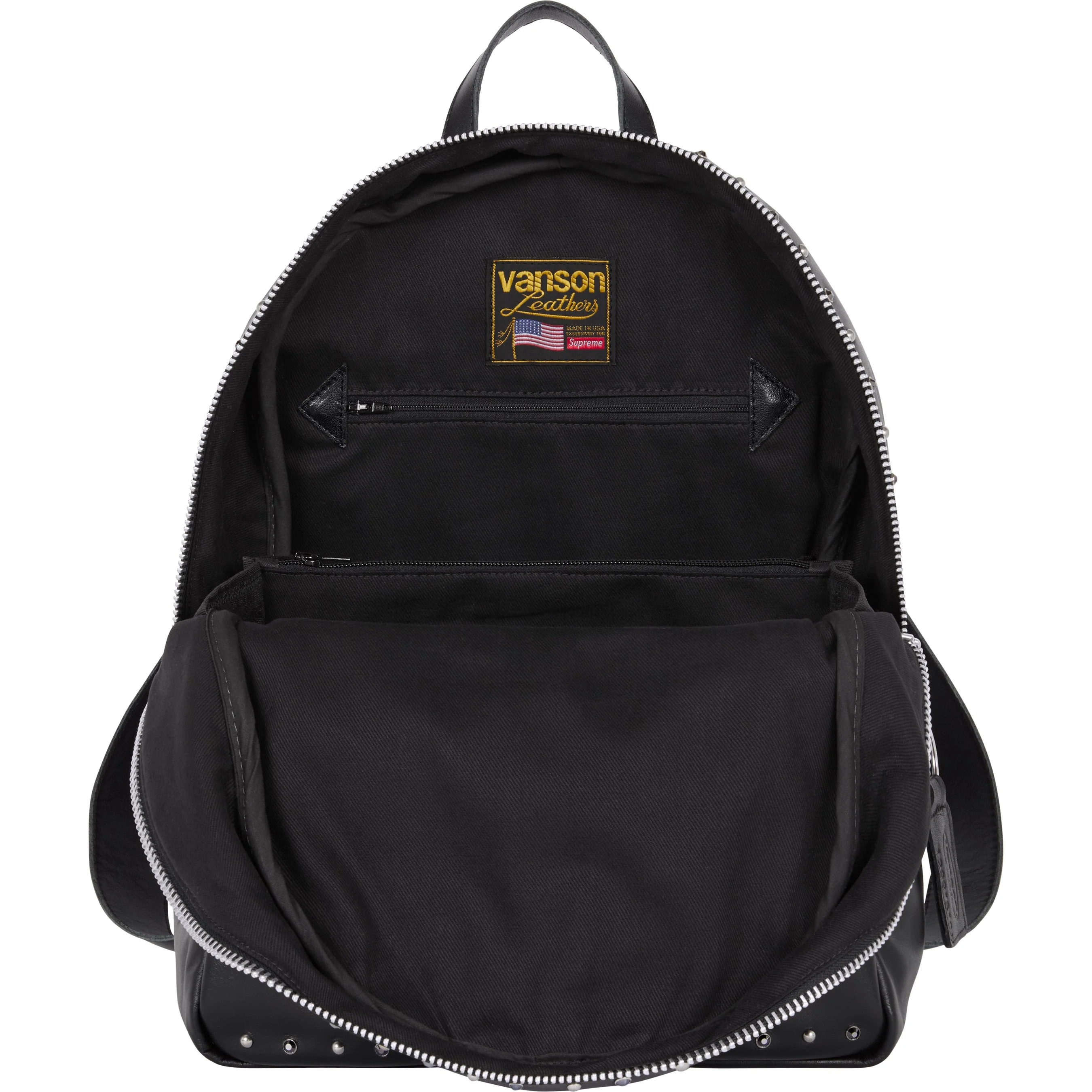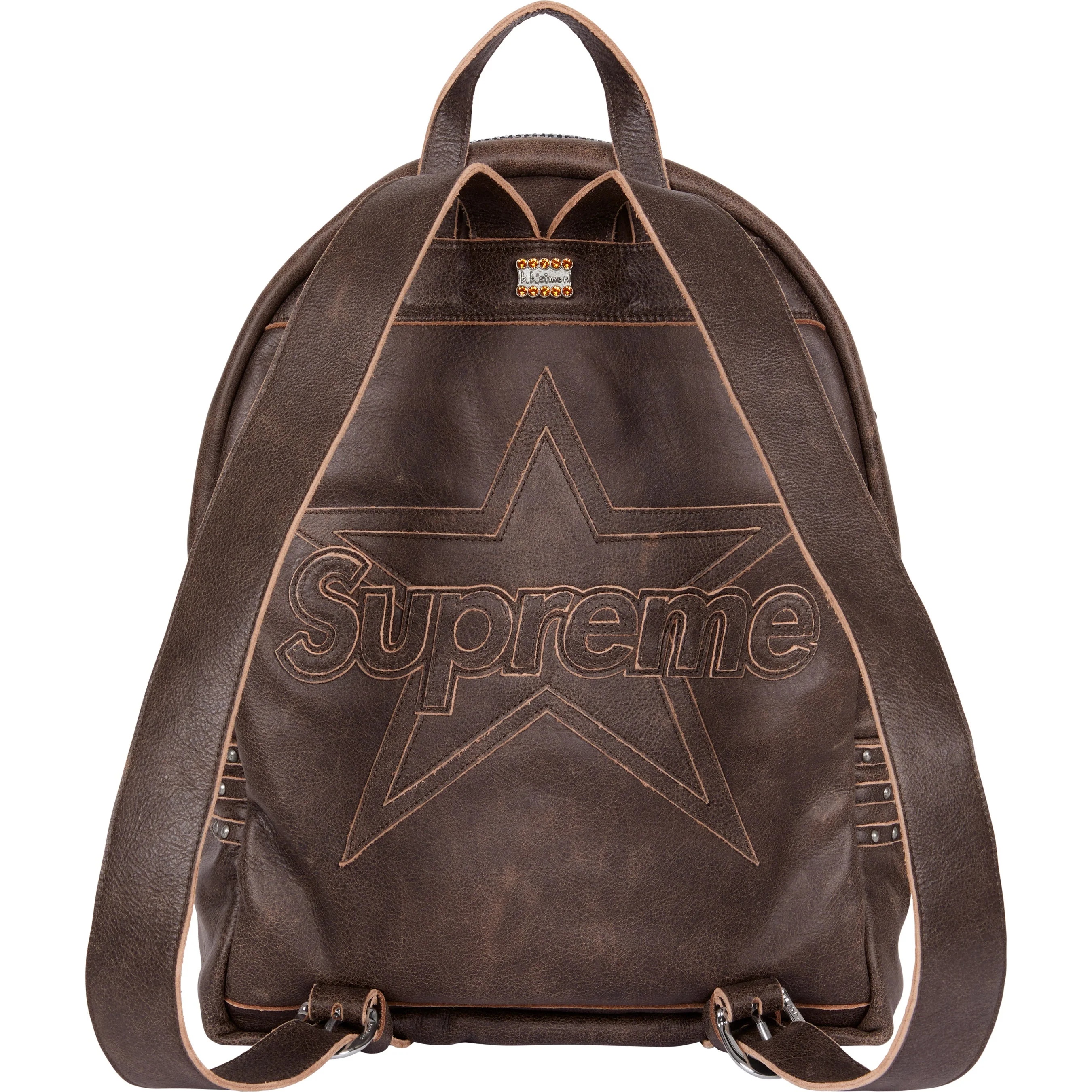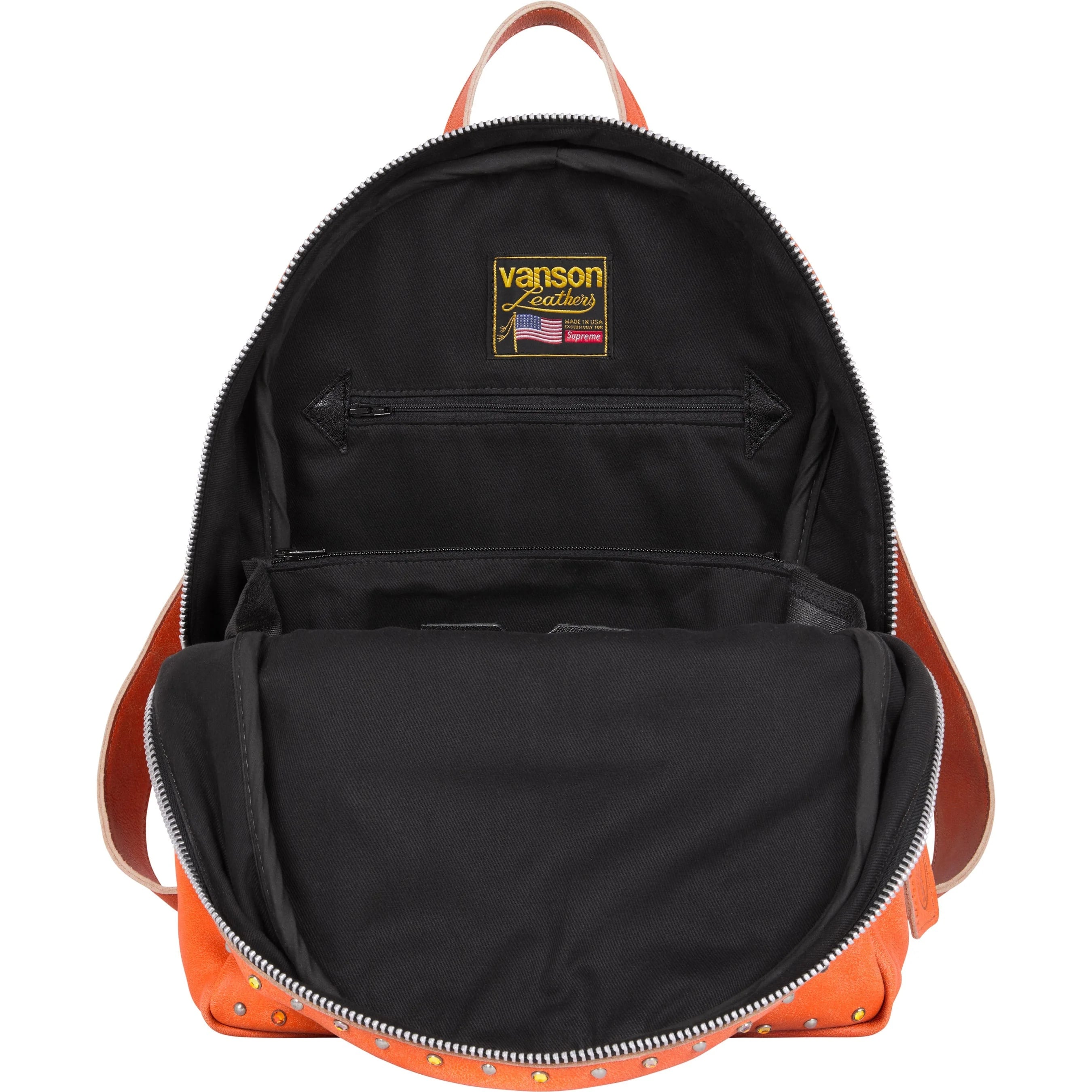 Cowhide leather with rhinestones and metal studs throughout, and cotton lining. Main zip compartment with interior divider pouch pockets, two zip pockets and two leather card slots. Additional front zip pocket. Adjustable leather backpack straps with buckle closure. Studded leather logo appliqué at front and back. Embroidered logo patches on front and studded metal logo plate at back. 16" x 12" x 6". 20L. Made in the USA exclusively for Supreme.