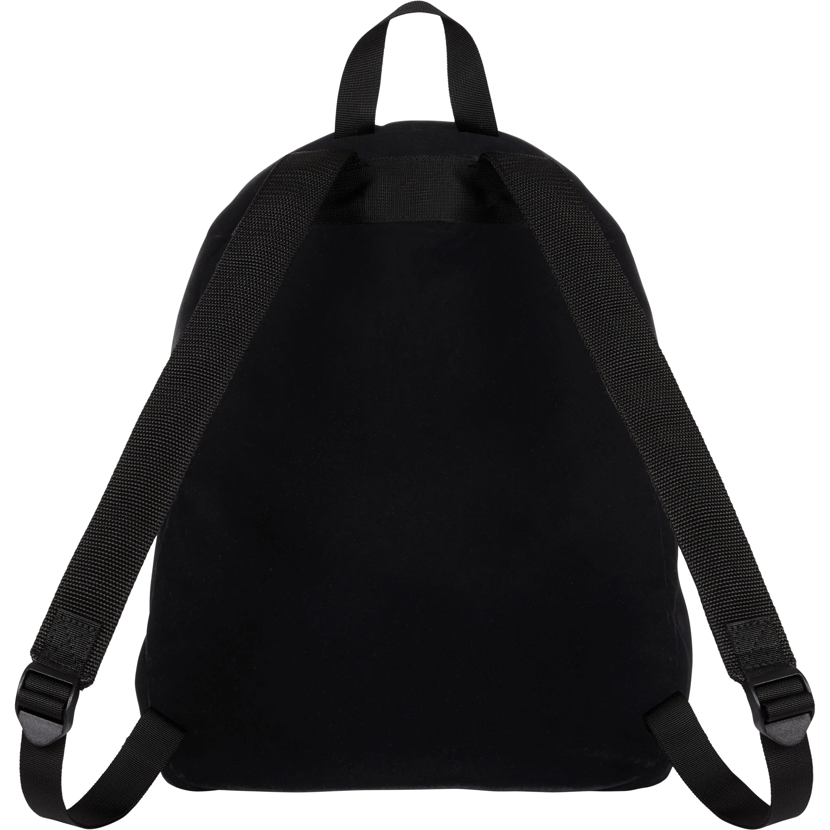 Nylon with velvet flocking and cotton ripstop lining. Main zip compartment and front zip pocket. Woven logo label at front. Metal pin and pinback button included. 16.2" x 14.2" x 8.3". 25L.