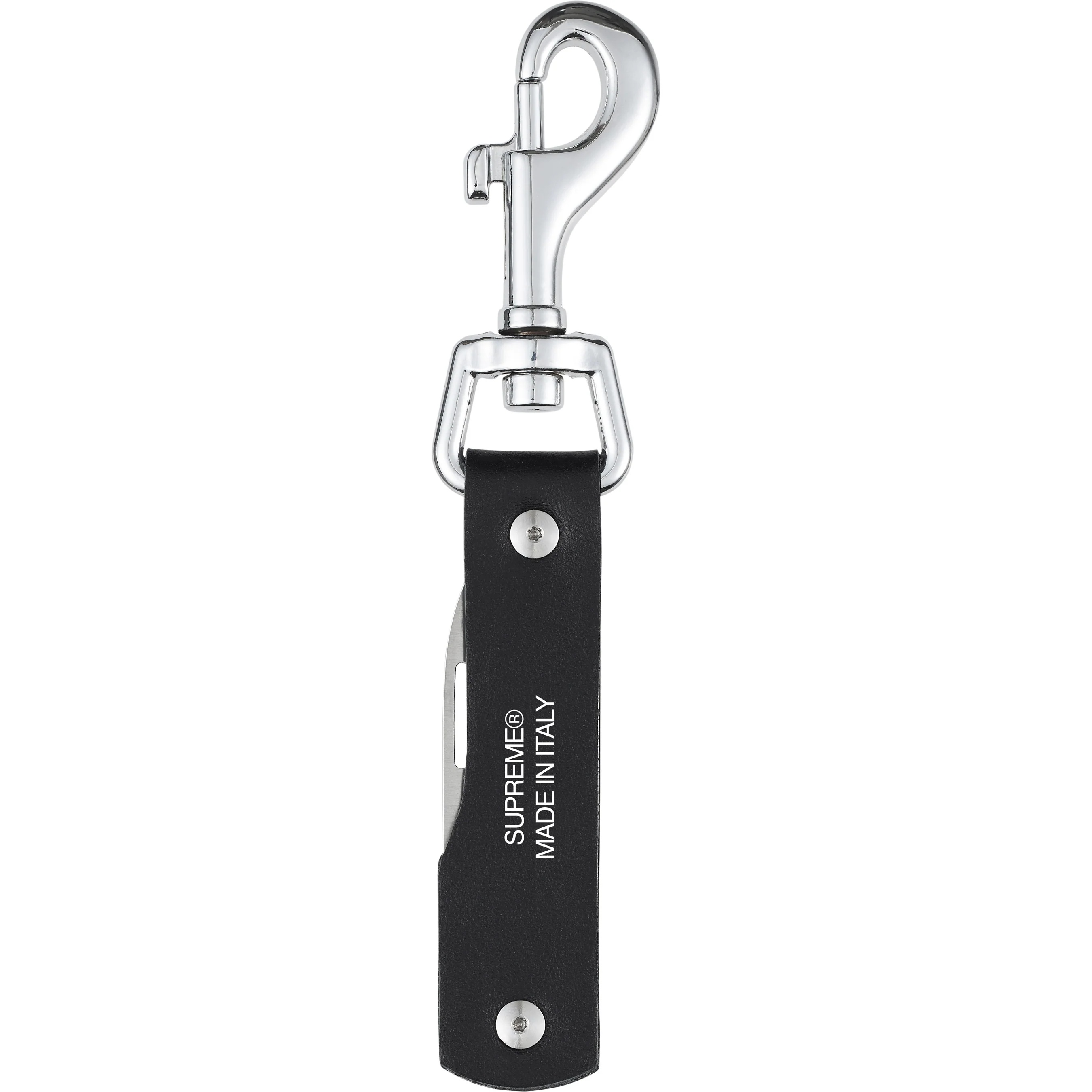 Stainless steel pen knife with printed logo calfskin leather casing and bolt snap closure. 5" with 1.9" blade. Made in Italy.
