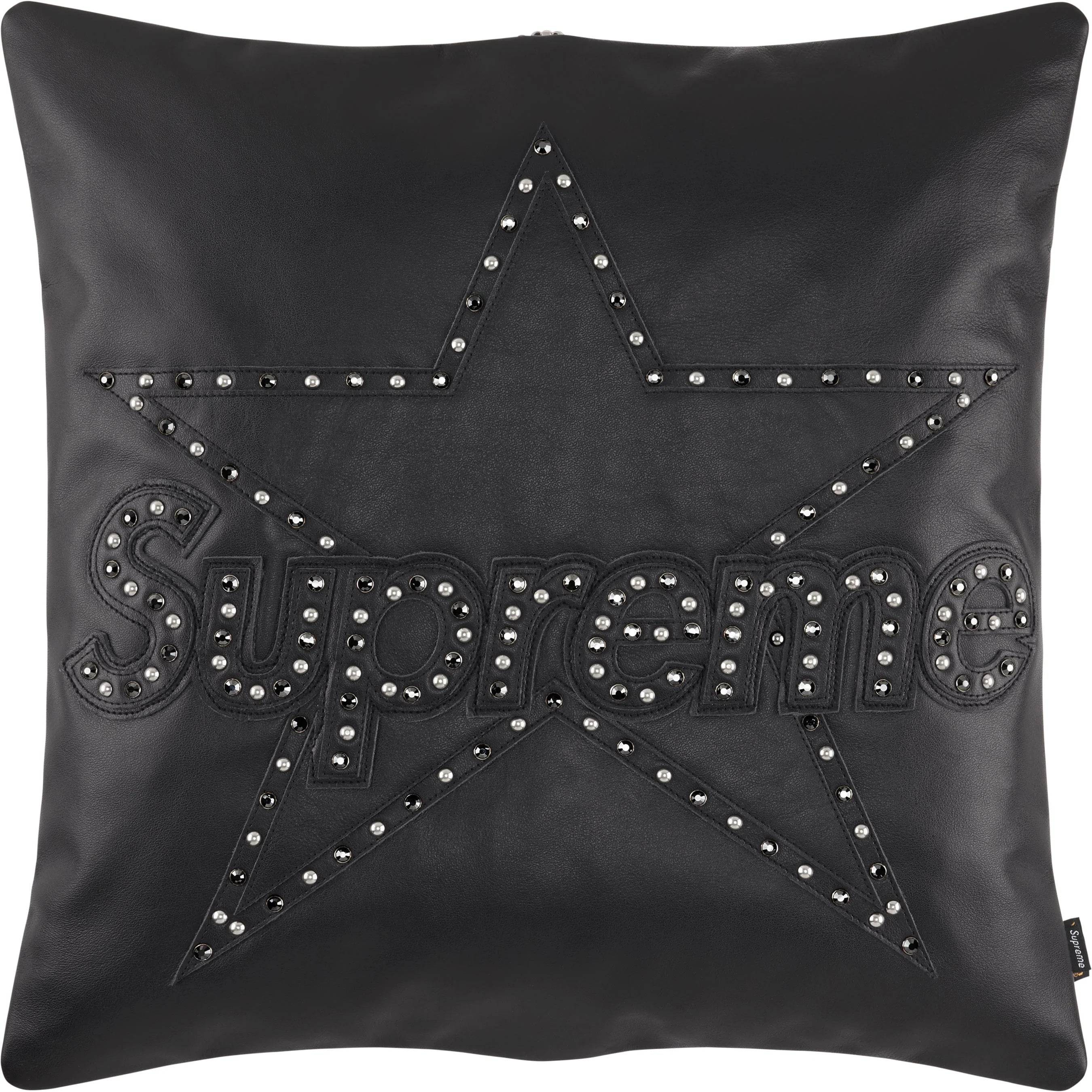 Vanson Leathers® pillow with rhinestone and metal studded logo appliqué on front. Embroidered logo patch on back. 20" x 6.5" x 20". Made in the USA exclusively for Supreme.