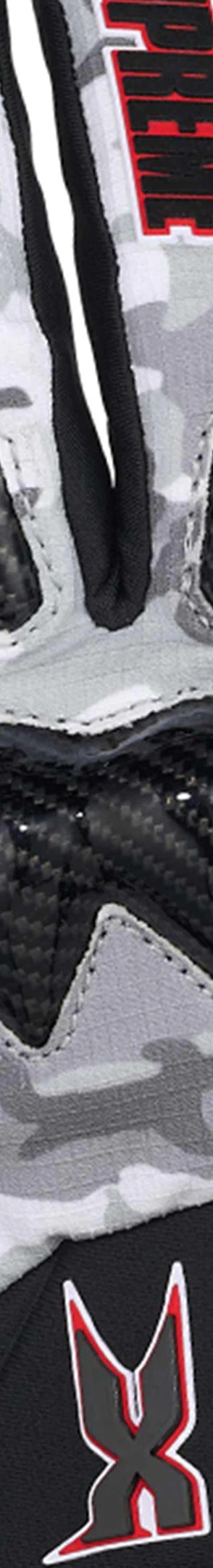 Fox Racing® Ripstop Bomber Gloves with custom graphic application. Stretch nylon construction with molded plastic knuckle and finger coverage. Compression molded neoprene cuff with hook and loop closure. Padded double-layer palm with touchscreen compatibility. TPU logos at top. Made exclusively for Supreme.