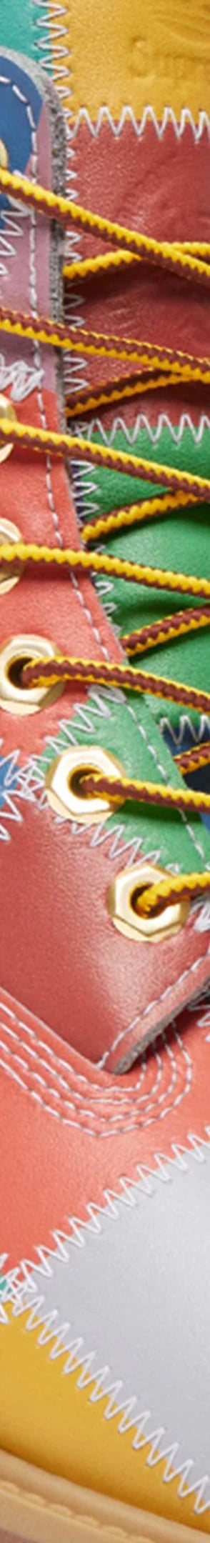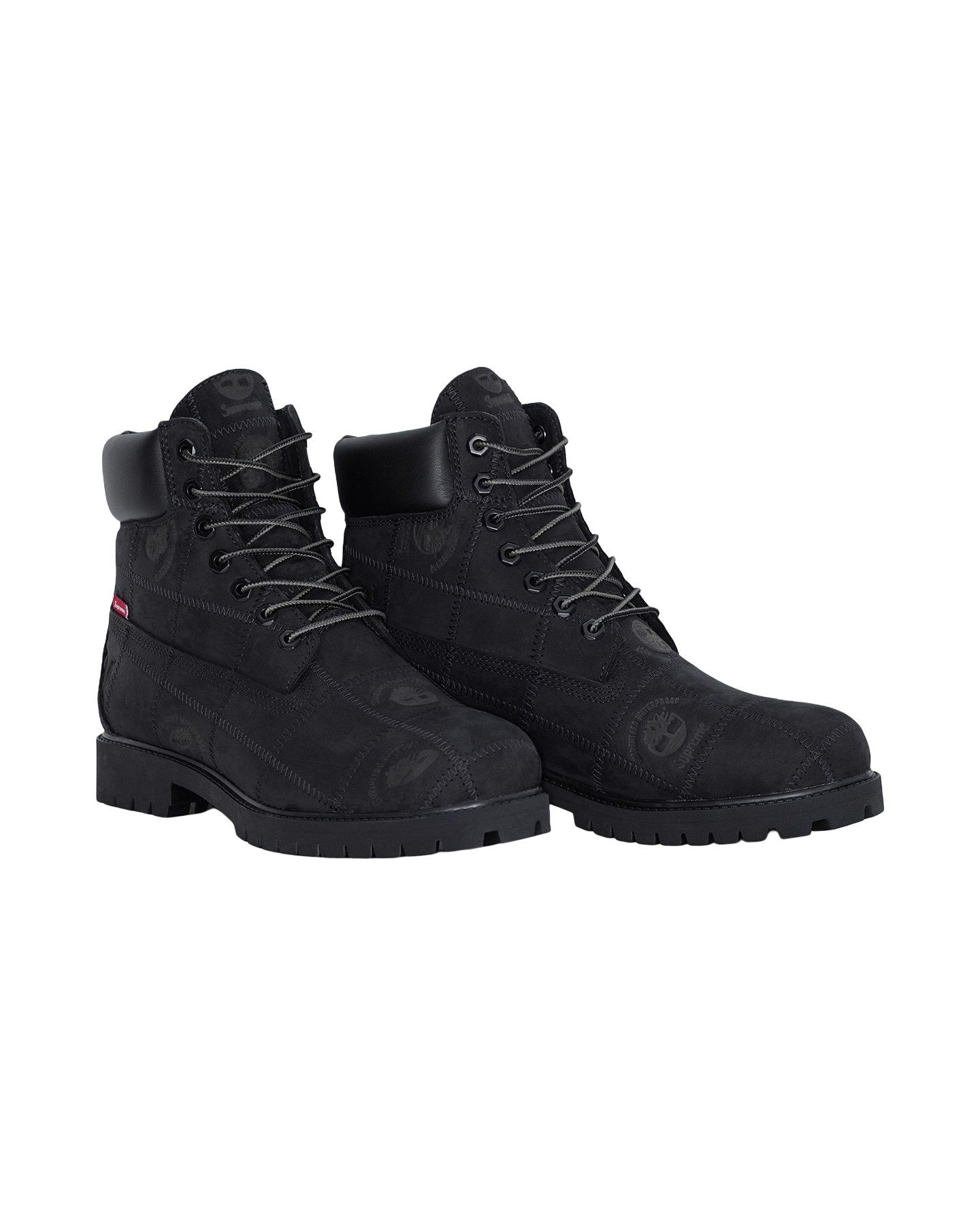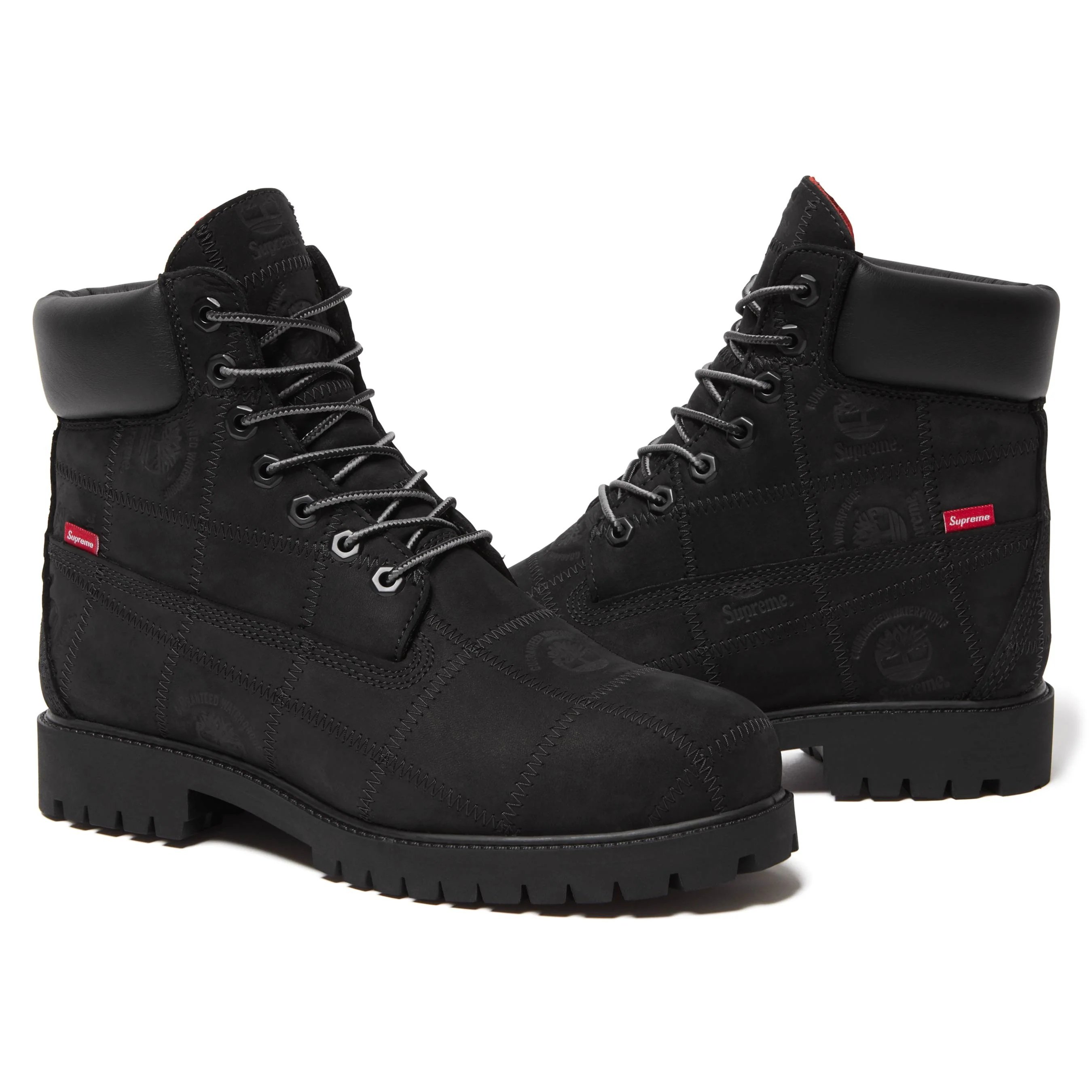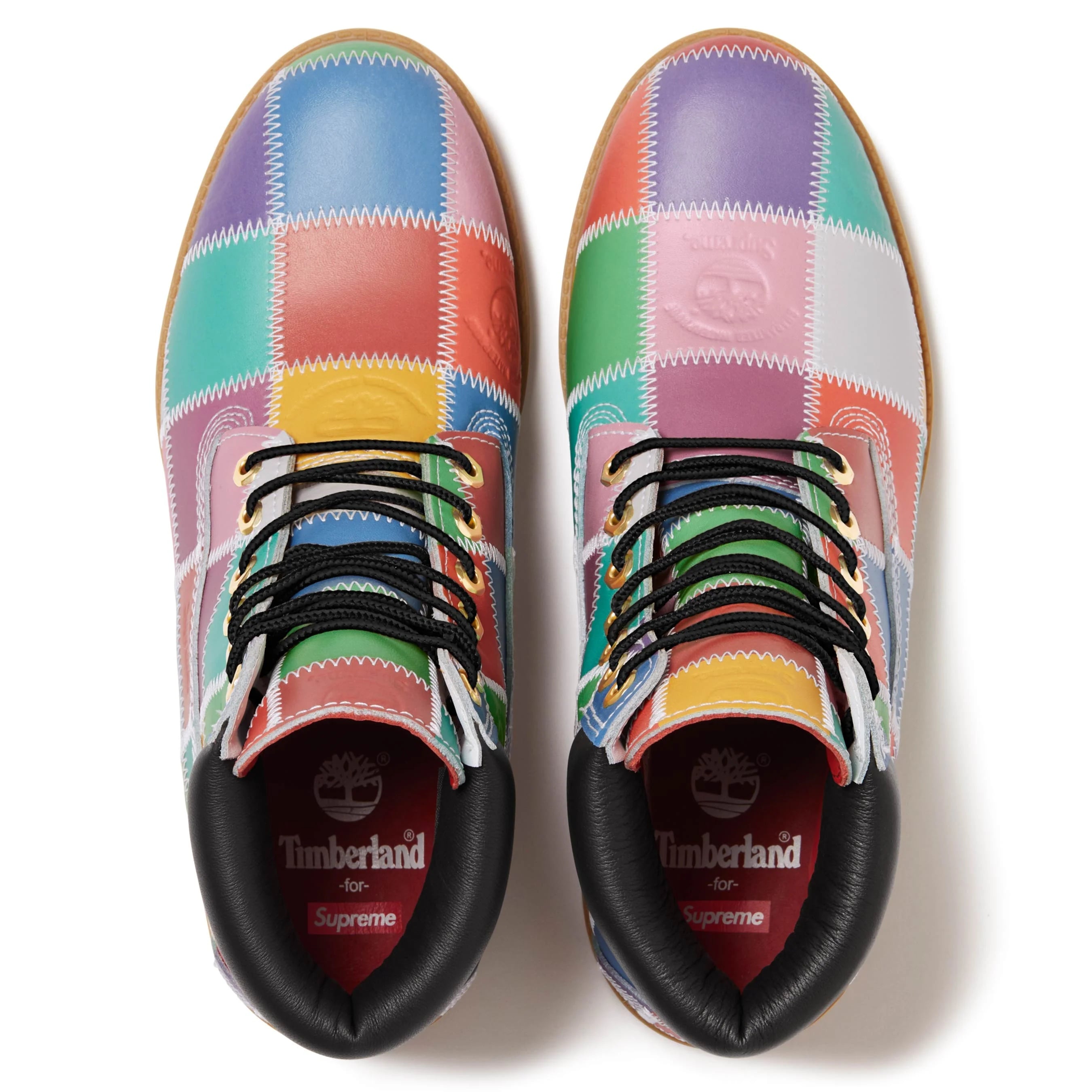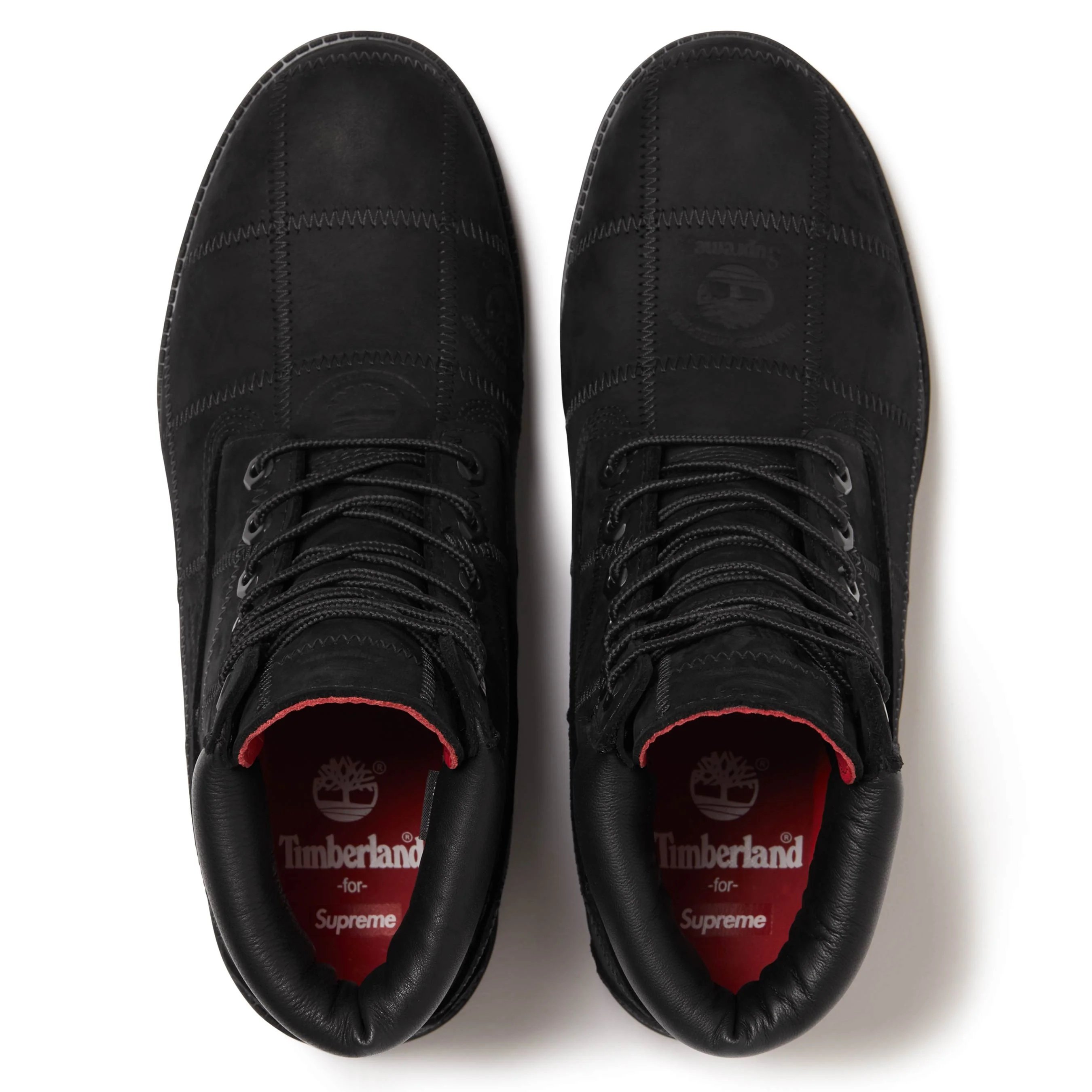 Waterproof premium nubuck with debossed logo patchwork pattern. Padded leather collar with rubber outsoles. Debossed Timberland® logo at heel with logo tab at side. Made exclusively for Supreme.