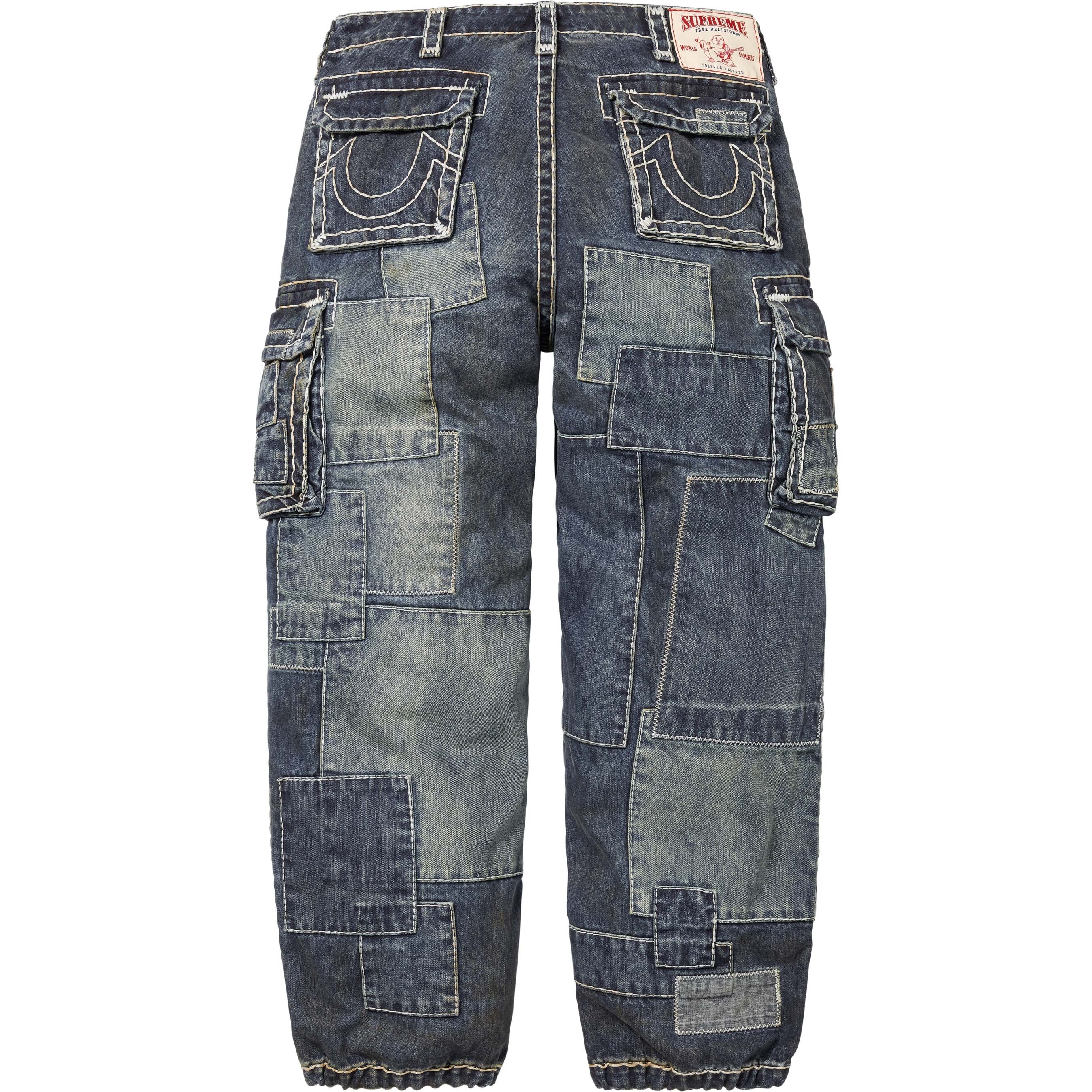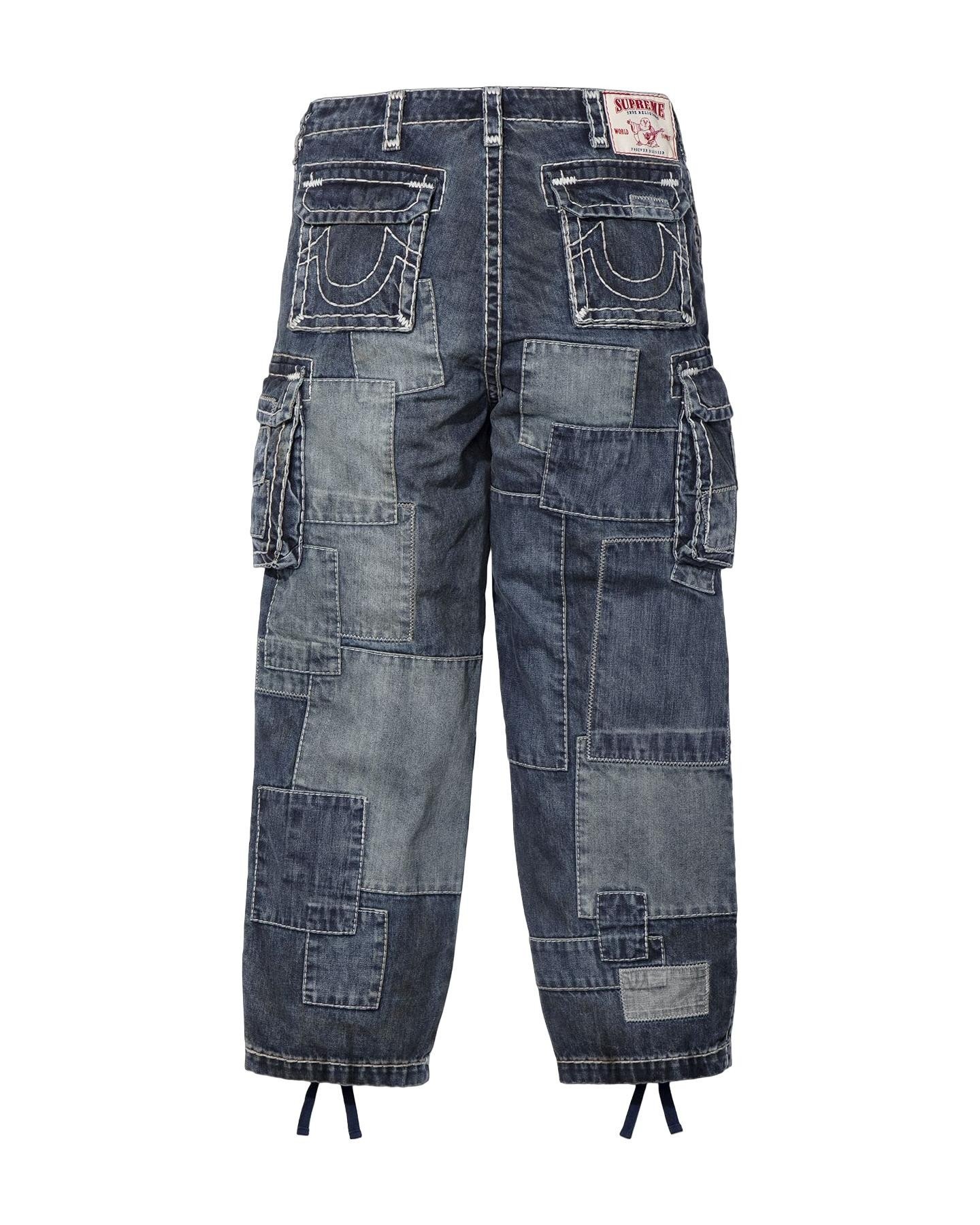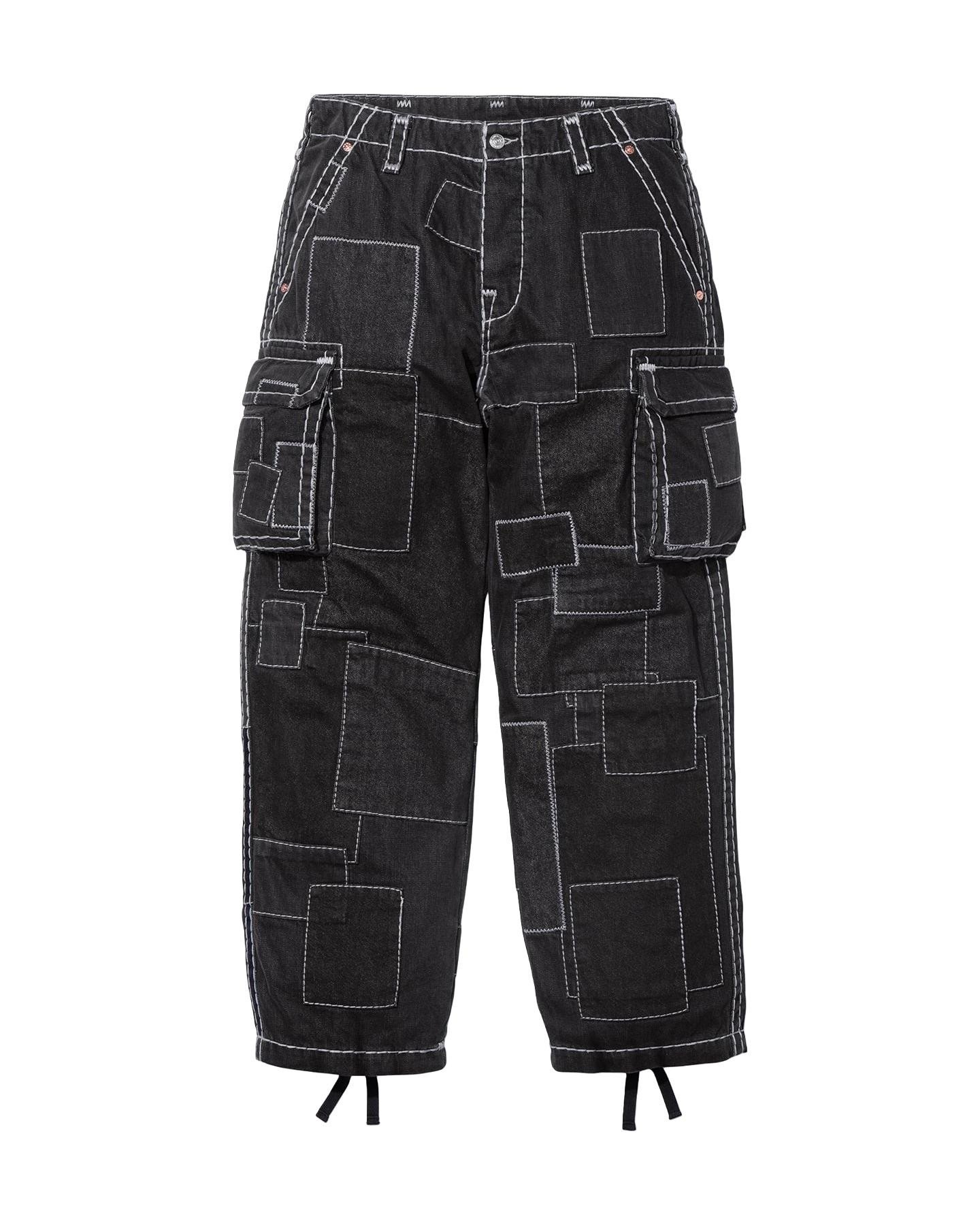 All cotton 12 oz. denim with patchwork pattern and Super T stitch. Slanted front pockets, and snap flap cargo pockets at seat and thighs. Button fly closure and drawstring at cuffs. Woven logo label at back hem. Made exclusively for Supreme.