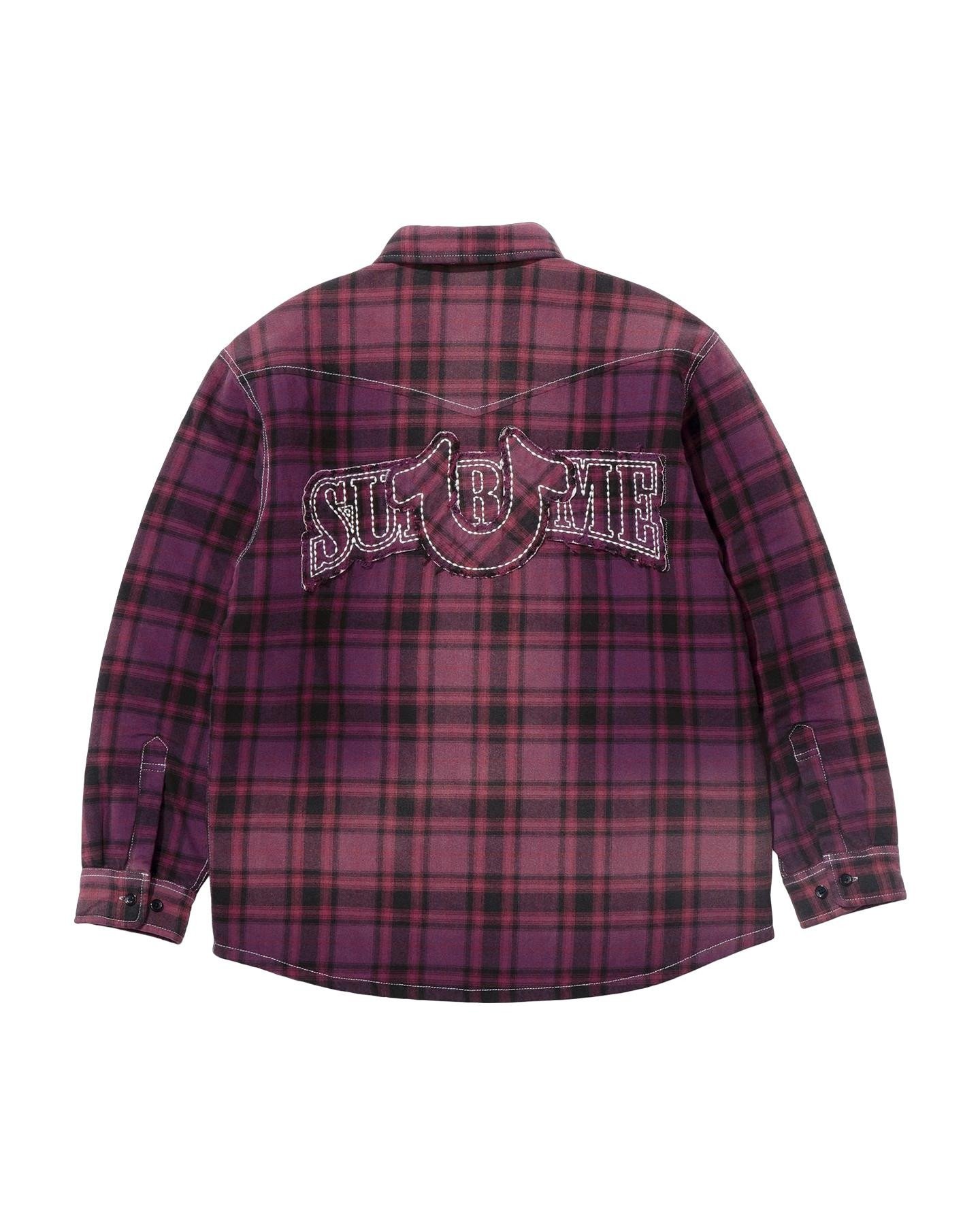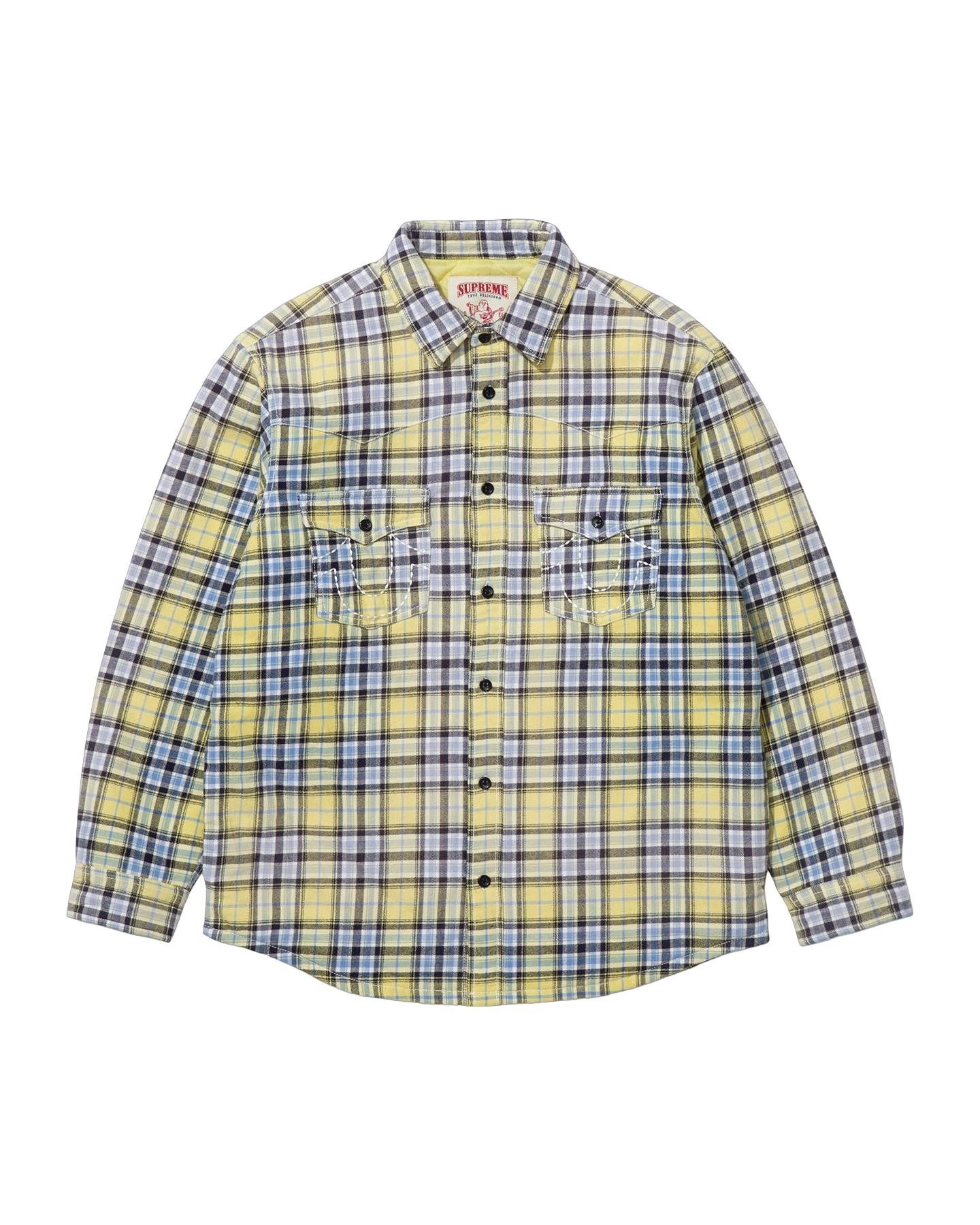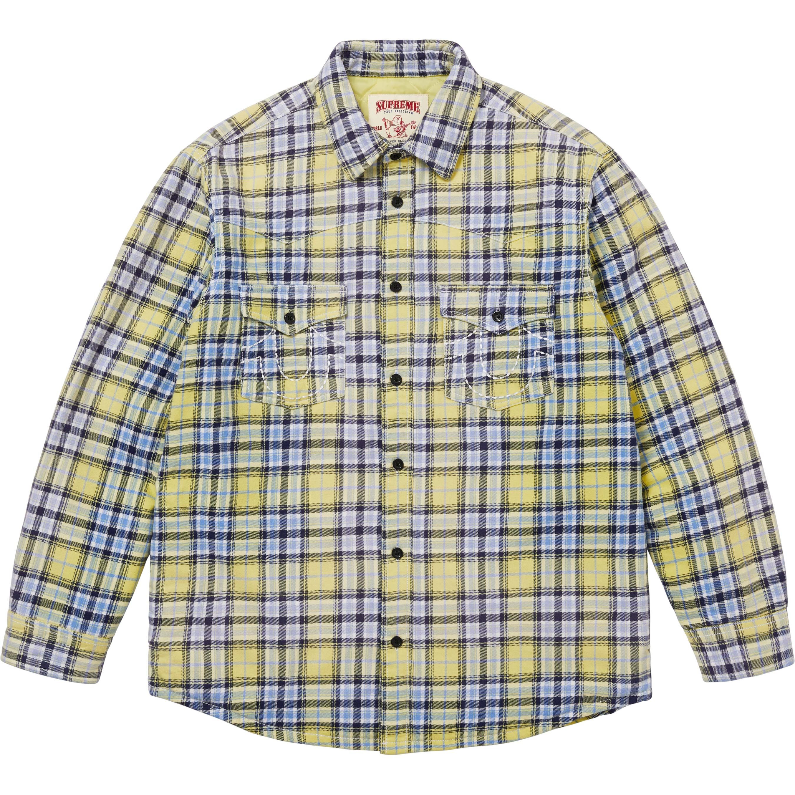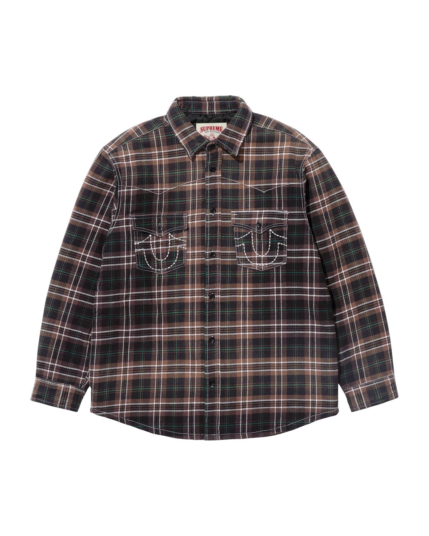 All cotton flannel with Big T stitch, fill and quilted taffeta lining. On seam hand pockets at lower front and button flap patch pockets at chest. Big T stitch graphic at pockets and logo appliqué at back. Made exclusively for Supreme.