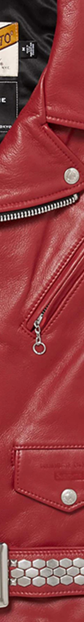 Custom fit Schott® Perfecto leather jacket with full satin lining. Full zip closure with zip hand pockets and zip chest pocket. Snap flap pocket at lower front and interior chest pocket. Studded belted front and zip openings at cuffs. Debossed logos on pocket flap and printed graphic on back. Enamel logo pin included. Made in the USA exclusively for Supreme.