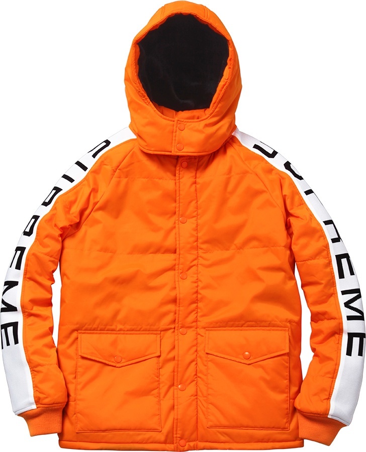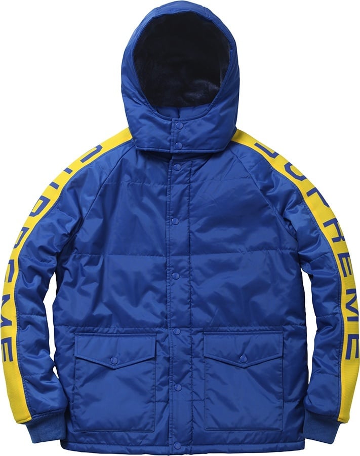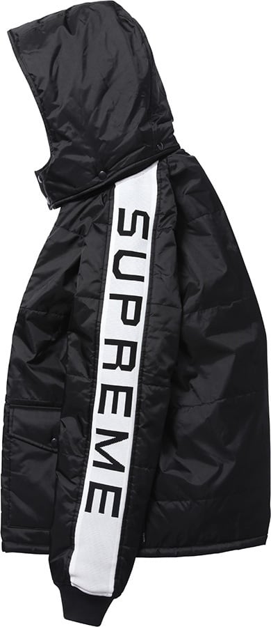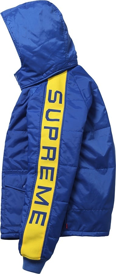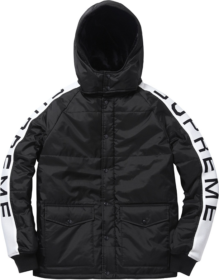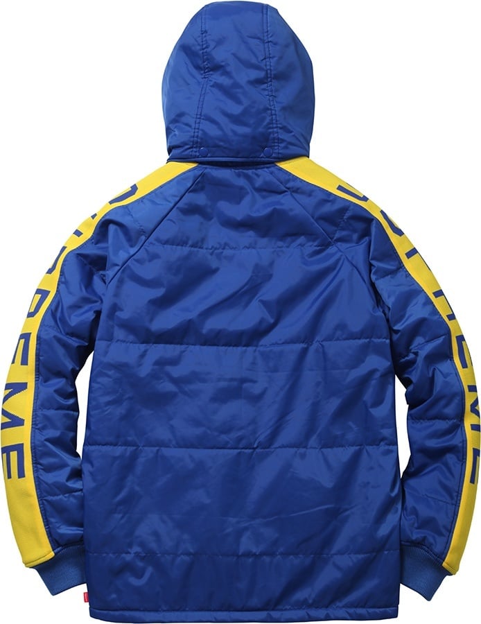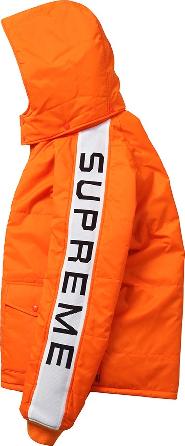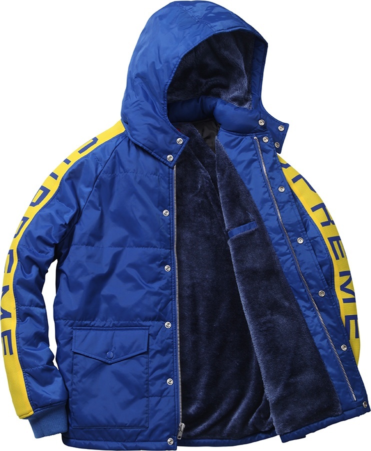 Quilted nylon with pile lining. Knit in logo on sleeves with removable hood.
