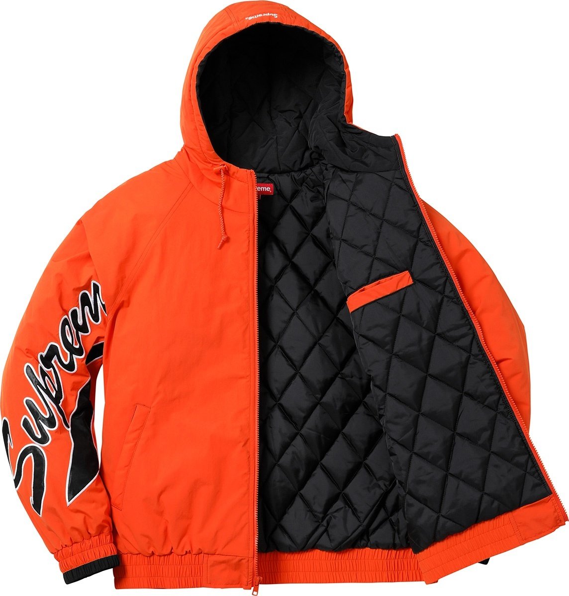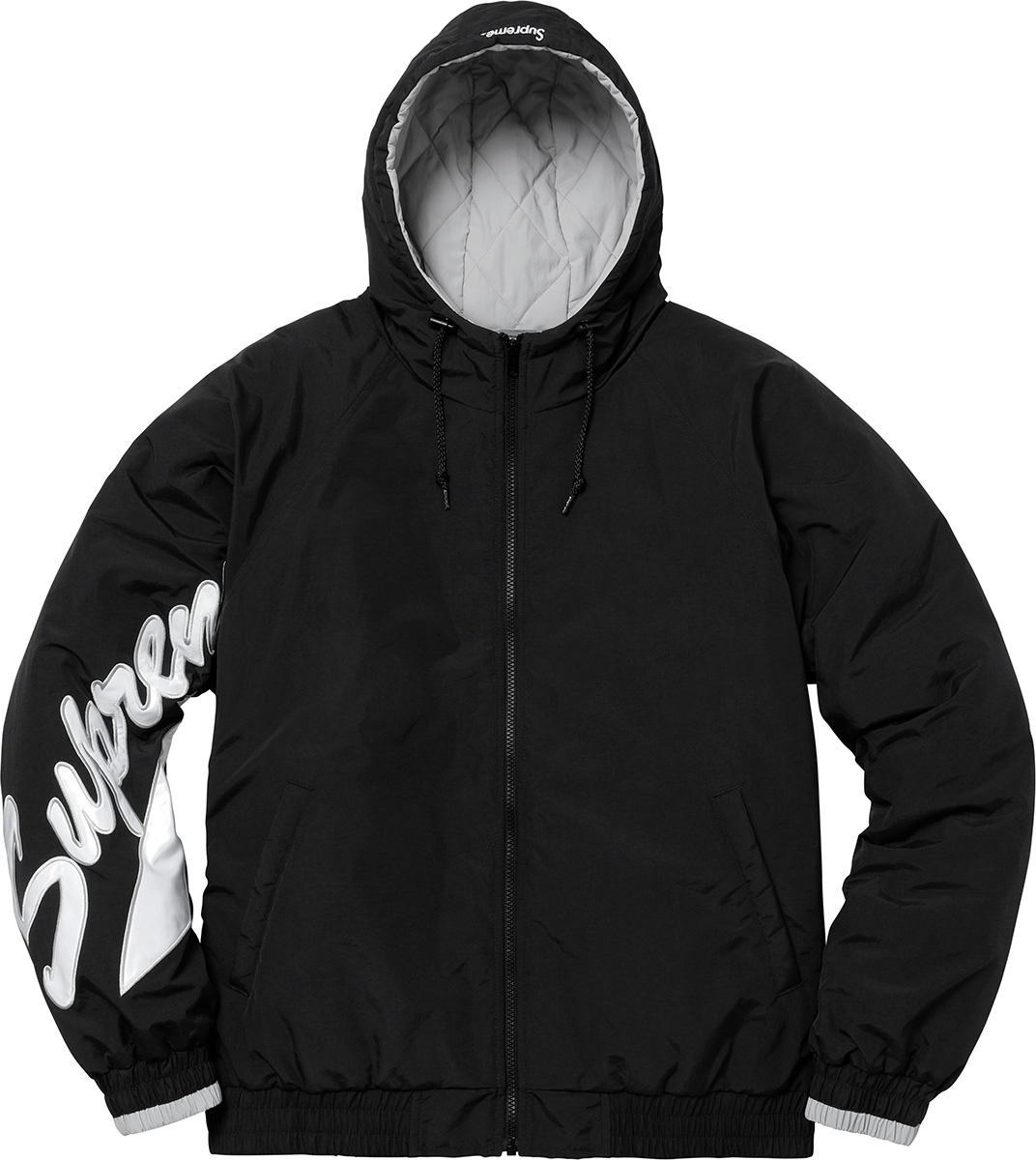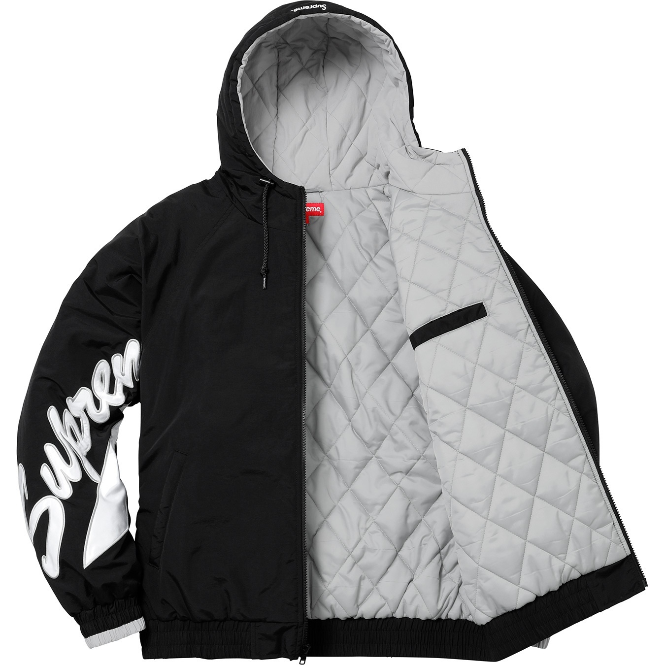 Water resistant nylon taslan with quilted lining and satin appliqué logo on sleeve.