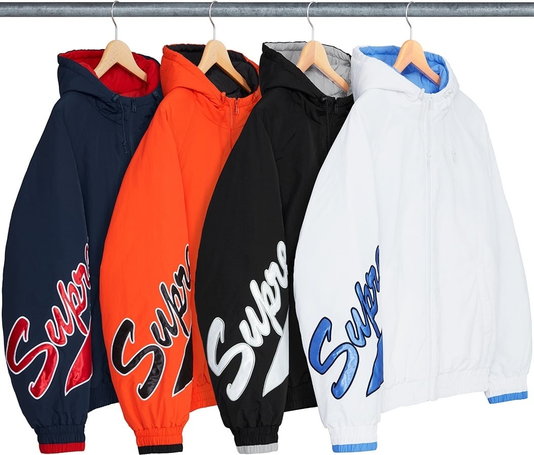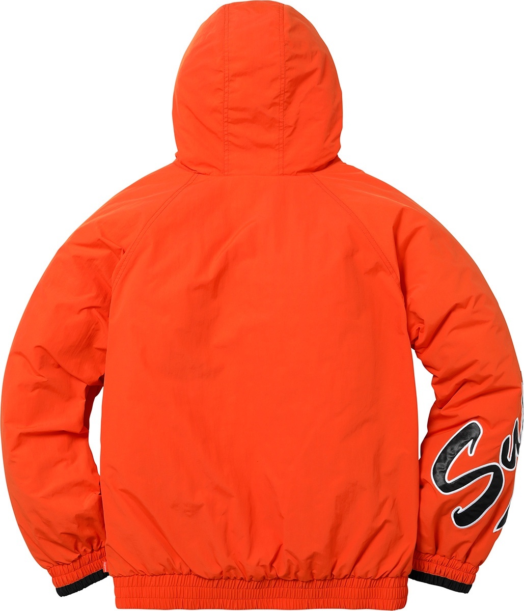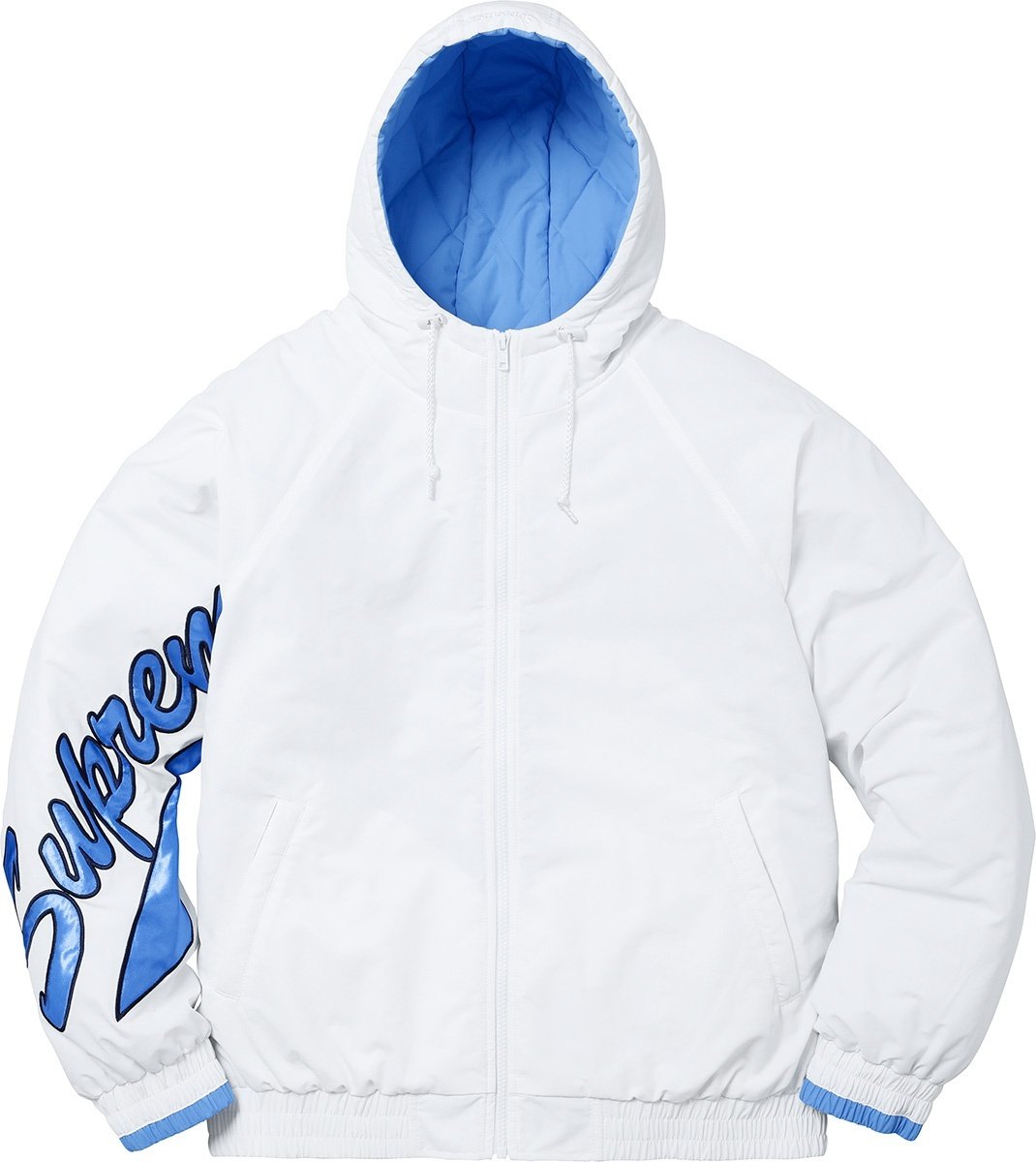 Water resistant nylon taslan with quilted lining and satin appliqué logo on sleeve.