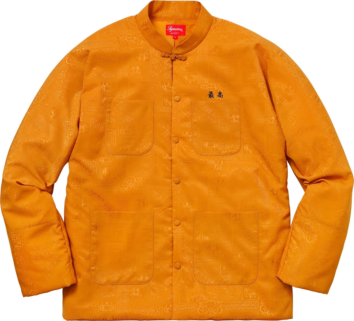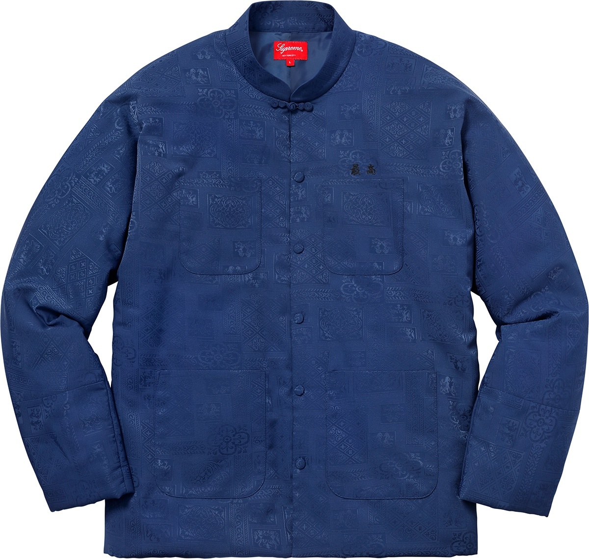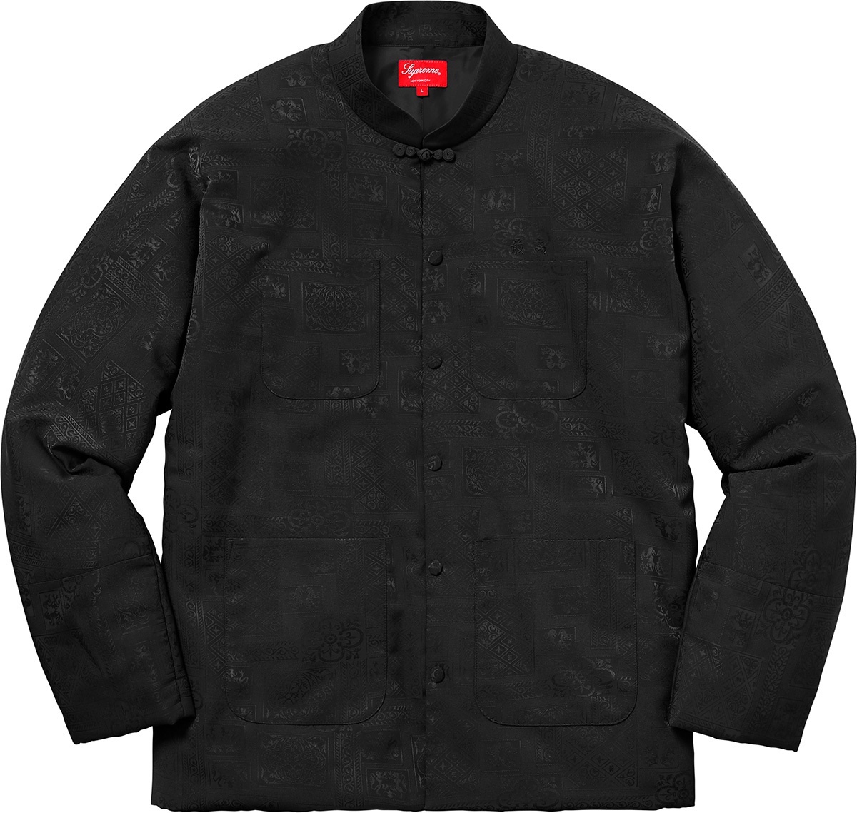 Poly jacquard with padded taffeta lining and snap front closure. Patch pockets on chest and lower front. Embroidered graphic on chest.
