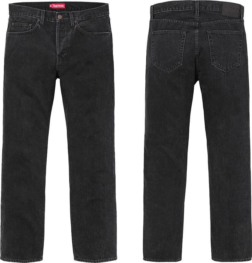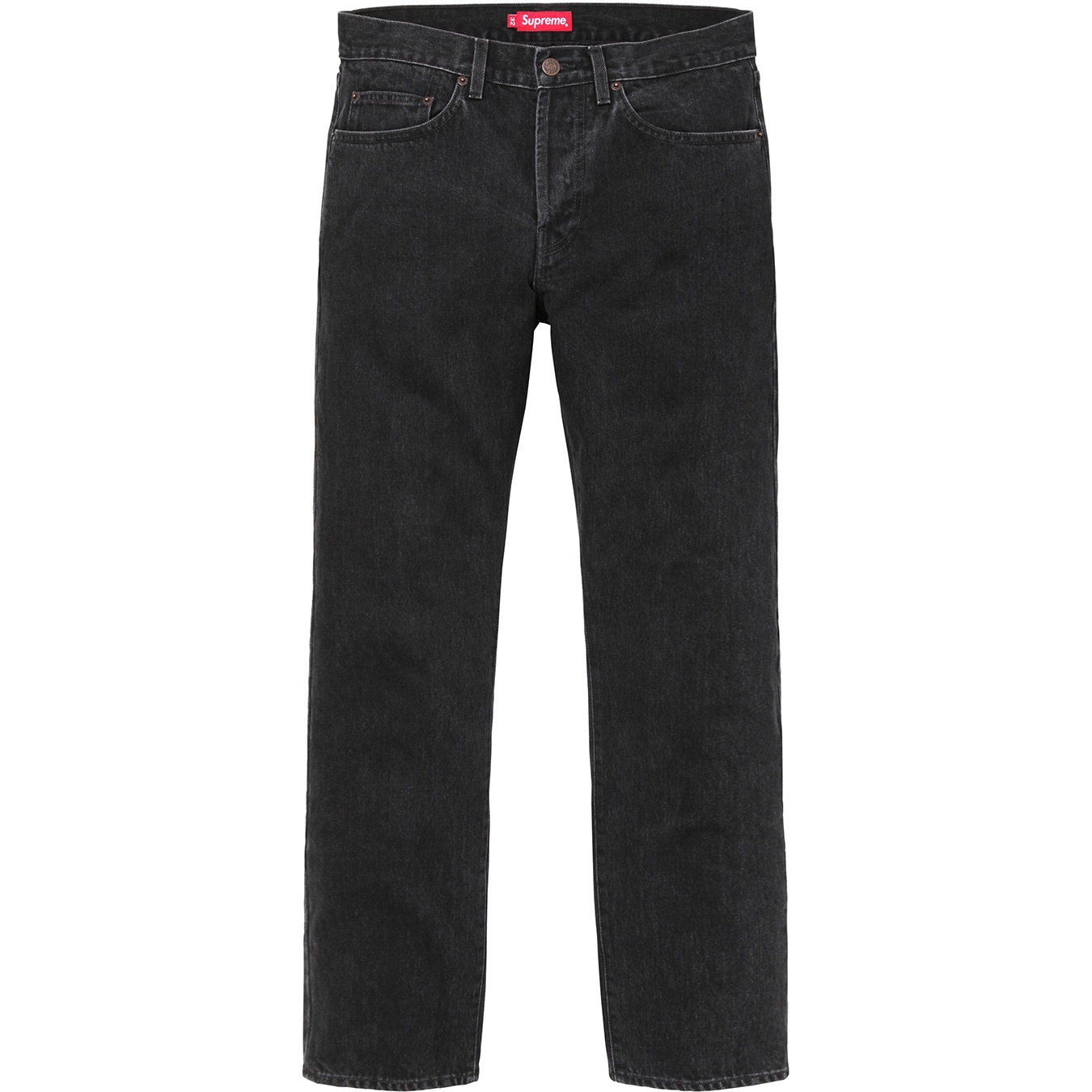 All cotton 14 oz. denim with stone wash. Classic 5-pocket style with black leather patch on back.