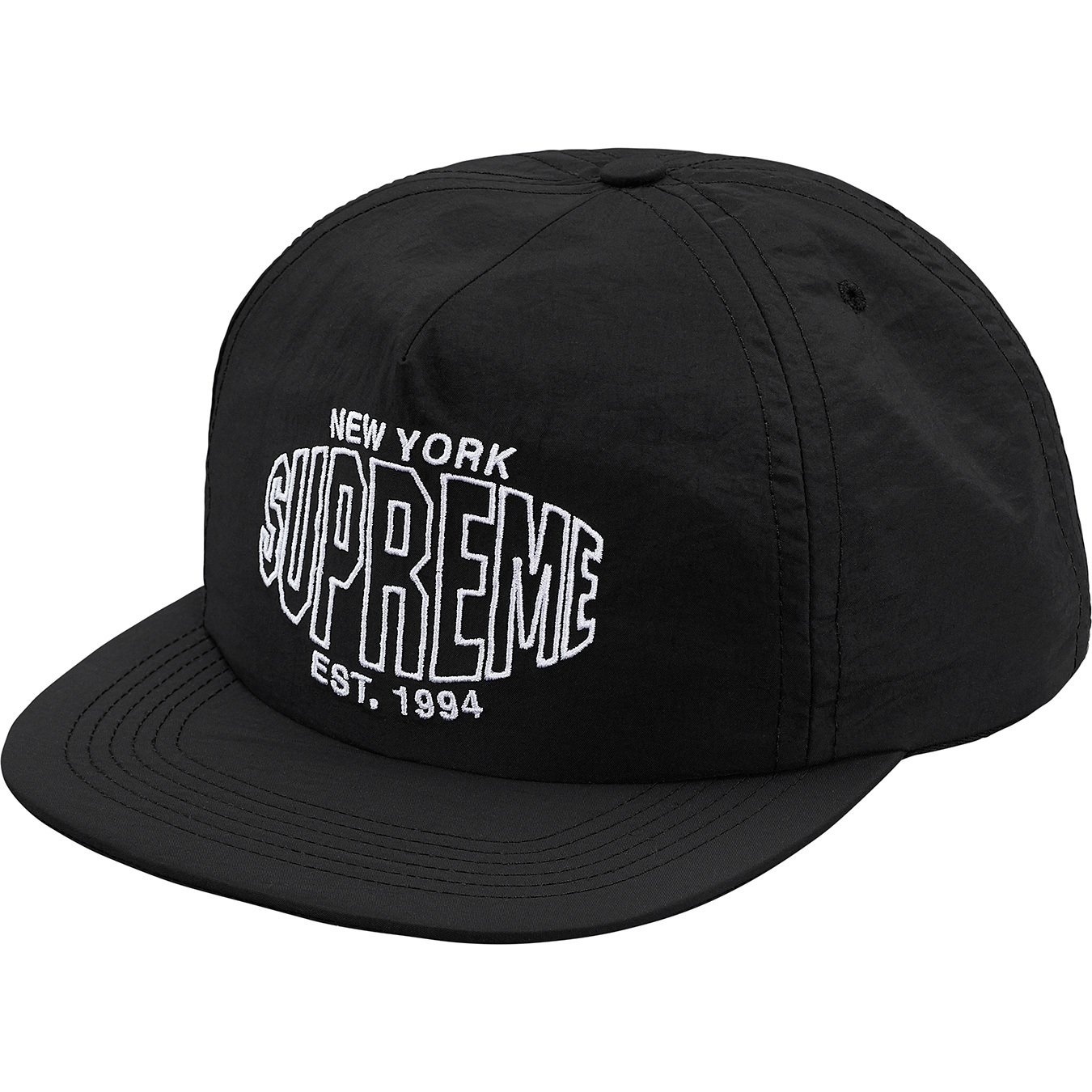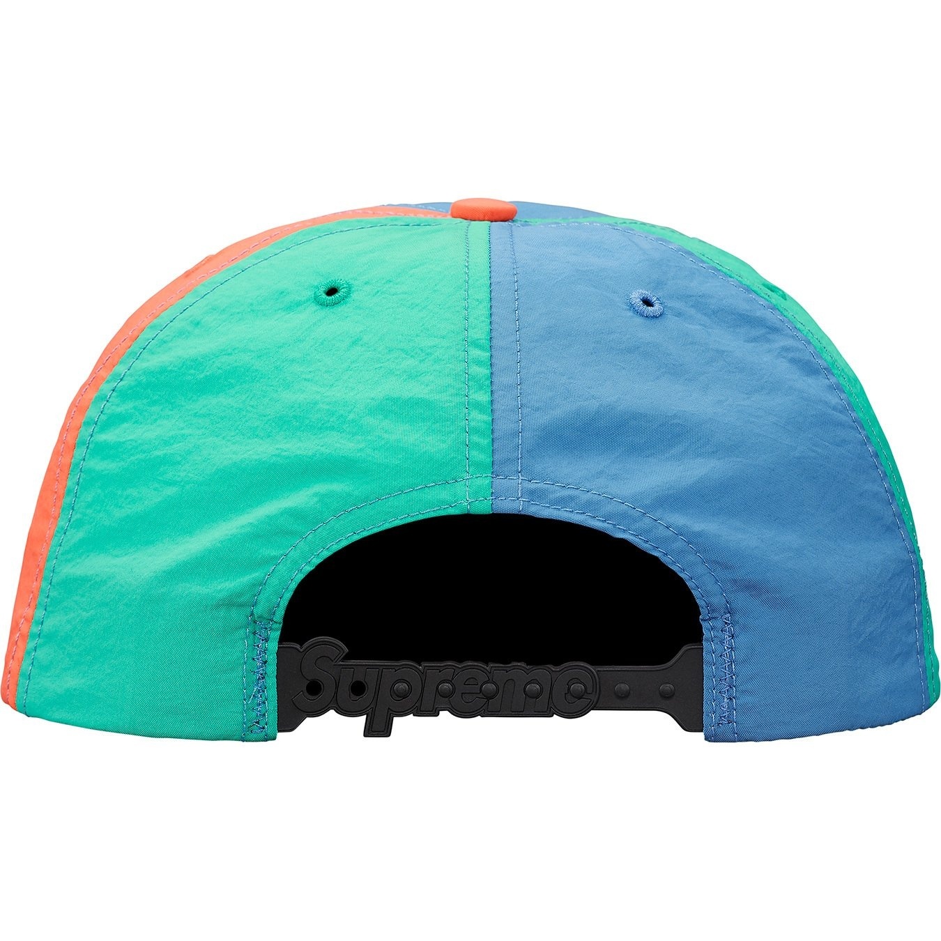 Nylon 5-Panel hat with custom logo snap closure and embroidered logo on front.