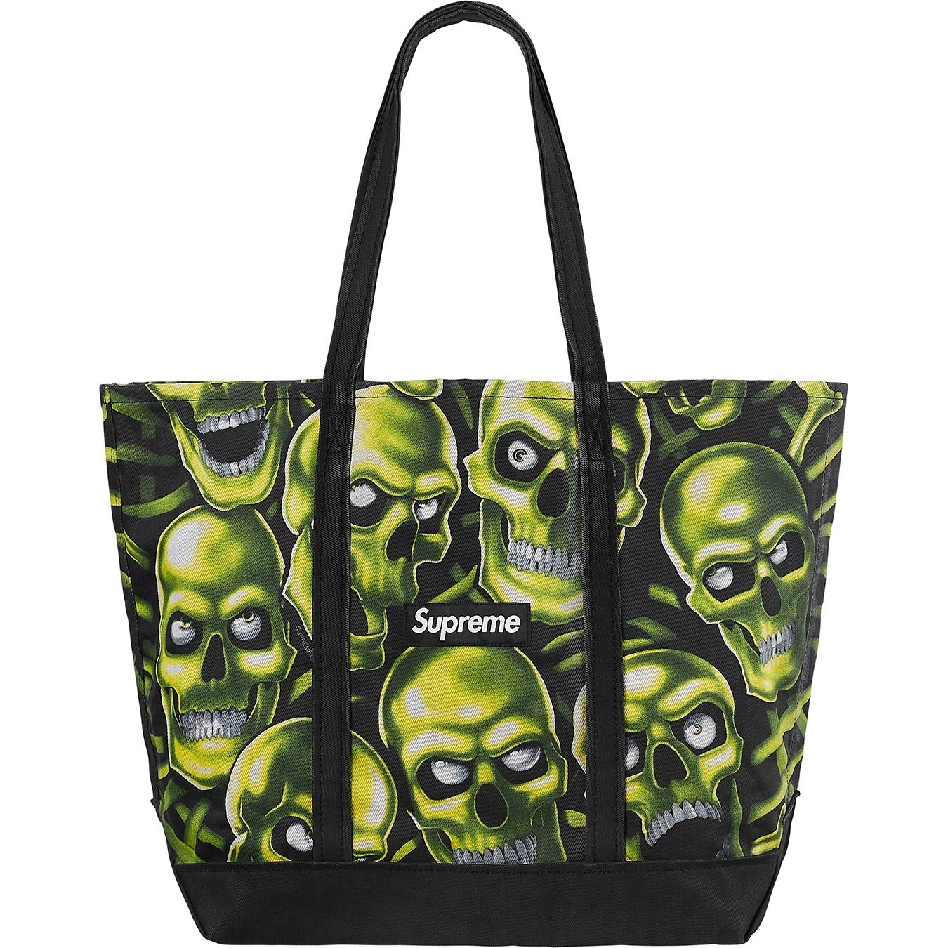 All cotton 13.75 oz. denim with Liquid Blue© Skull Pile printed pattern and solid bottom panel and straps. Logo label patch at center. 19.5" x 7" x 14".