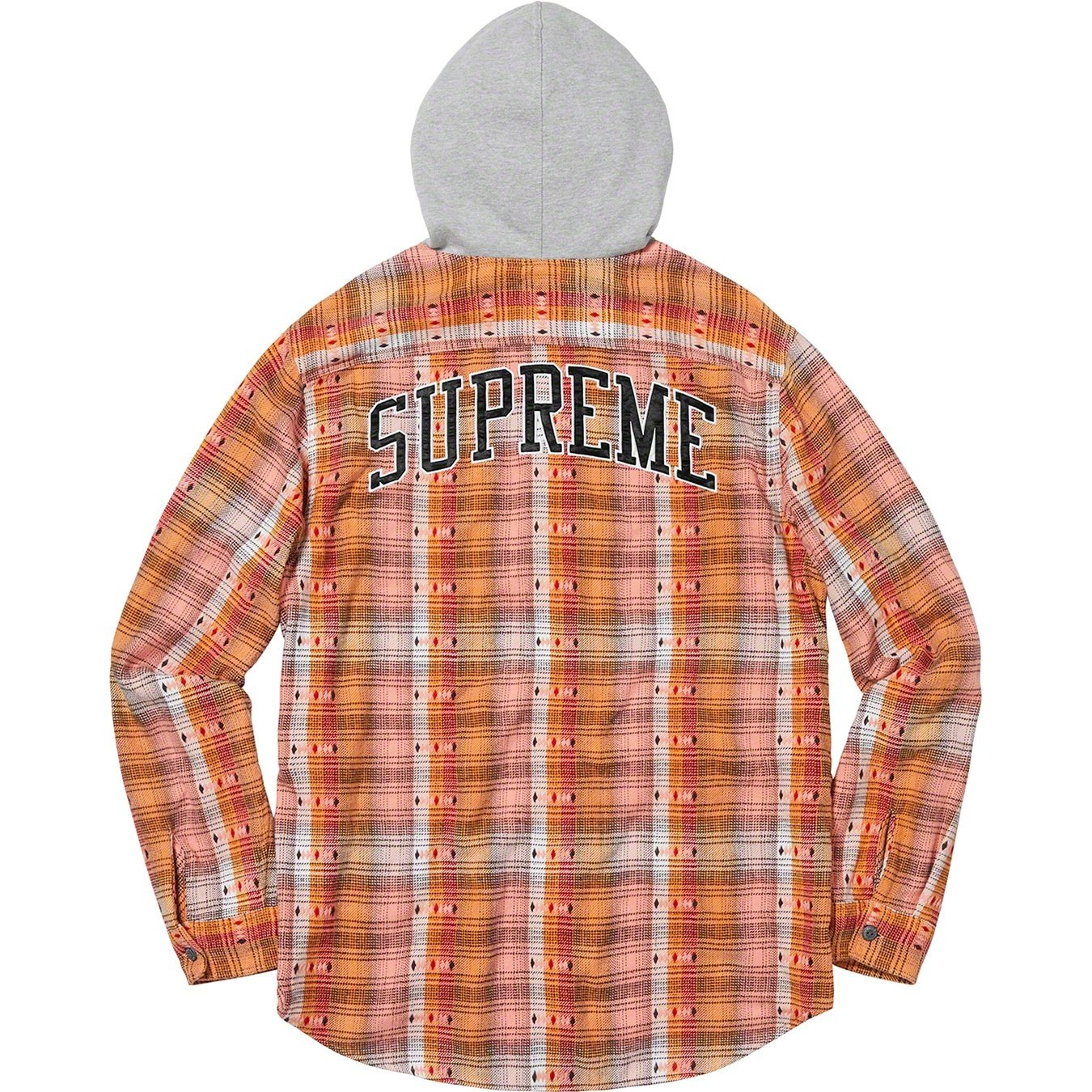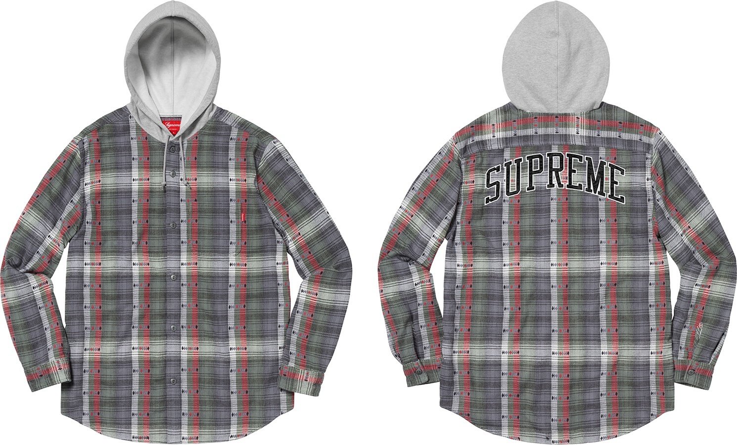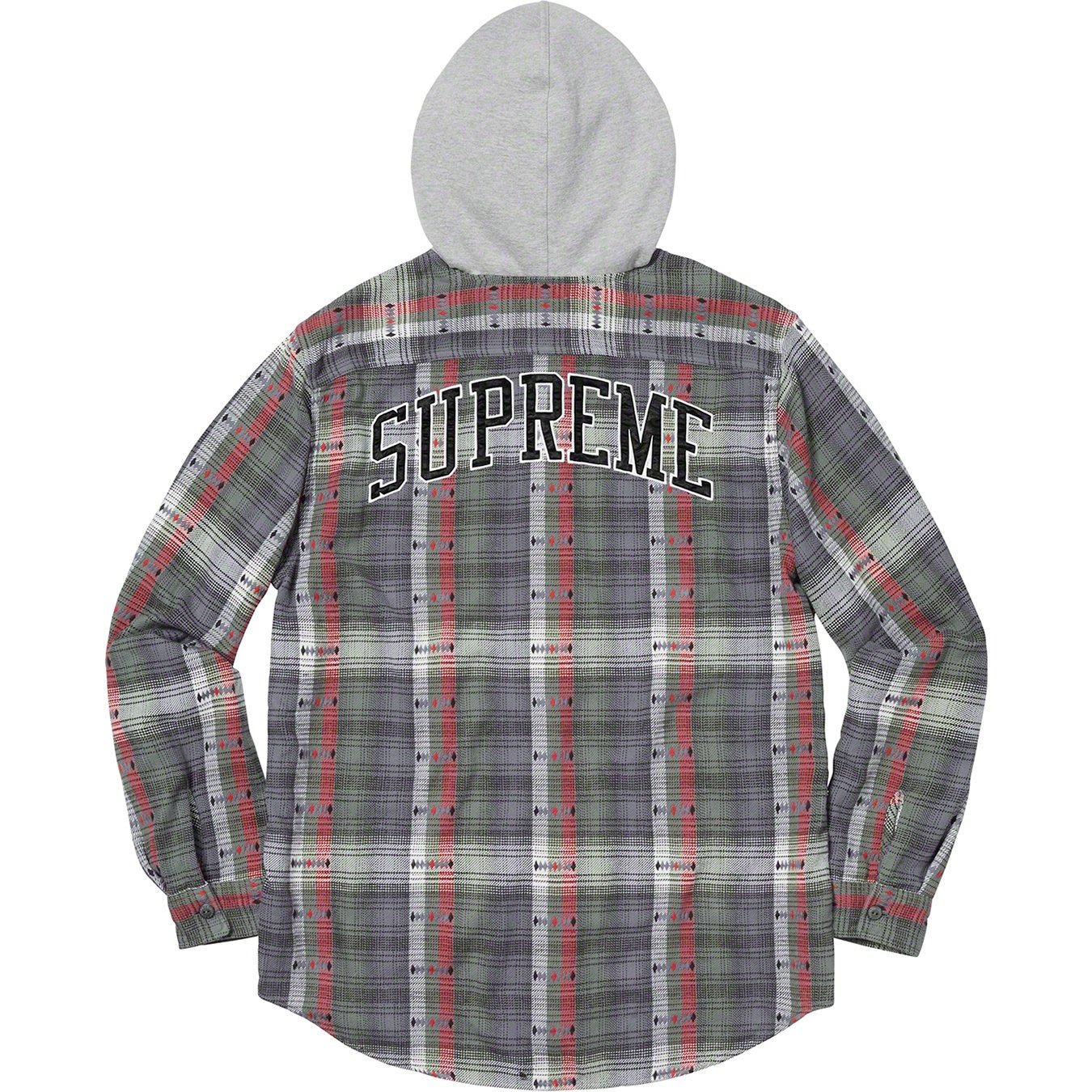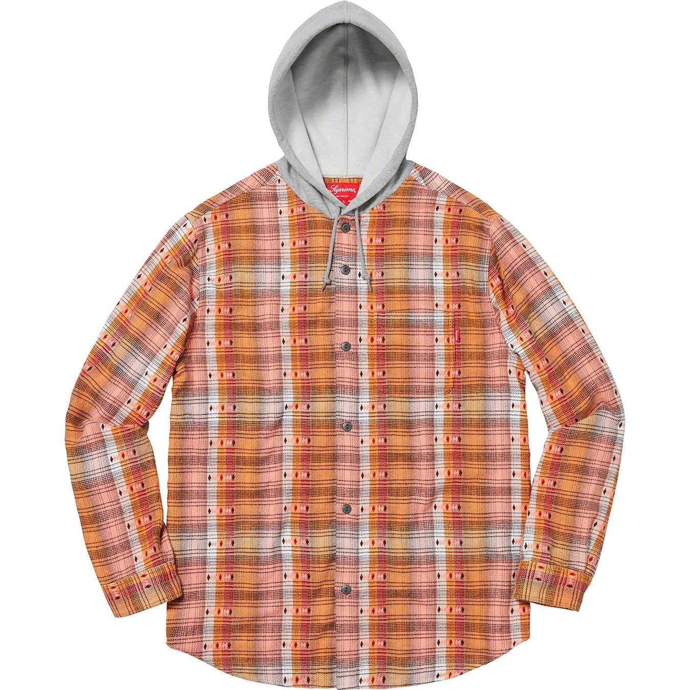 All cotton flannel with cotton fleece hood. Single chest pocket and satin appliqué logo on back.