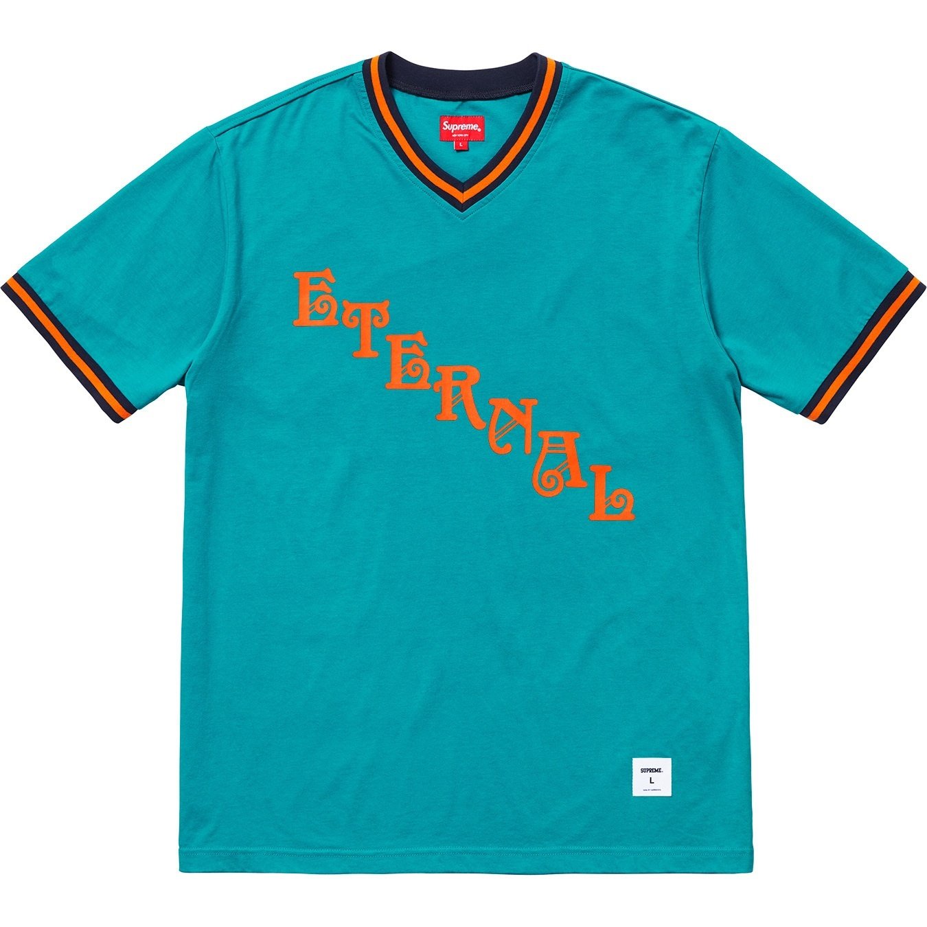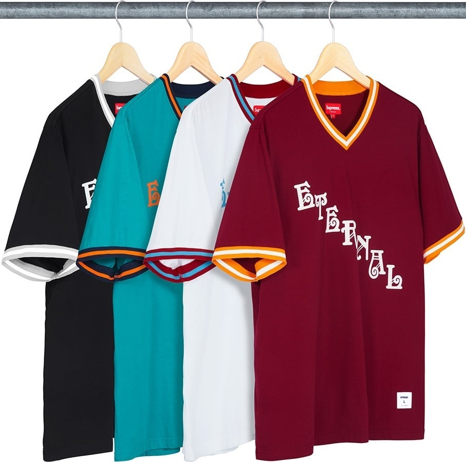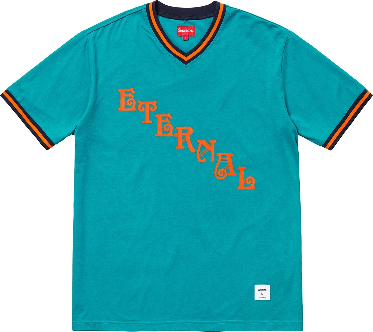Cotton jersey blend V-neck with stripe rib collar and sleeve. Printed graphic on front and back with athletic label at lower front.